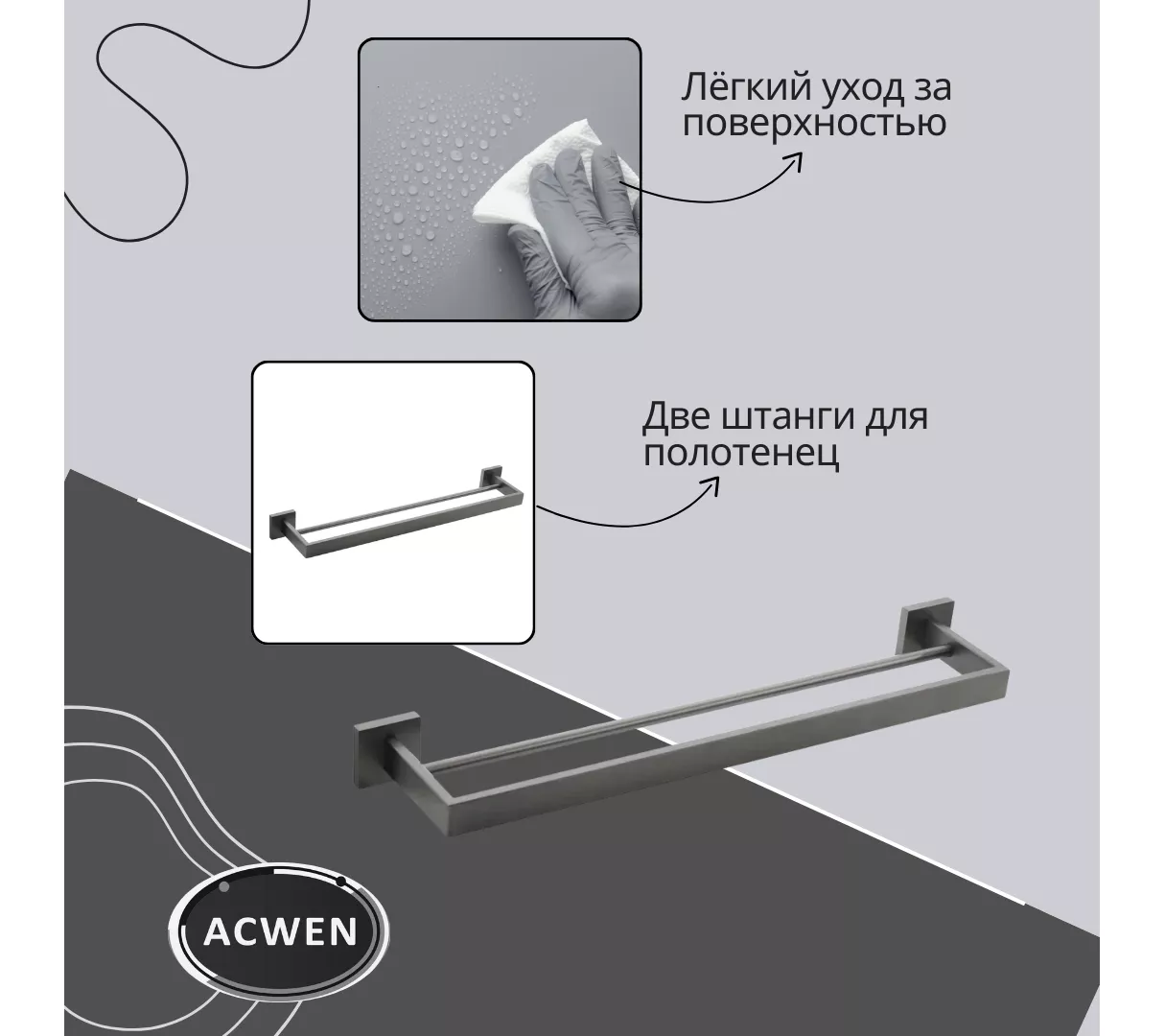 Держатель для полотенец двойной от ACWEN выполнен из высококачественной нержавеющей стали, обеспечивая долговечность и устойчивость к коррозии даже в условиях повышенной влажности. Серый цвет «Графит» идеально впишется в любой интерьер, добавляя стильного контраста и современного дизайна. Компактная конструкция позволяет удобно разместить два полотенца или другие принадлежности, освобождая пространство в ванной комнате.