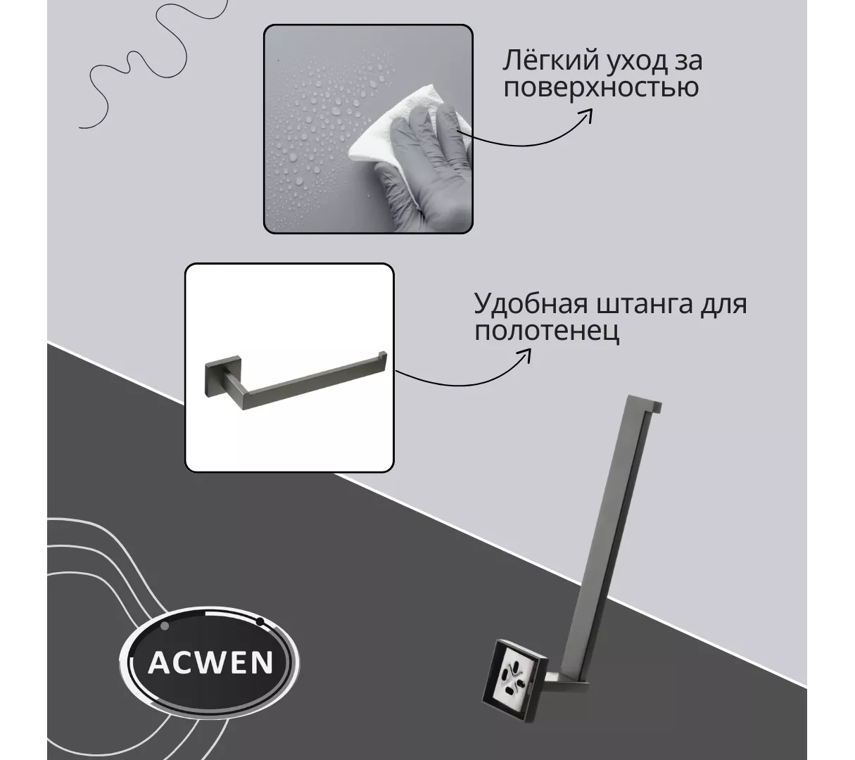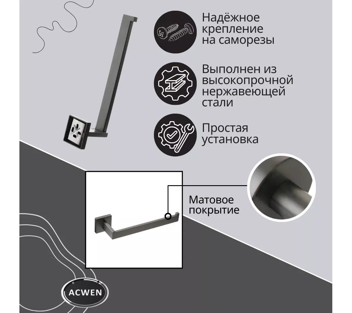 1. Держатель для полотенец2. Корпус SUS3043. цвет графит4. С монтажными принадлежностями