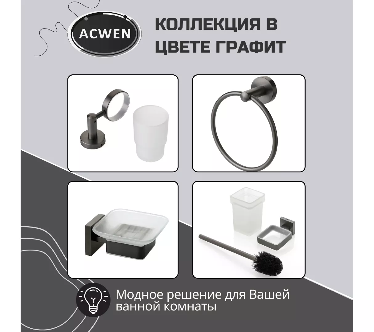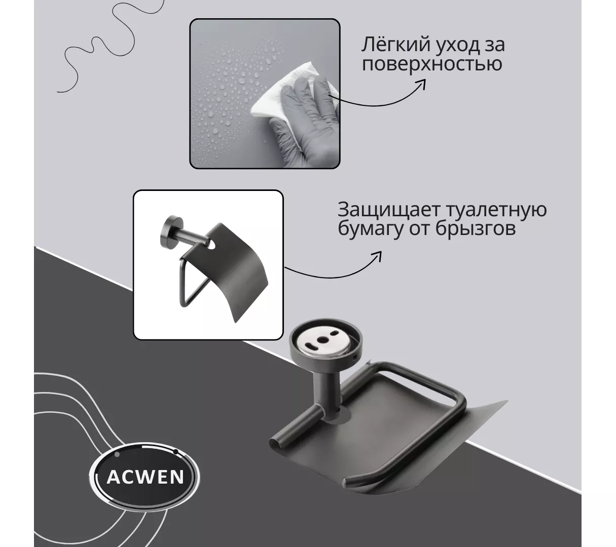Держатель для туалетной бумаги ACWEN в графитовом исполнении сочетает современный дизайн и функциональность. Изготовлен из прочного материала, который обеспечивает долговечность даже при интенсивном использовании. Компактная конструкция легко монтируется на стену и удерживает рулоны различных размеров без скольжения.
