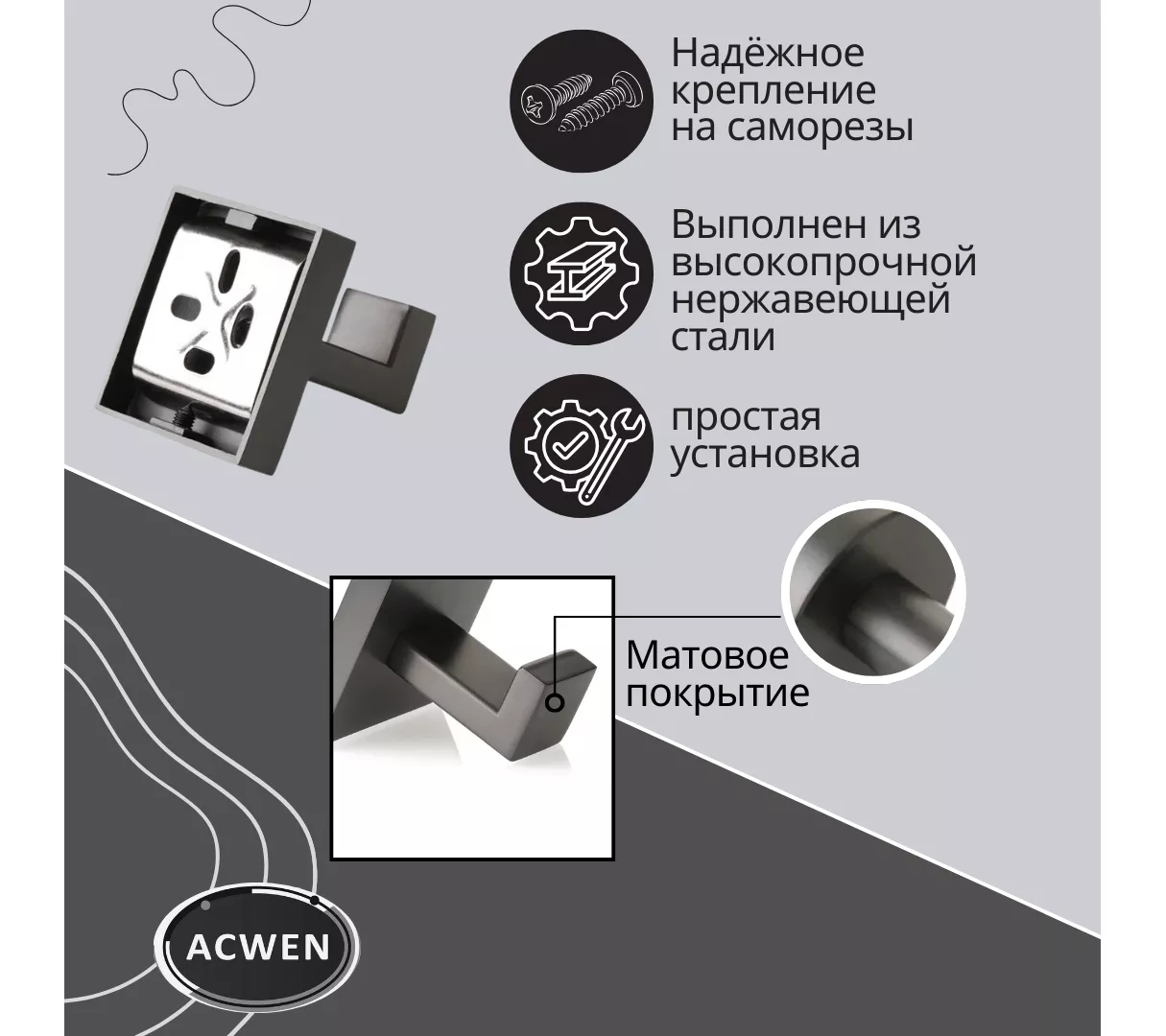 Крючок для полотенец Графит ACWEN SS84606GGS- Изготовлен из прочной нержавеющей стали, обеспечивает долгий срок службы даже в условиях повышенной влажности- Компактный настенный формат идеально вписывается в любую ванную комнату, освобождает пространство- Современный графитовый цвет сочетается с классическими и минималистичными интерьерами- Простая установка и надежная фиксация обеспечивают быстрое применение без сложностей