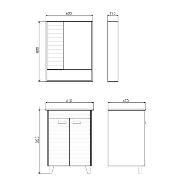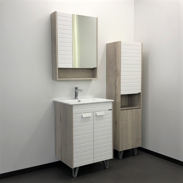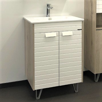 Напольная тумба-умывальник с двумя створками, оснащенными петлями с плавным закрыванием. Фасады тумбы окрашены белой матовой эмалью. На фасадах - фрезеровка горизонтальными полосами. Тумба оснащена декоративными ножками в одном стиле с ручками створок