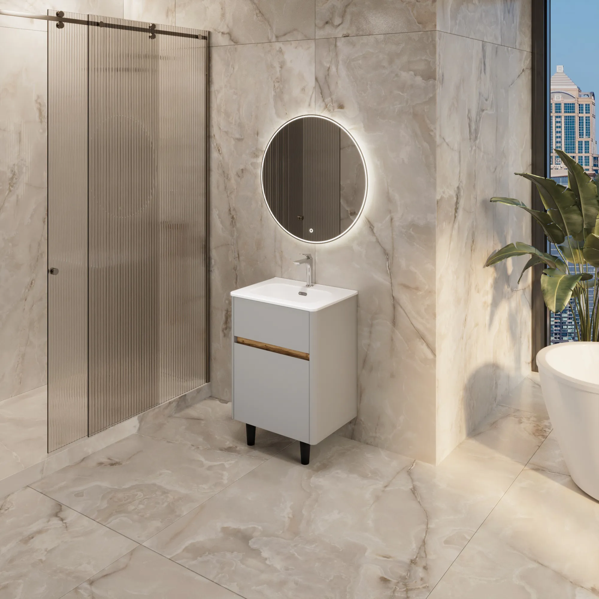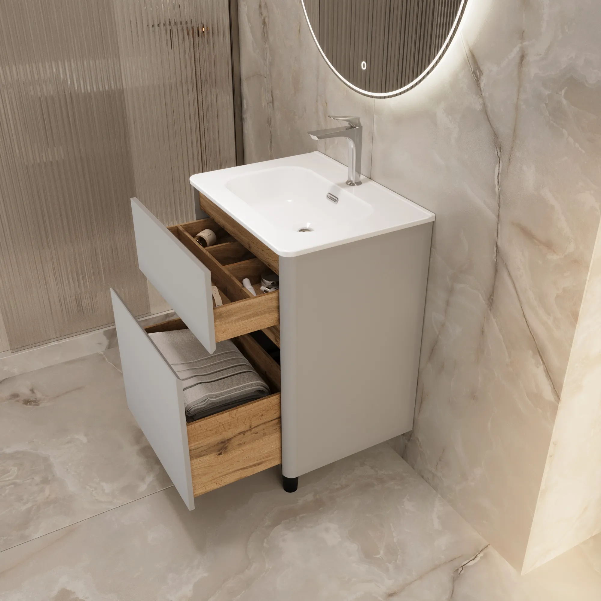 Матовый фасад, интегрированные ручки, керамическая раковина* с широкими бортами для хранения и полки в тон теплому дереву придают интерьеру изящность и подчеркивают уникальный характер.