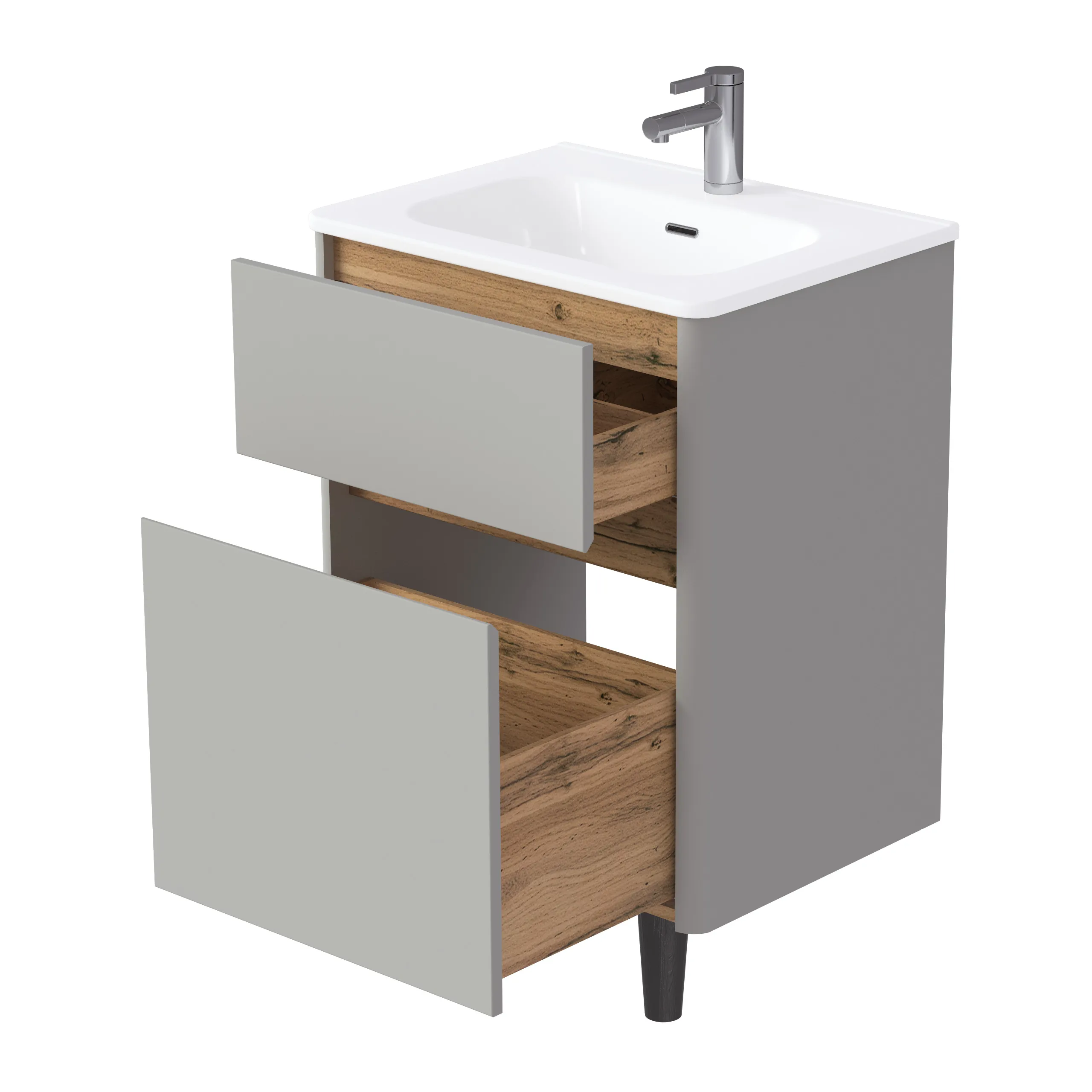 Трендовый серый цвет освежает интерьер, делая его современным и мягким, а тумбу подходящей для большинства интерьеров ванной комнаты.
