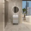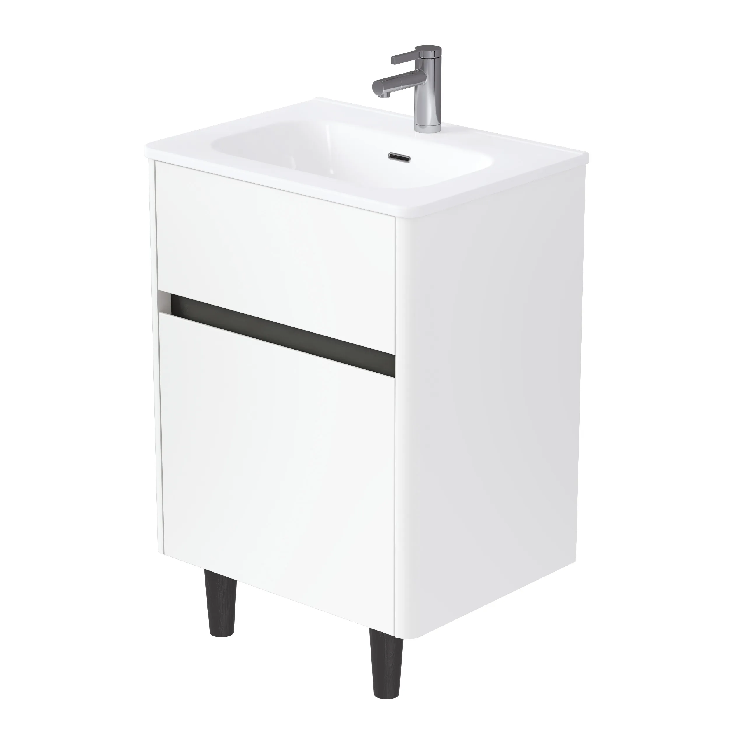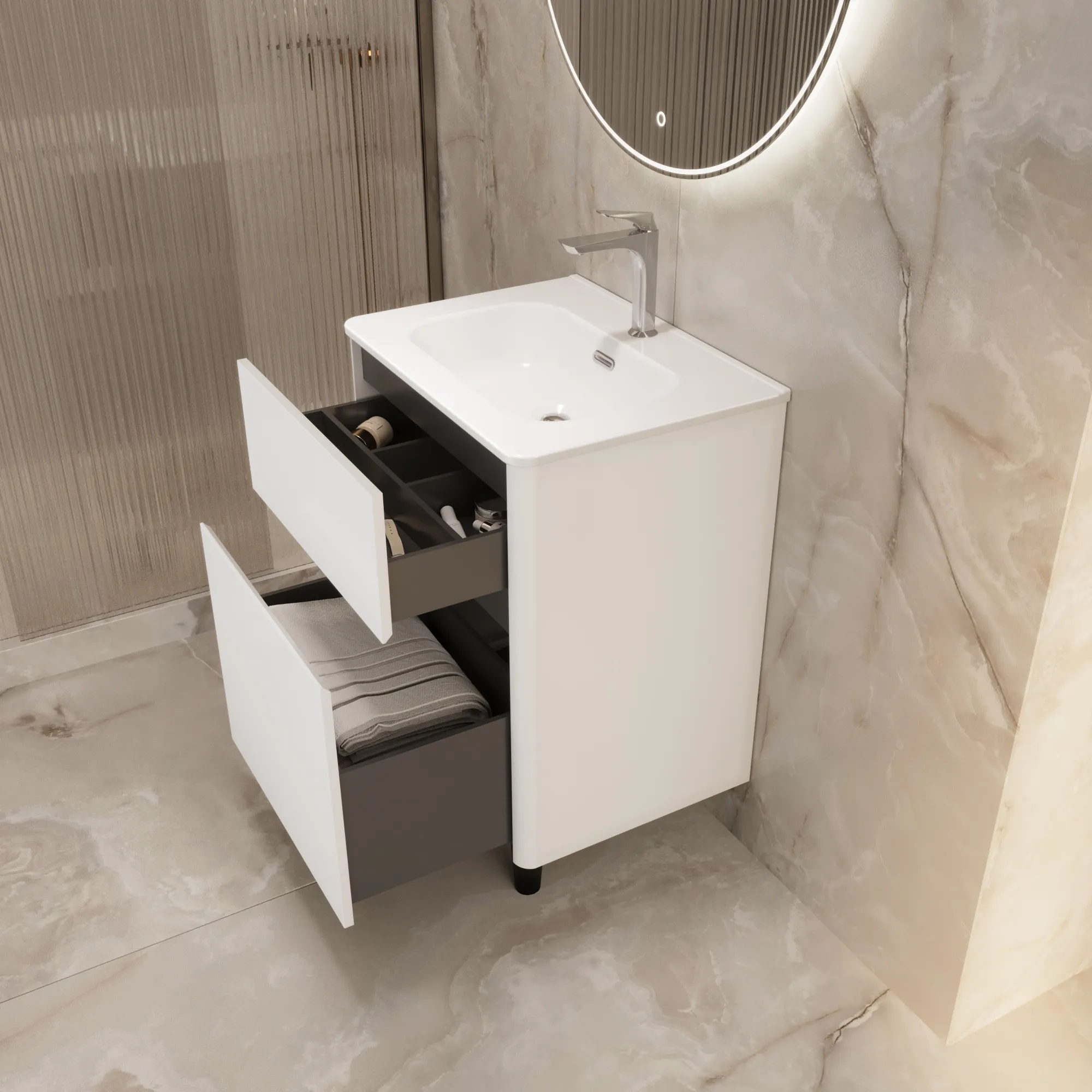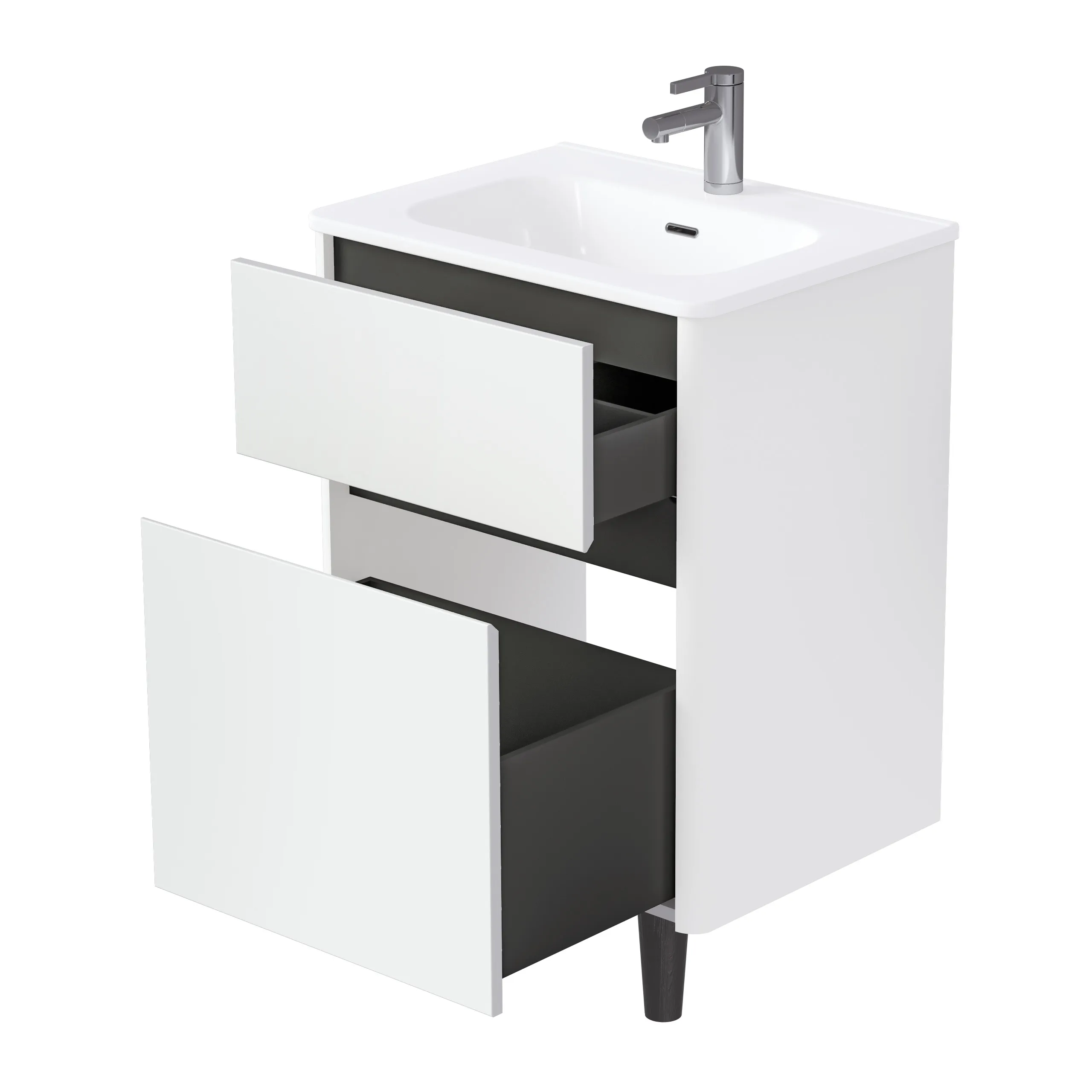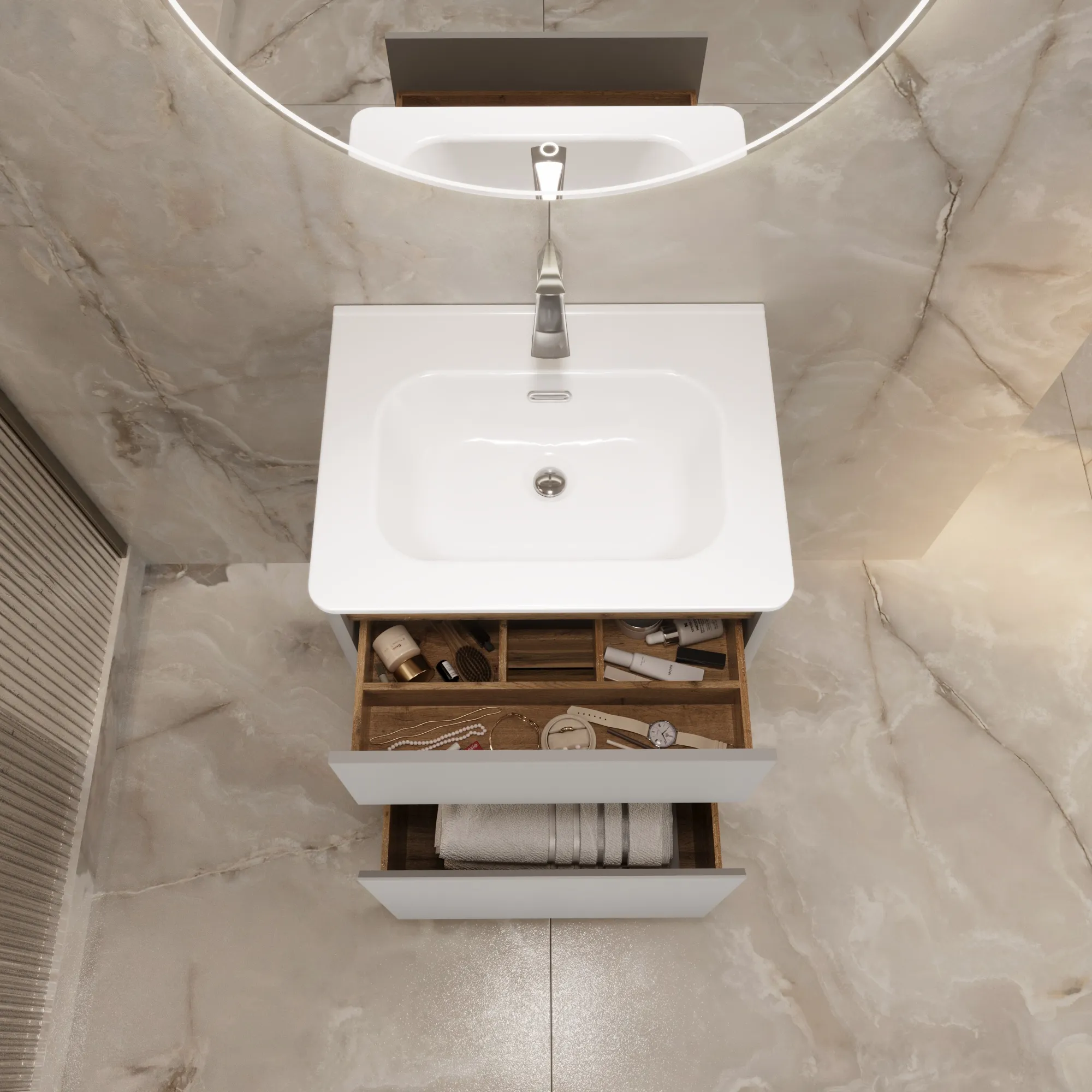 Матовый фасад, интегрированные ручки, керамическая раковина* с широкими бортами и полки в трендовом графитовом цвете придают интерьеру строгость, изящность и подчеркивают его уникальный характер. А белый цвет делает тумбу подходящей для большинства интерьеров ванной комнаты.