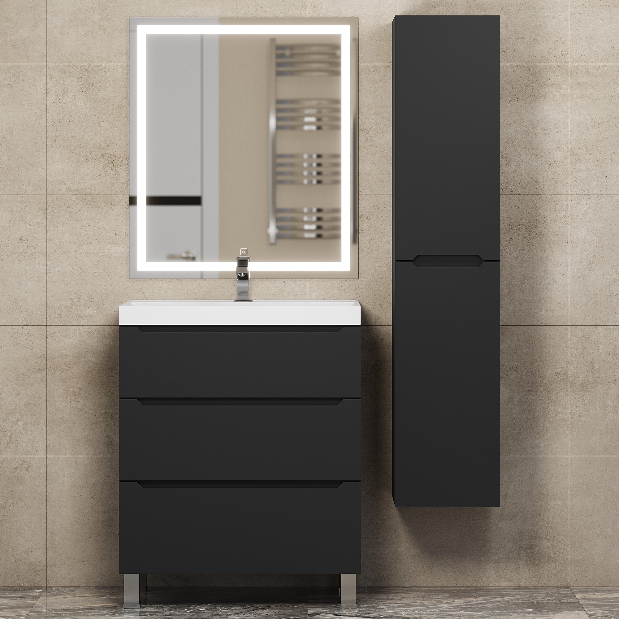Тумба поставляется в собранном виде, в комплект входят ножки для напольного монтажа.