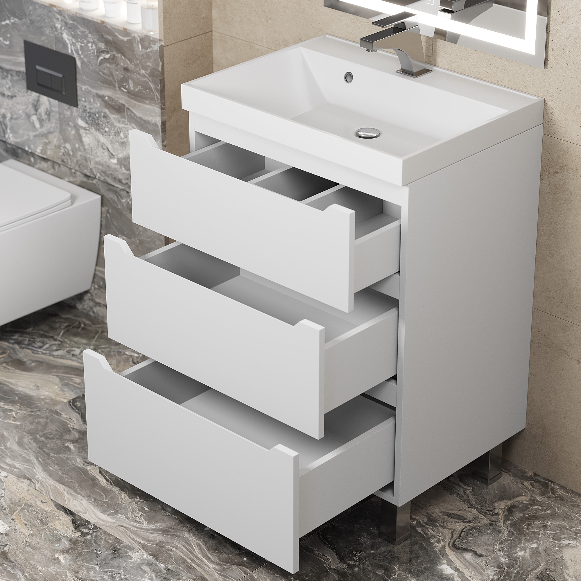 Напольная тумба под раковину для ванной Uperwood Tanos с тремя выдвижными ящиками представляет собой функциональное, надежное и практичное решение, которое отлично впишется в любой современный дизайн ванной комнаты.