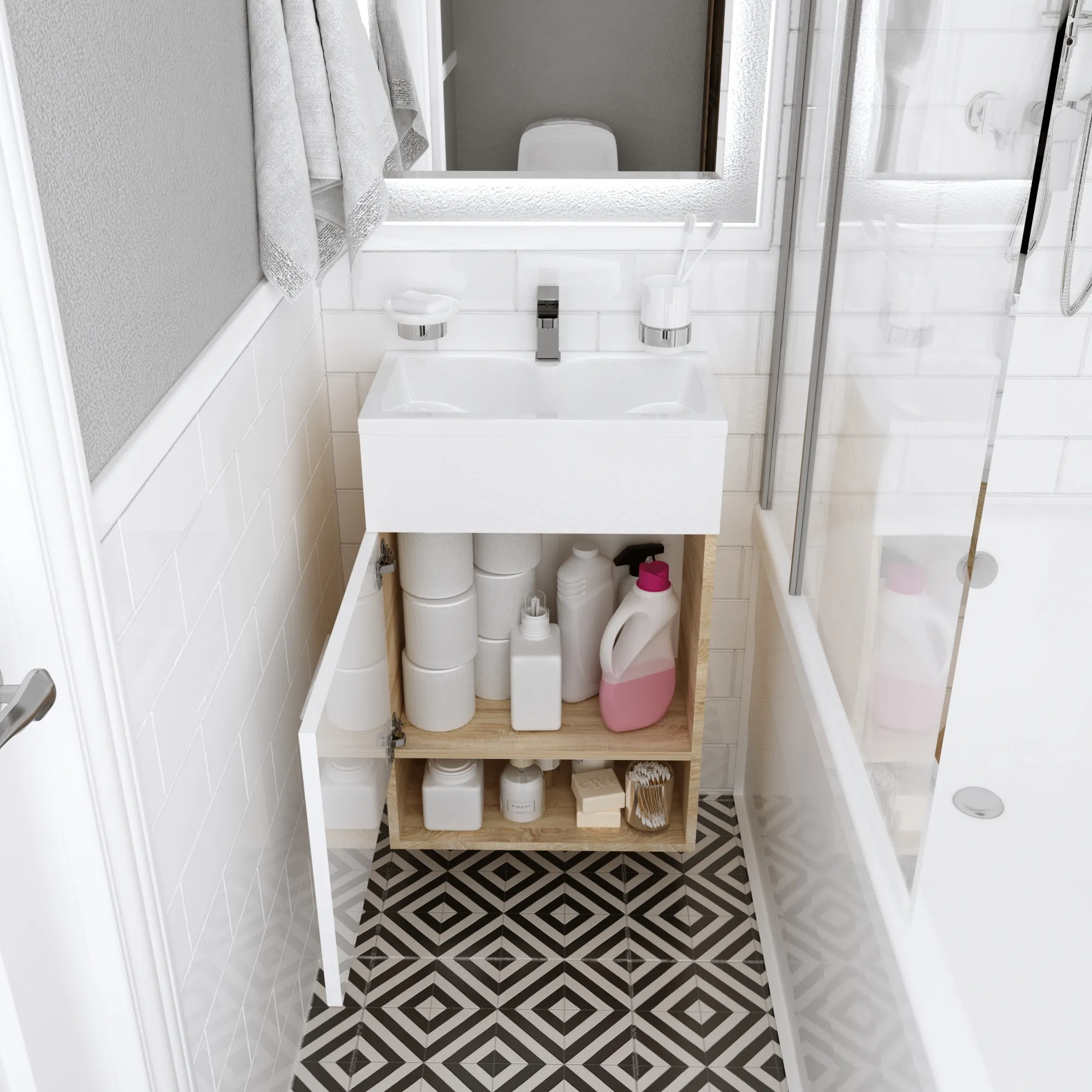 Компактная мебель с уникальными габаритами - глубина тумбы всего 30 см. Мебель выполнена в современном минималистичном стиле, для которого характерны правильные геометрические формы, рациональность и эргономичность. Специально продуманная конструкция без ручек позволяет создать цельный легкий образ, не утяжеленный фурнитурой и дает возможность гармонично вписаться в любой интерьер. Для бережливой повседневной эксплуатации, тумбы оснащены демпферами и дверными петлями с доводчиками, обеспечивающими бесшумное и мягкое закрывание. В комплекте идет раковина из полимерной керамики и специализированный регулируемый телескопический сифон.