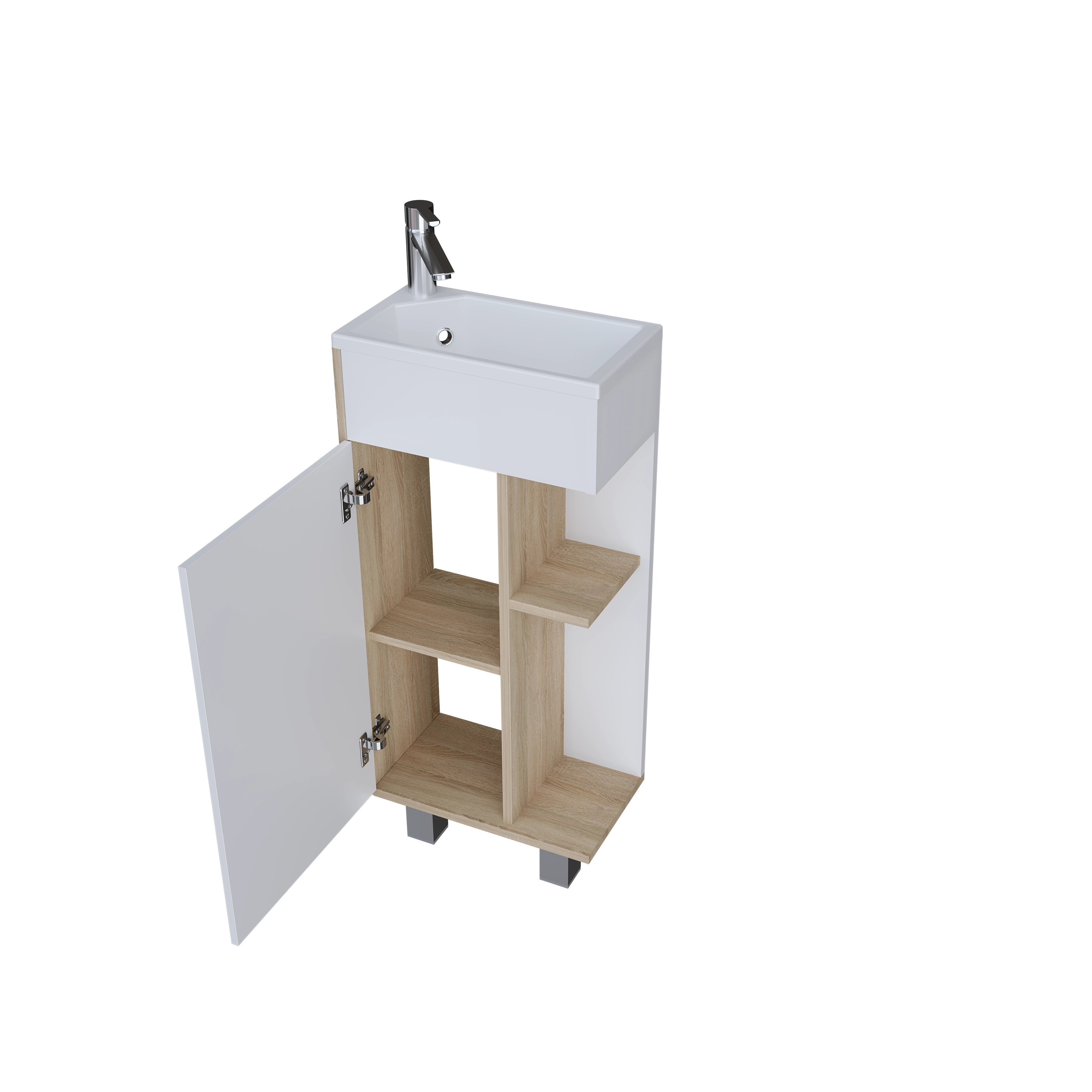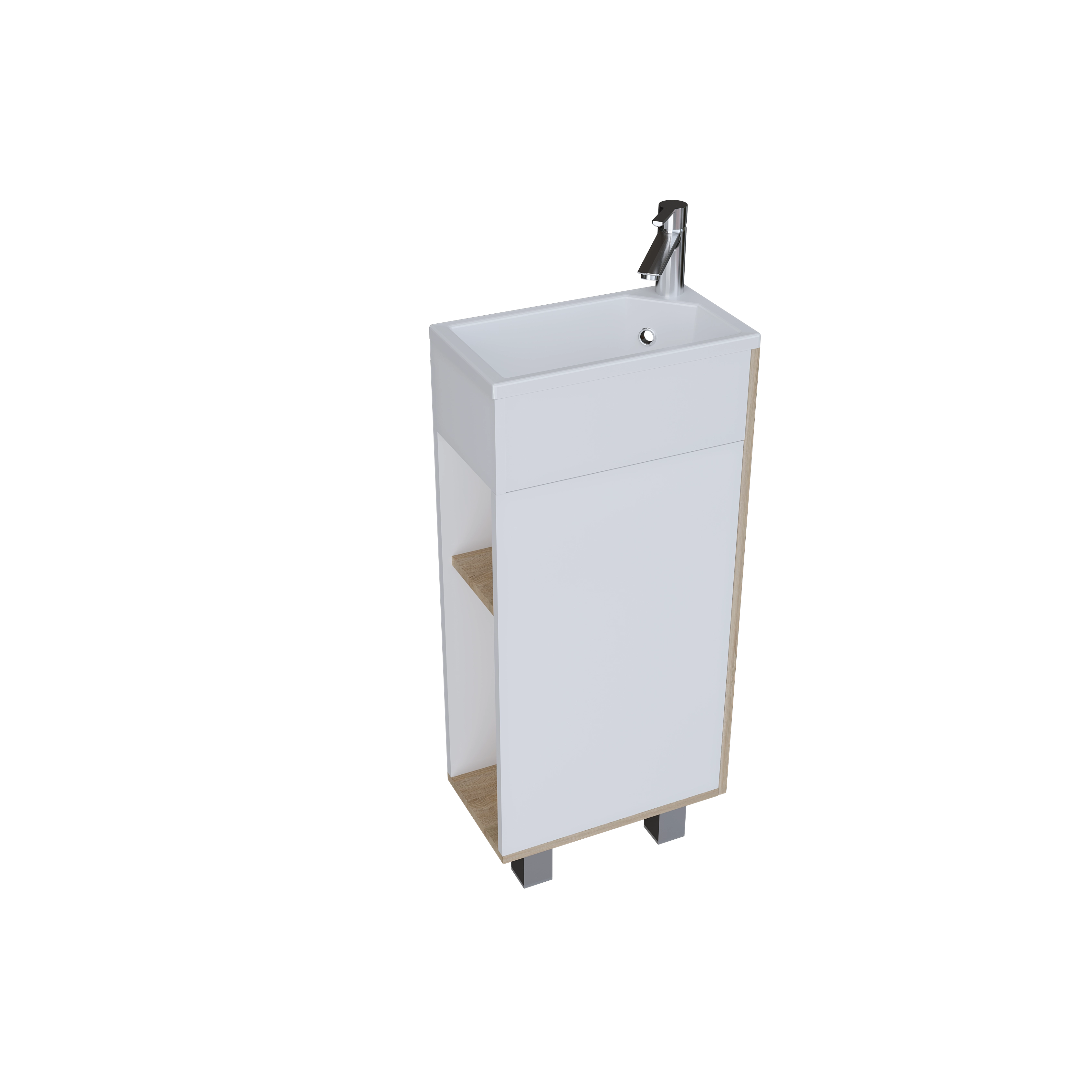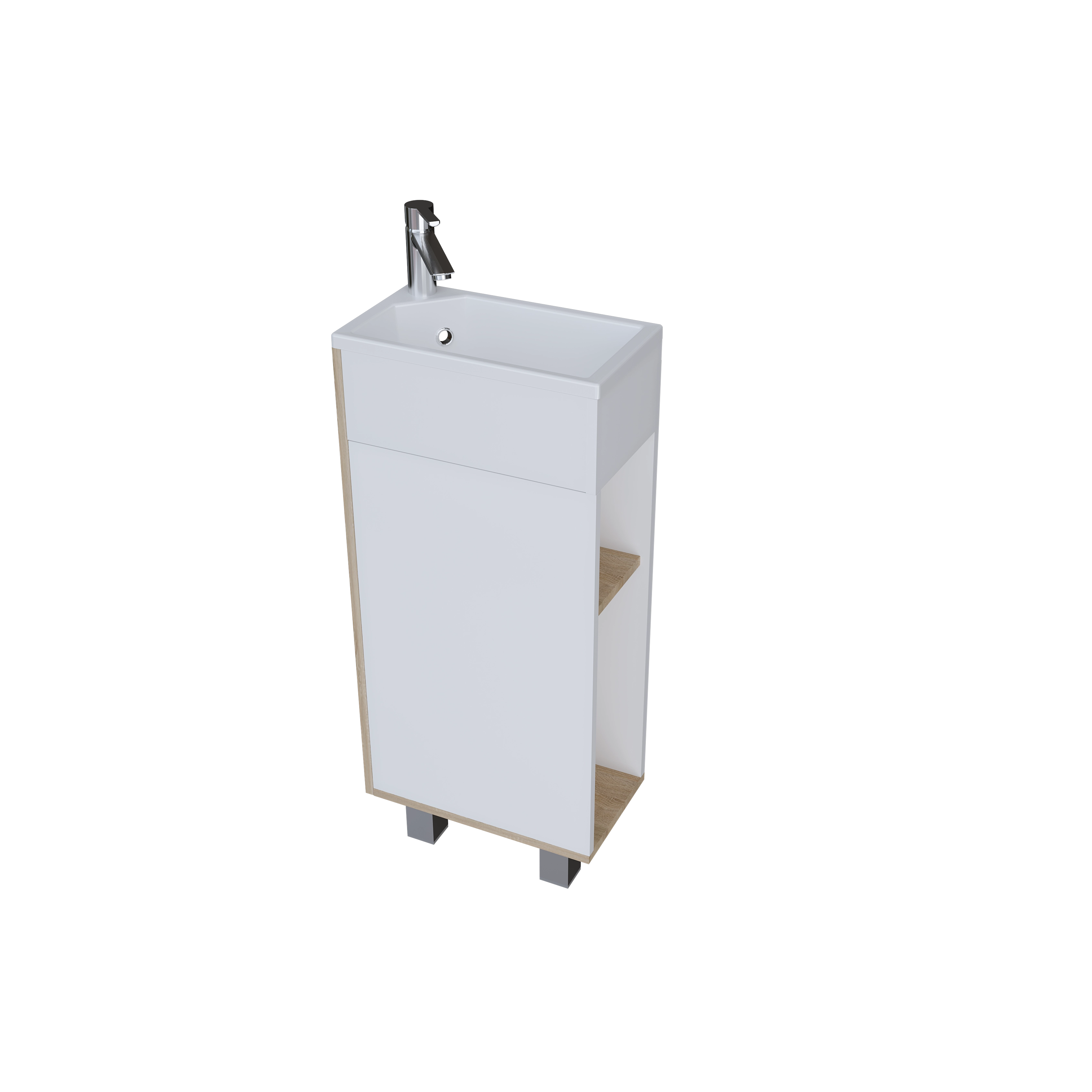 Компактная мебель с уникальными габаритами - глубина тумбы всего 30 см. Мебель выполнена в современном минималистичном стиле, для которого характерны правильные геометрические формы, рациональность и эргономичность. Специально продуманная конструкция без ручек позволяет создать цельный легкий образ, не утяжеленный фурнитурой и дает возможность гармонично вписаться в любой интерьер. Для бережливой повседневной эксплуатации, тумбы оснащены демпферами и дверными петлями с доводчиками, обеспечивающими бесшумное и мягкое закрывание. В комплекте идет раковина из полимерной керамики. Решение идально подойдет в гостевой санузел или маленькую ванную.