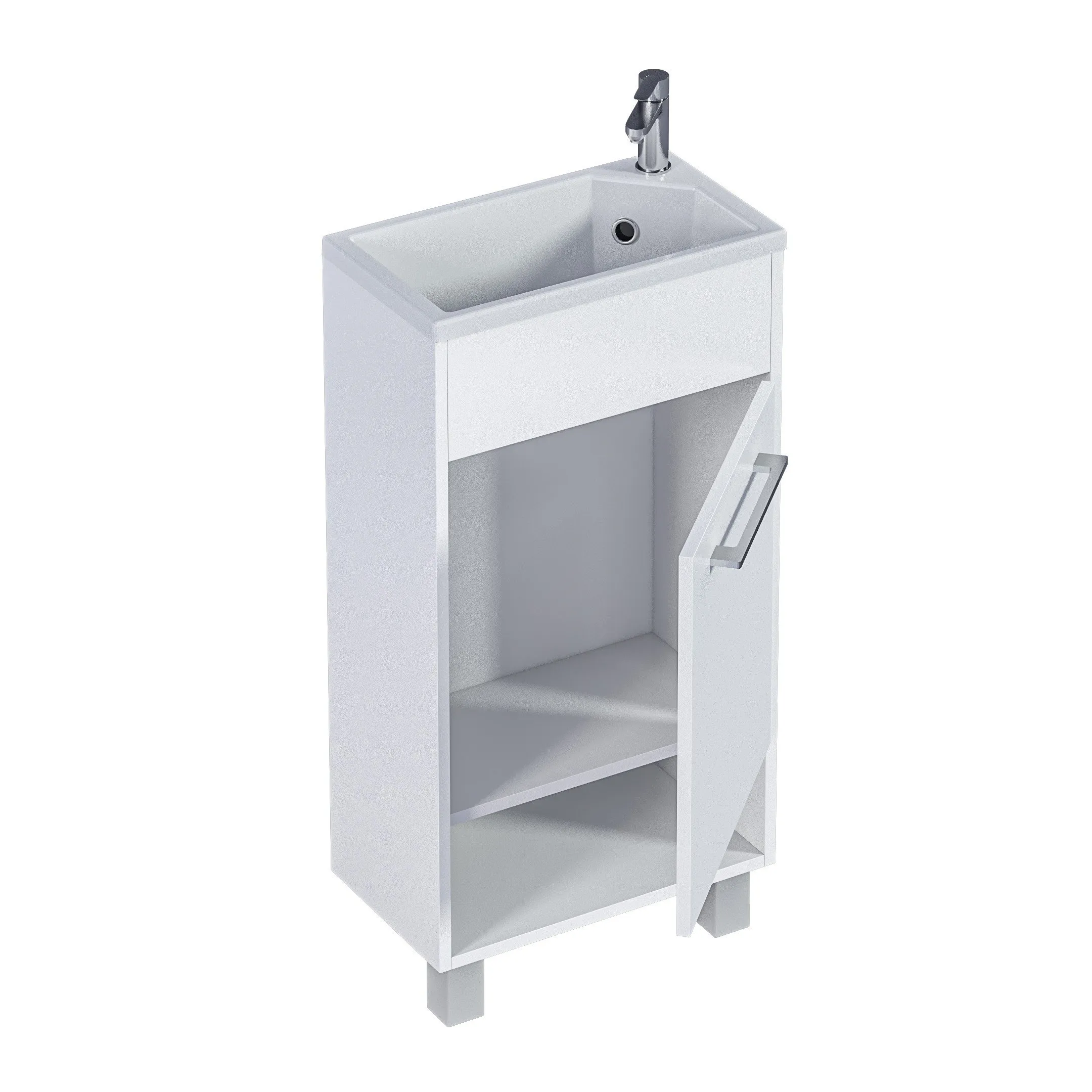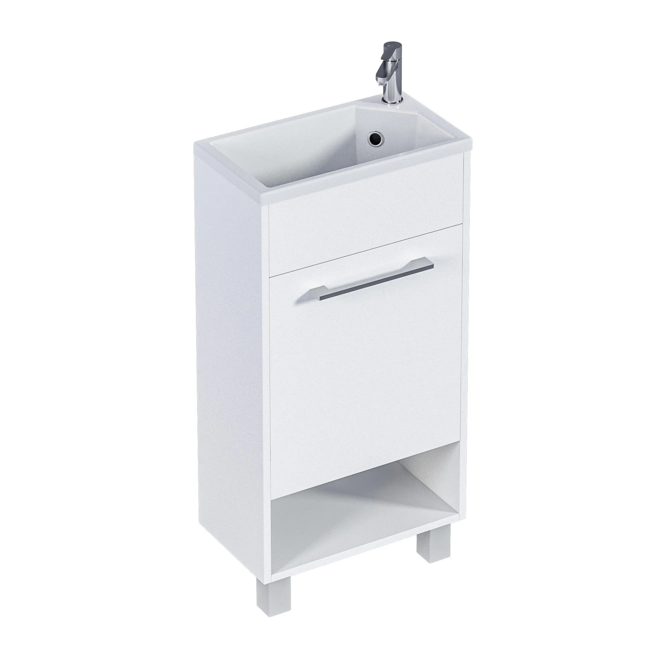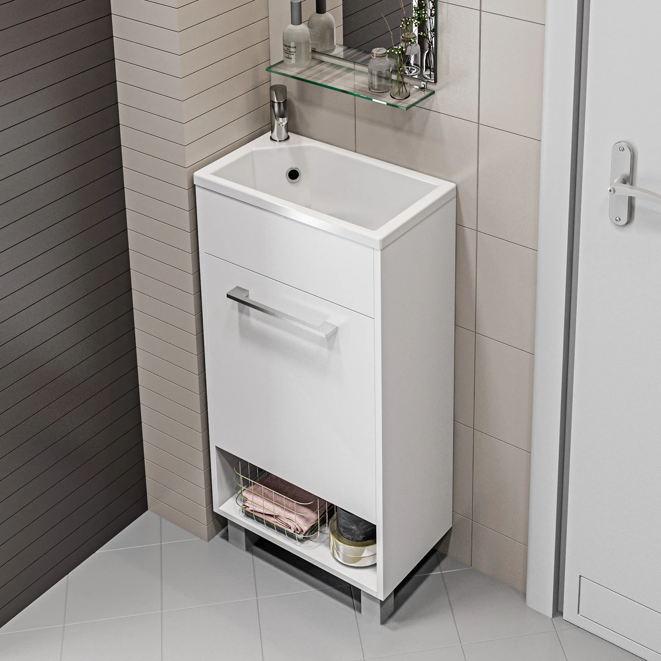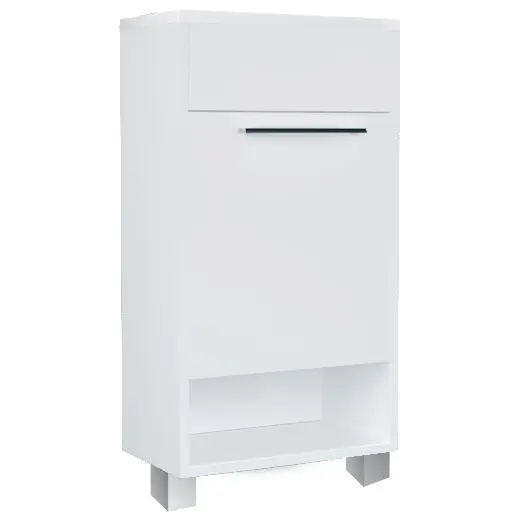 Компактная мебель с уникальными габаритами - глубина тумбы всего 22 см. Мебель выполнена в современном минималистичном стиле, для которого характерны правильные геометрические формы, рациональность и эргономичность. Специально продуманная конструкция без ручек позволяет создать цельный легкий образ, не утяжеленный фурнитурой и дает возможность гармонично вписаться в любой интерьер. Для бережливой повседневной эксплуатации, тумбы оснащены демпферами и дверными петлями с доводчиками, обеспечивающими бесшумное и мягкое закрывание. В комплекте идет раковина из полимерной керамики. Решение идально подойдет в гостевой санузел или маленькую ванную.