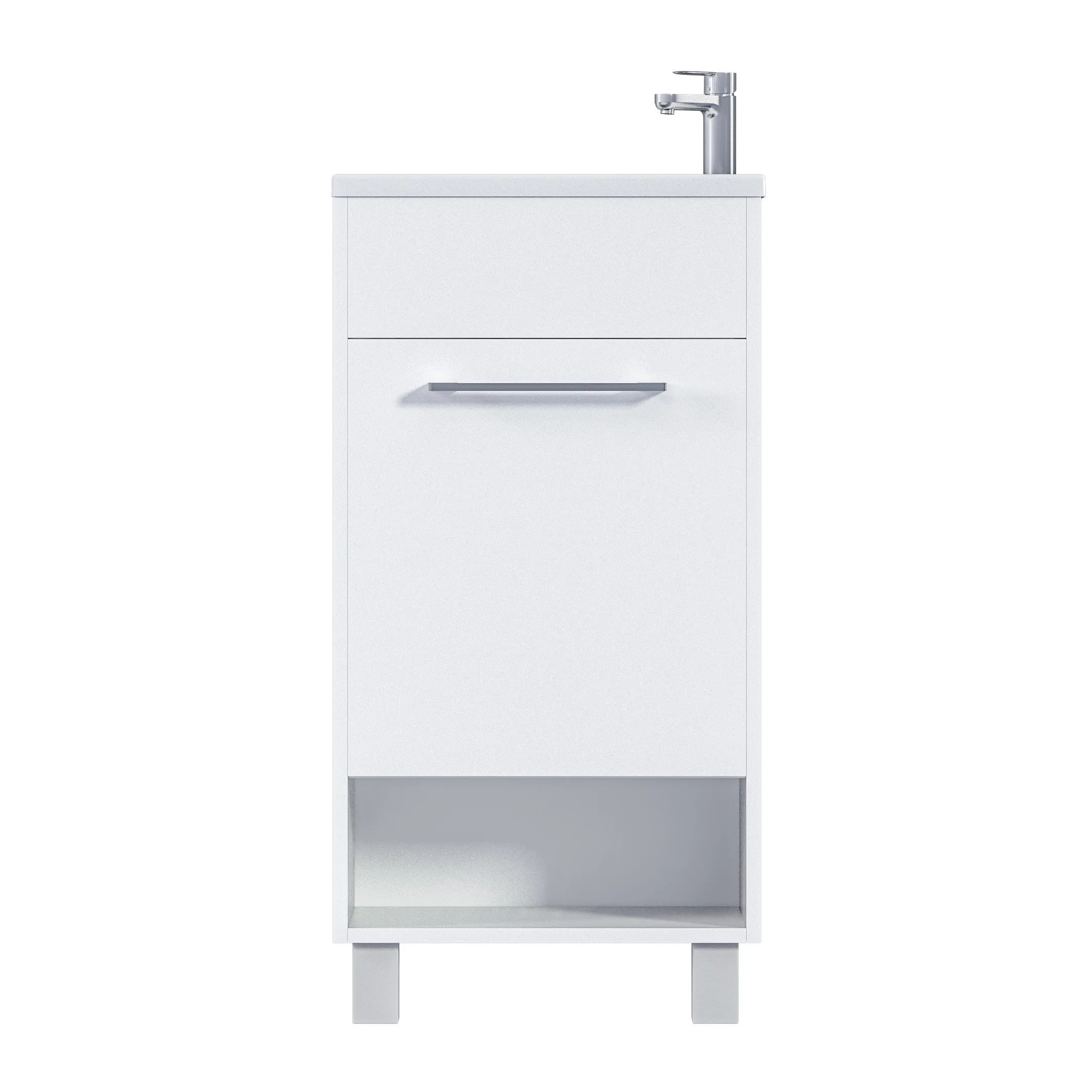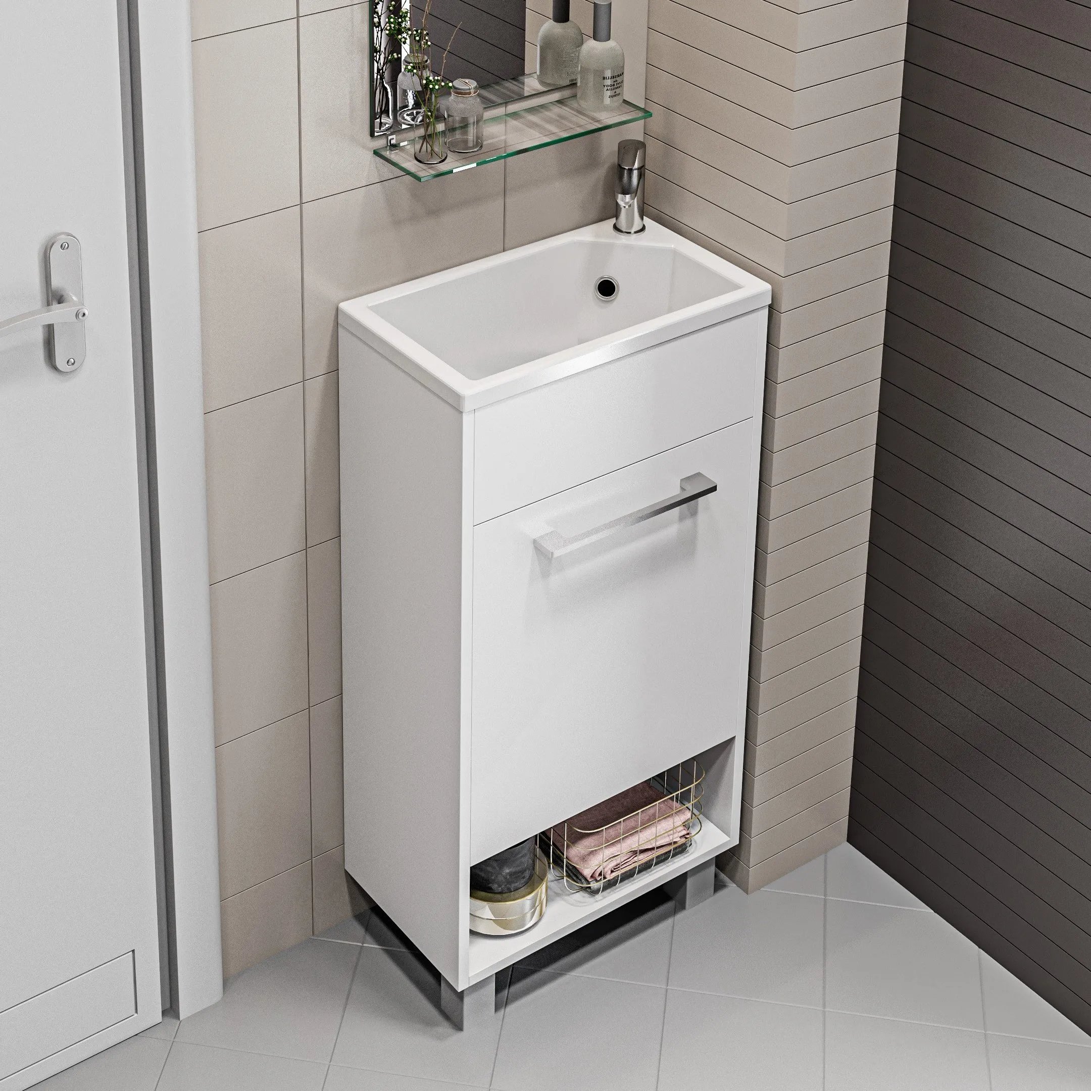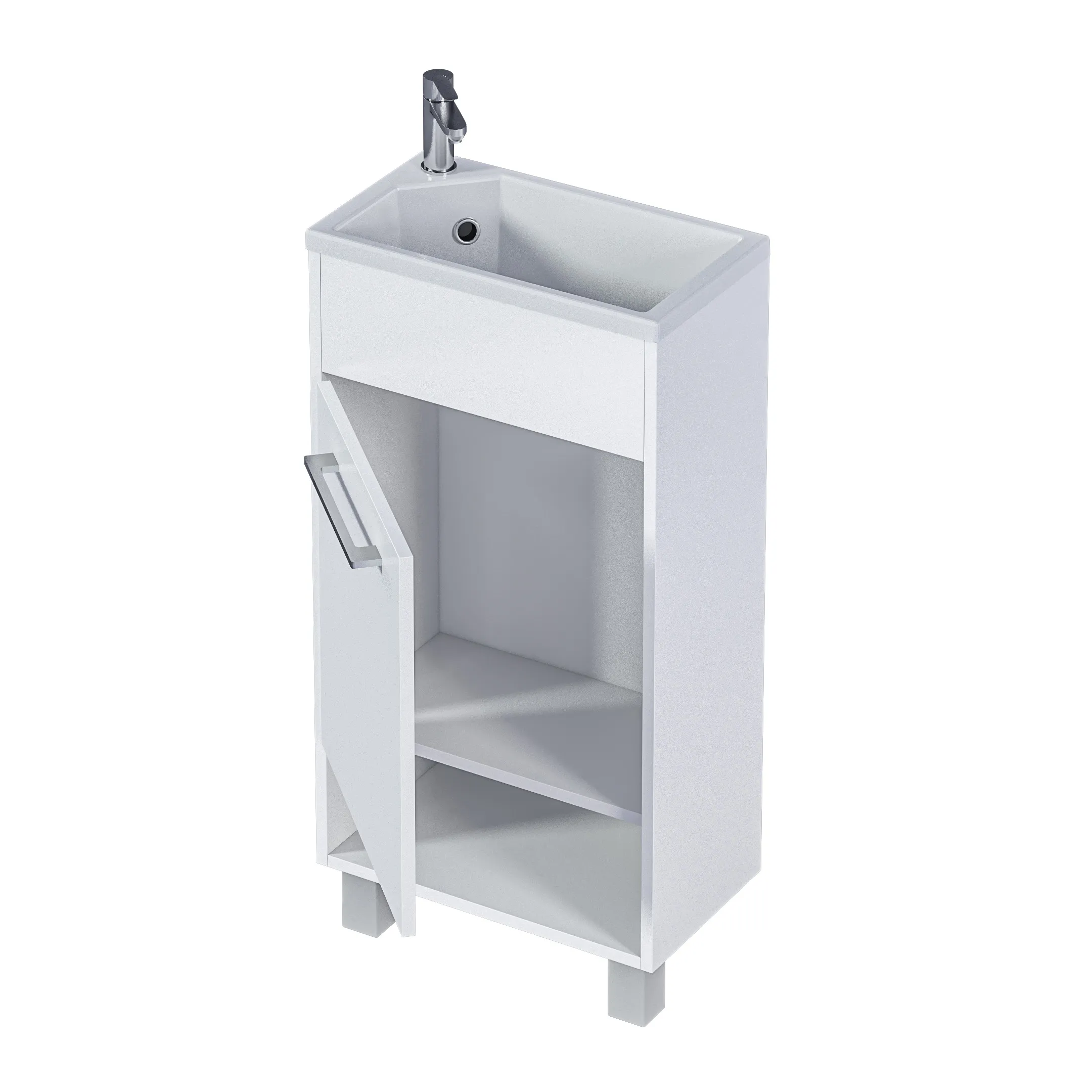 Компактная мебель с уникальными габаритами - глубина тумбы всего 22 см. Мебель выполнена в современном минималистичном стиле, для которого характерны правильные геометрические формы, рациональность и эргономичность. Специально продуманная конструкция без ручек позволяет создать цельный легкий образ, не утяжеленный фурнитурой и дает возможность гармонично вписаться в любой интерьер. Для бережливой повседневной эксплуатации, тумбы оснащены демпферами и дверными петлями с доводчиками, обеспечивающими бесшумное и мягкое закрывание. В комплекте идет раковина из полимерной керамики. Решение идально подойдет в гостевой санузел или маленькую ванную.