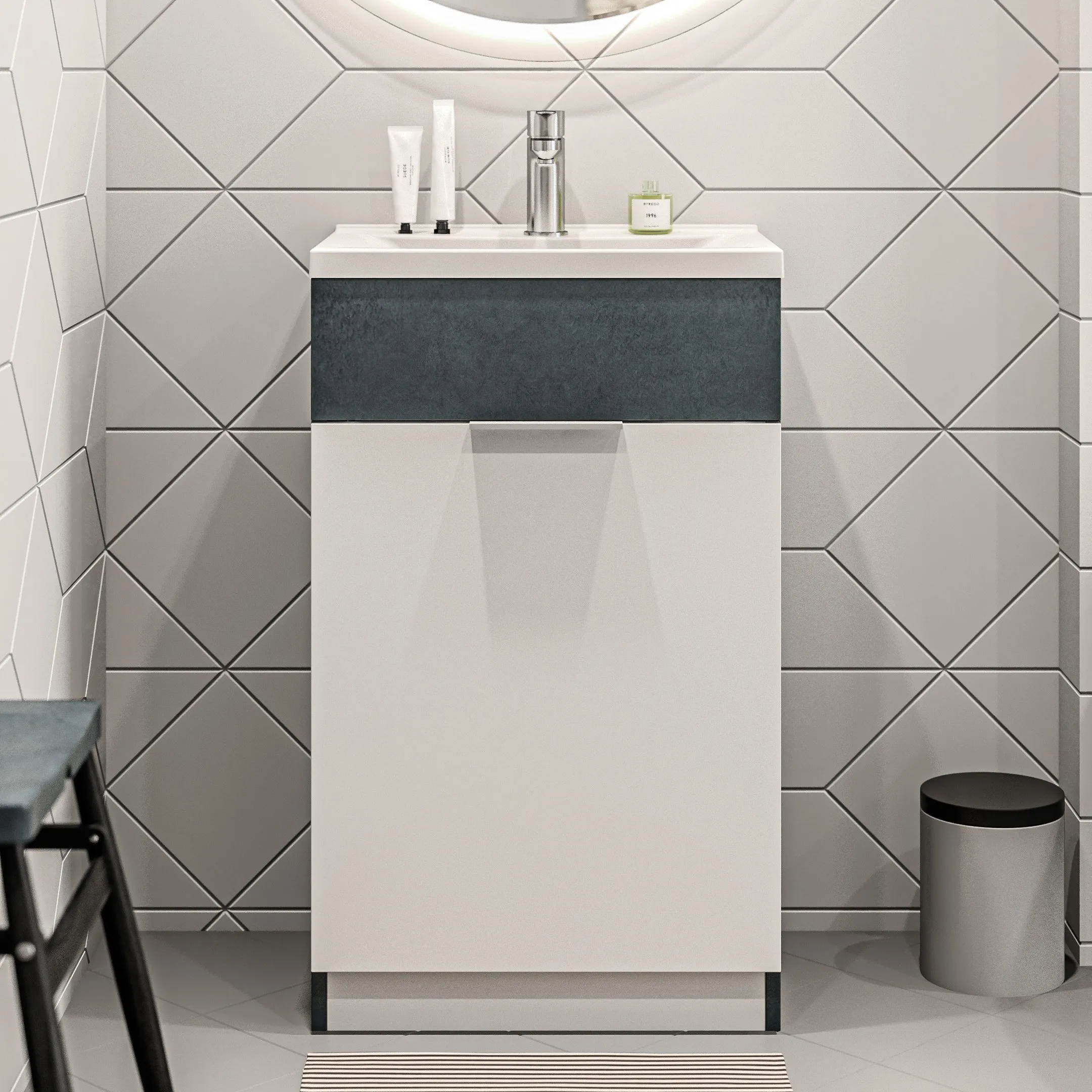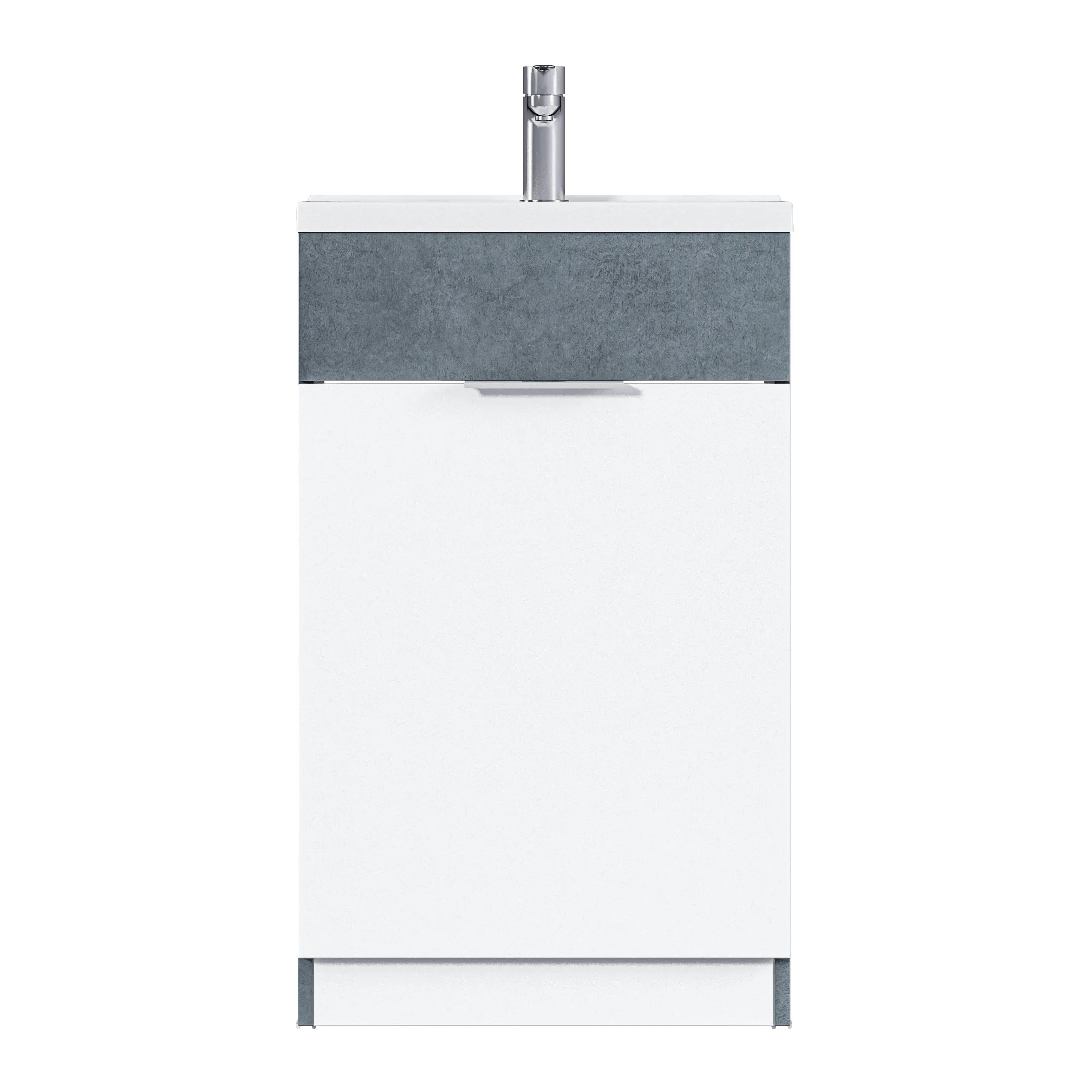 Мебель выполнена в современном минималистичном стиле, для которого характерны правильные геометрические формы, рациональность и эргономичность. Доступная компактная мебель шириной 50 см и глубиной всего 35 см. Текстуры бетона и дерева дают возможность гармонично вписаться в современный интерьер. Тумбы оснащены демпферами и дверными петлями с доводчиками, обеспечивающими бесшумное и мягкое закрывание.