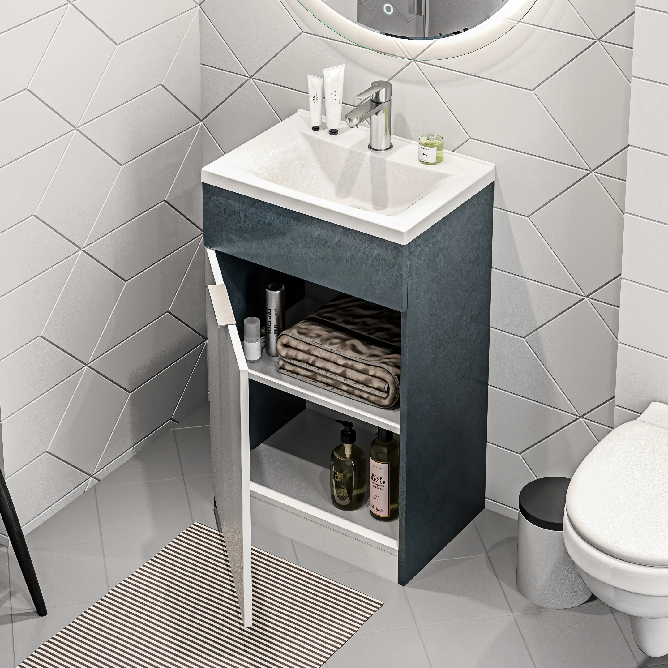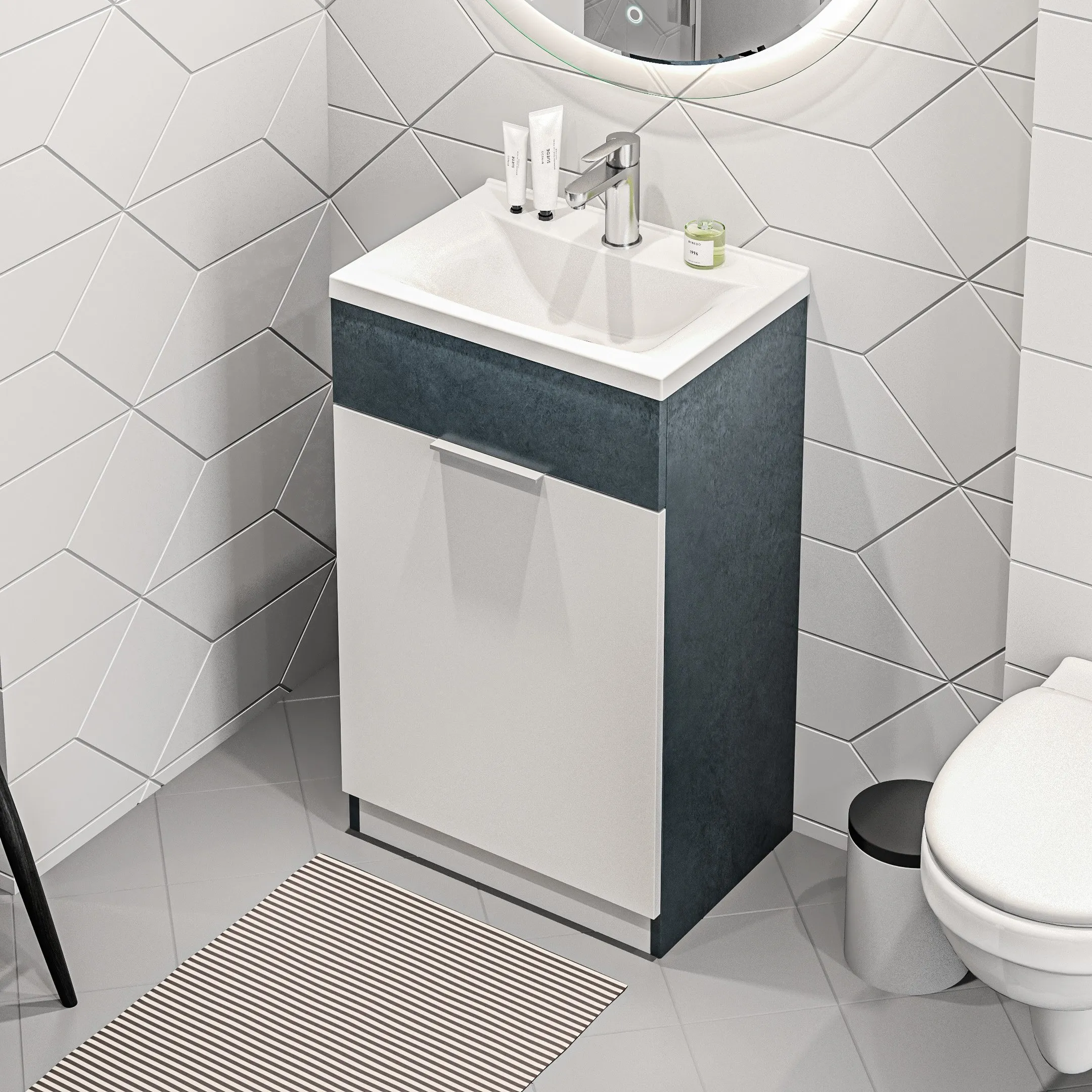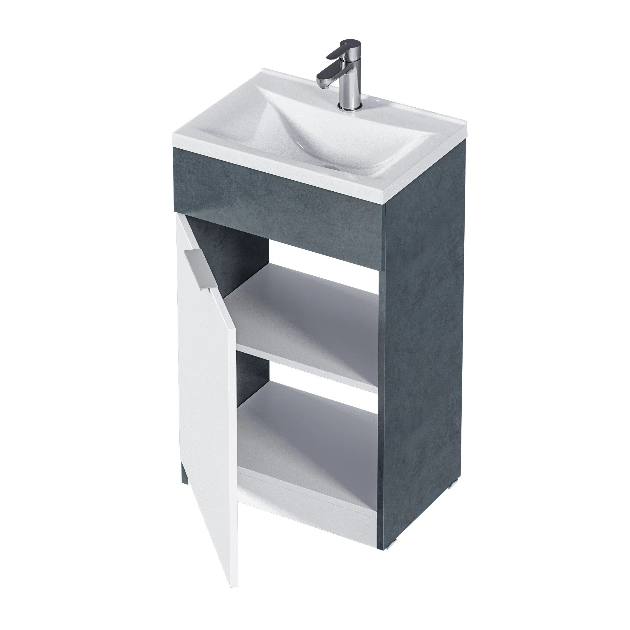 В комплекте: тумба, раковина из полимерной керамики.