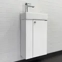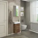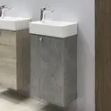Компактная подвесная тумба-умывальник Comforty Асти для небольших санузлов. Фасад и корпус тумбы изготовлены из влагостойкого ДСП в декоре «дуб дымчатый». Этот декор при прикосновении дарит ощущение натуральной древесины. В комплекте асимметричная раковина с отверстием под смеситель справа. Тумба подготовлена для подключения водоснабжения снизу. Название: Тумба-умывальник Артикул: 00-00000831CF Варианты цвета: дуб дымчатый Материал: влагостойкое ЛДСП Габариты (ШхВхГ): 400*700*220 мм Комплектация: накладная раковина Cersanit Crea 40 Инструкция для мебели для ванных комнат COMFORTY Схема монтажа и подключения коммуникаций