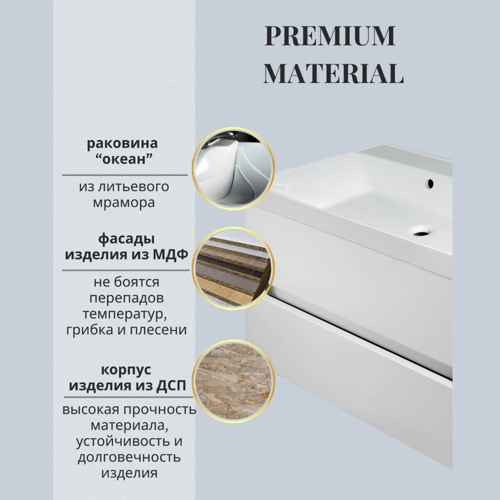 Тумба имеет классическую форму и изготовлена из ЛДСП и МДФ. Фасад сделан из МДФ, что позволяет не боятся перепадов температур, грибка и плесени. Также МДФ устойчив к различным микроорганизмам, что делает такую тумбу безопасной в быту. Корпус тумбы изготовлен из ЛДСП, главным плюсом ЛДСП является высокая прочность материала, что влияет на устойчивость и долговечность изделия. Дизайн тумбы отлично впишется в повседневный быт и дизайн любой ванной комнаты.
