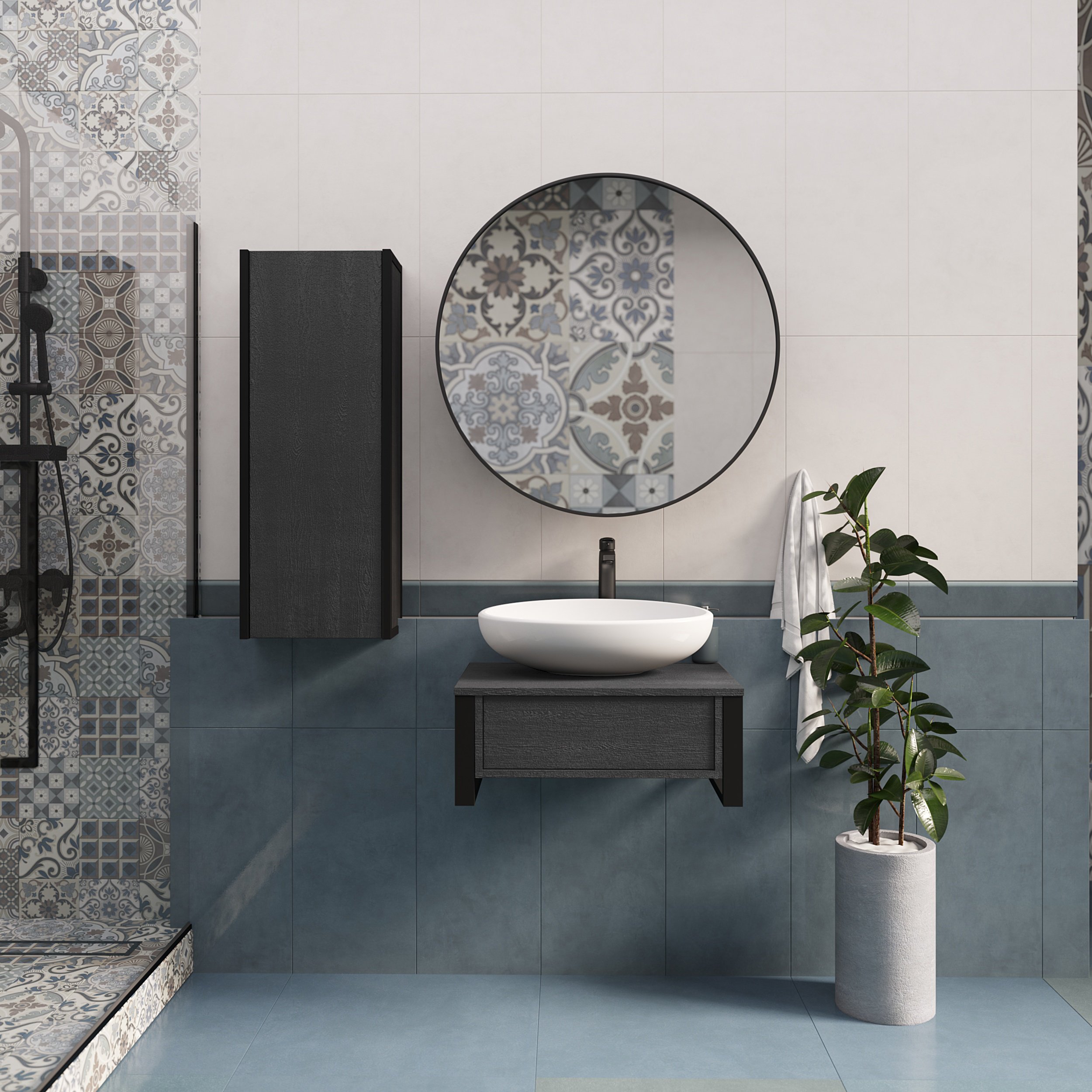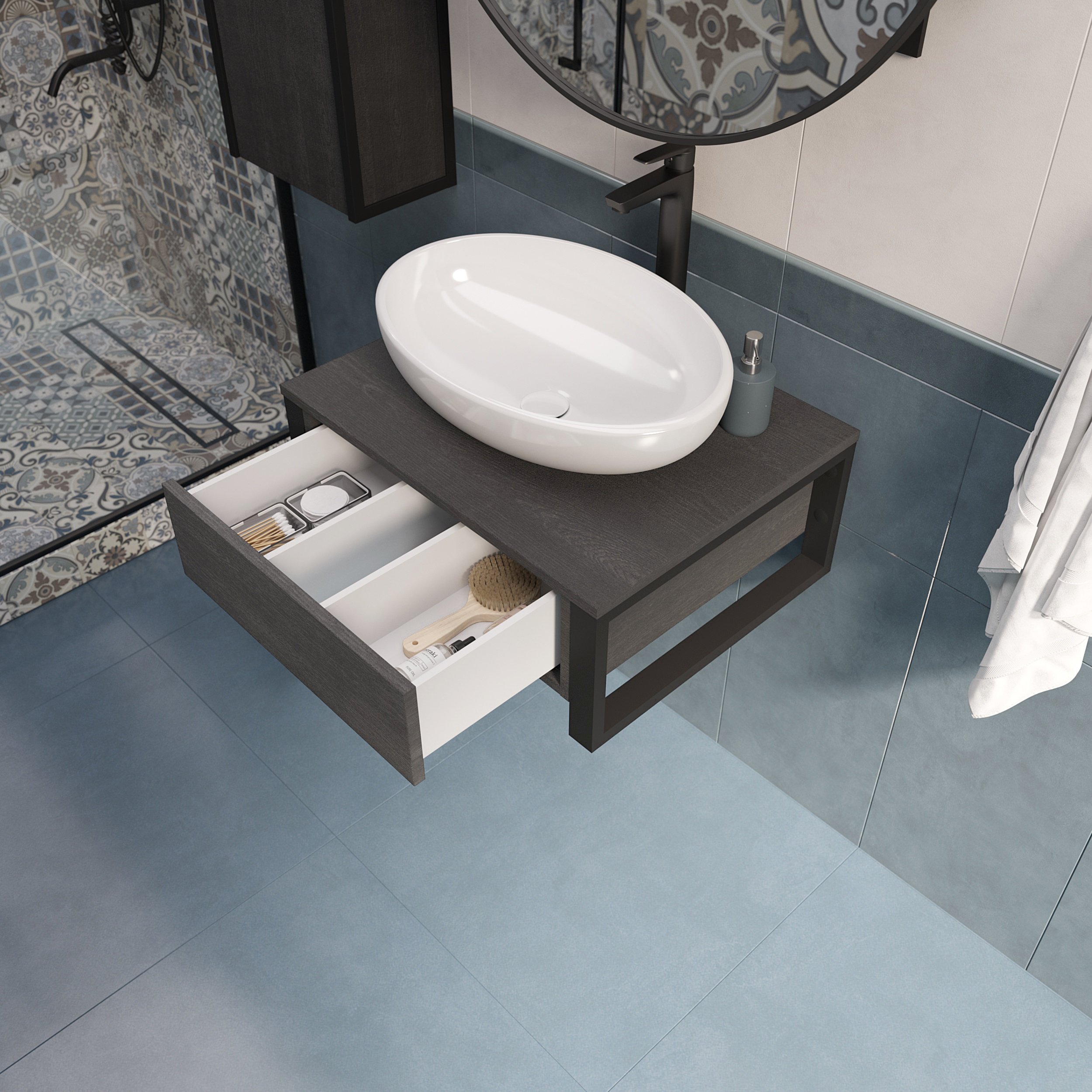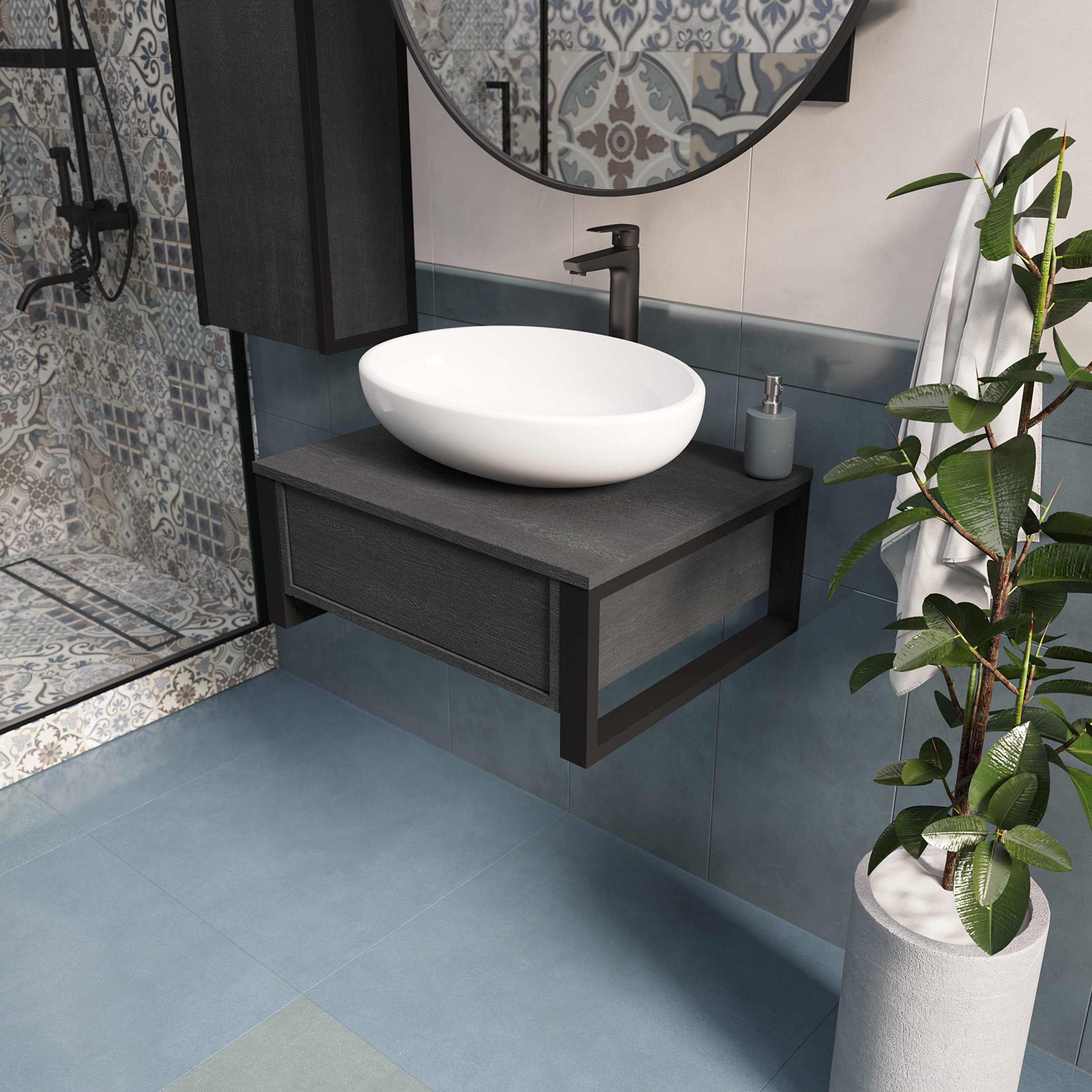 Подвесная тумба GRUNGE LOFT под накладную раковину – стильное решение для современного интерьера. Трендовый фактурный фасад в темном графитовом оттенке становится привлекательным акцентом в ванной. Грубая текстура и глубокий серый цвет символизируют силу и уверенность, также придают интерьеру свой неповторимый почерк.
