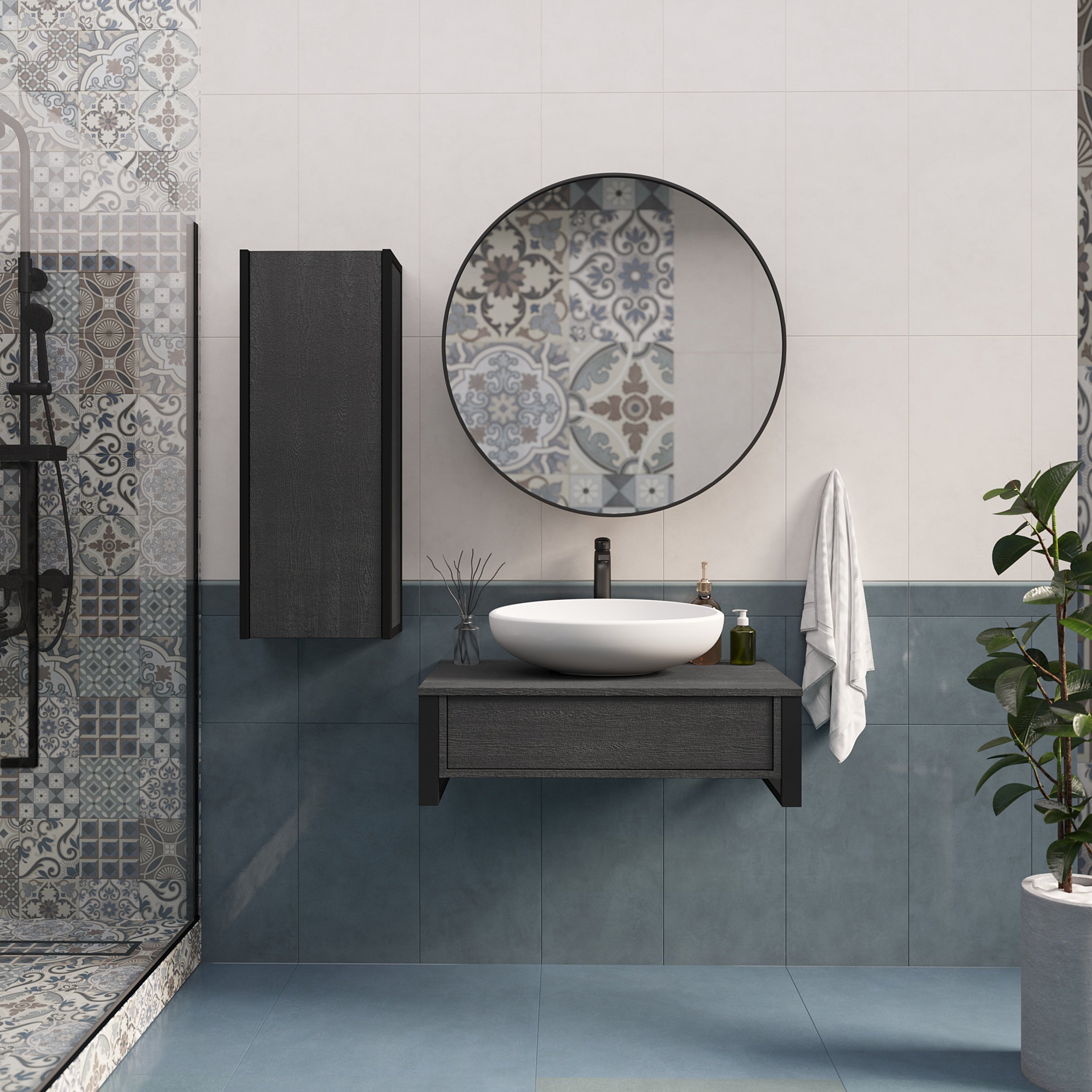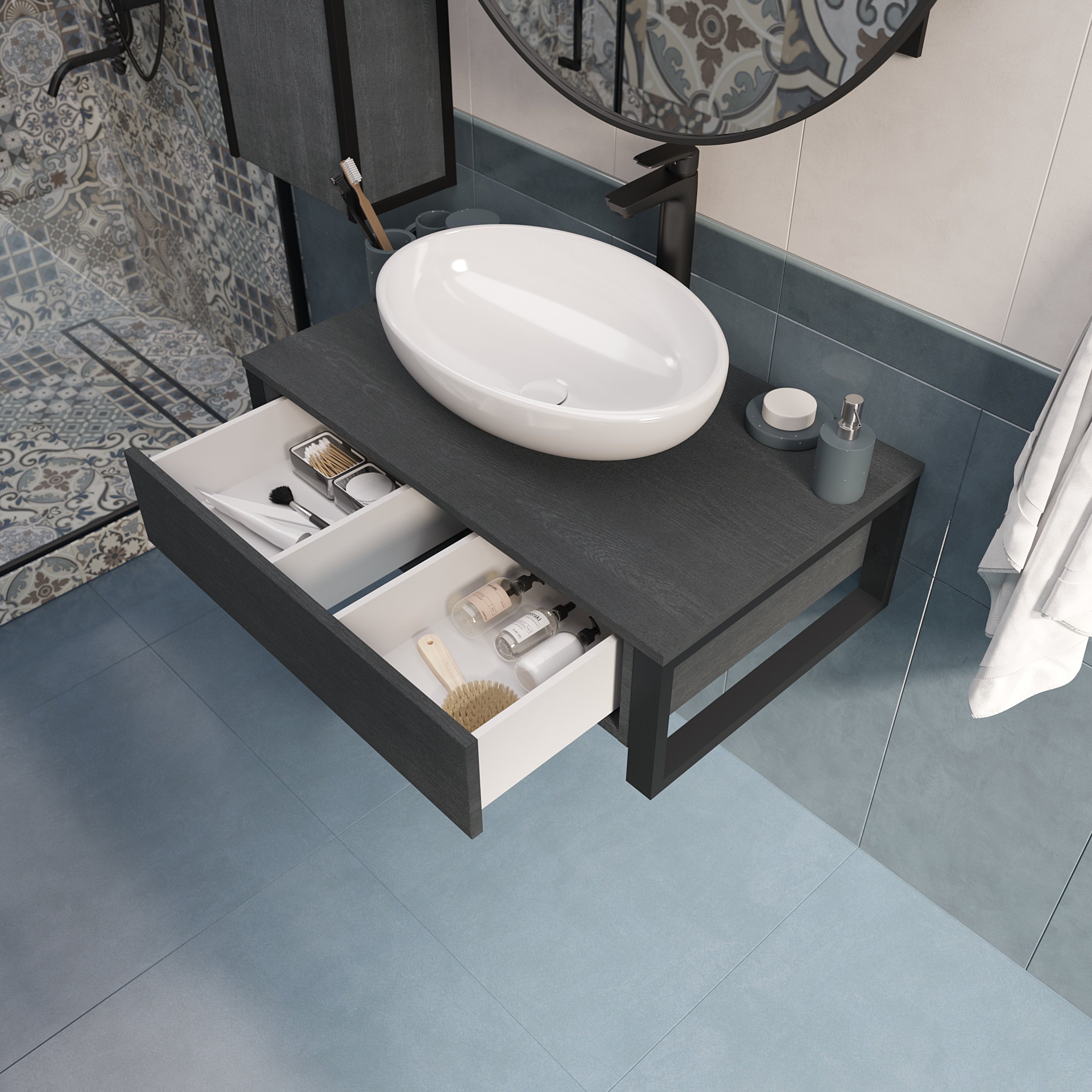 Подвесная тумба GRUNGE LOFT под накладную раковину – стильное решение для современного интерьера. Трендовый фактурный фасад в темном графитовом оттенке становится привлекательным акцентом в ванной. Грубая текстура и глубокий серый цвет символизируют силу и уверенность, также придают интерьеру свой неповторимый почерк.