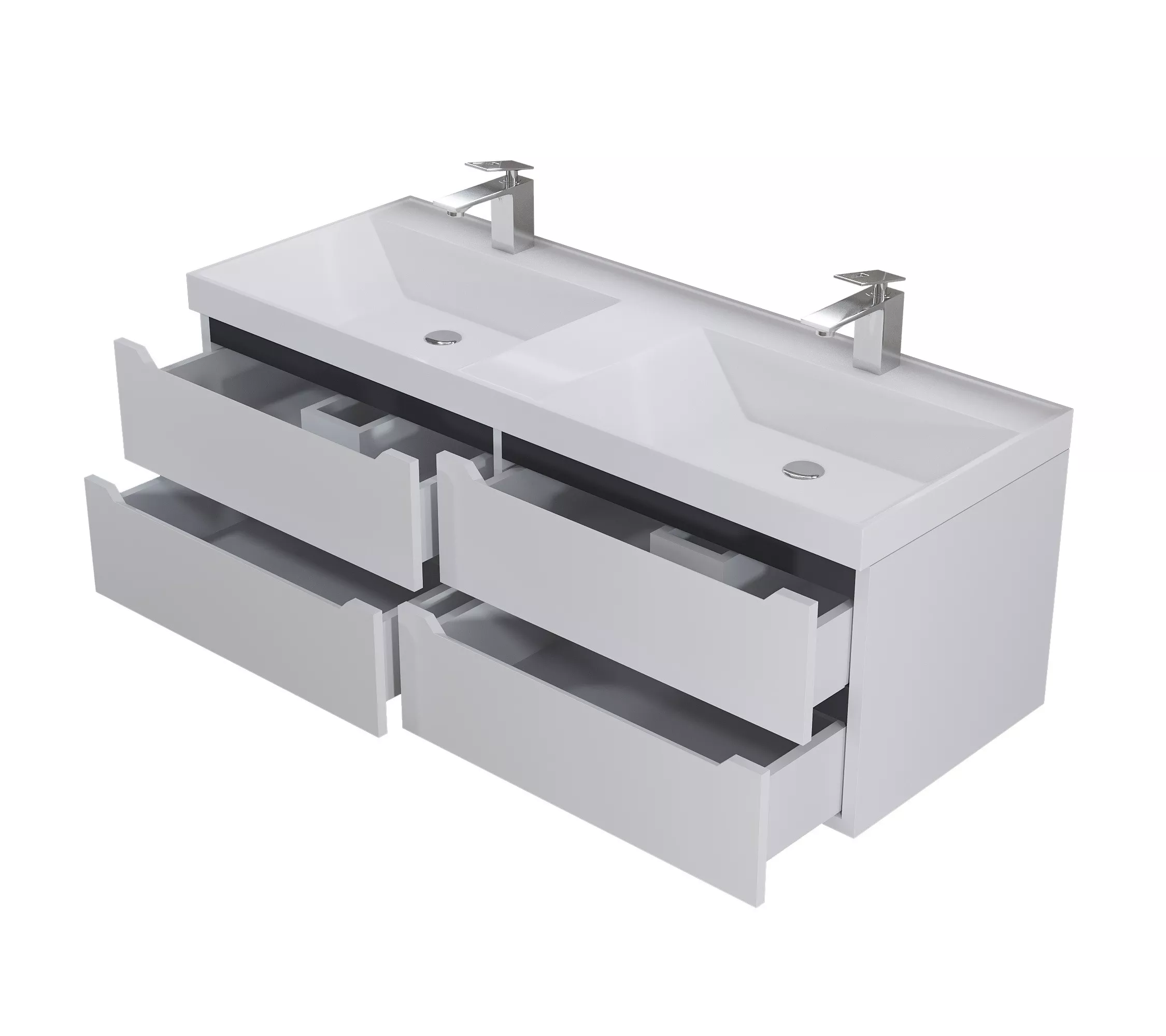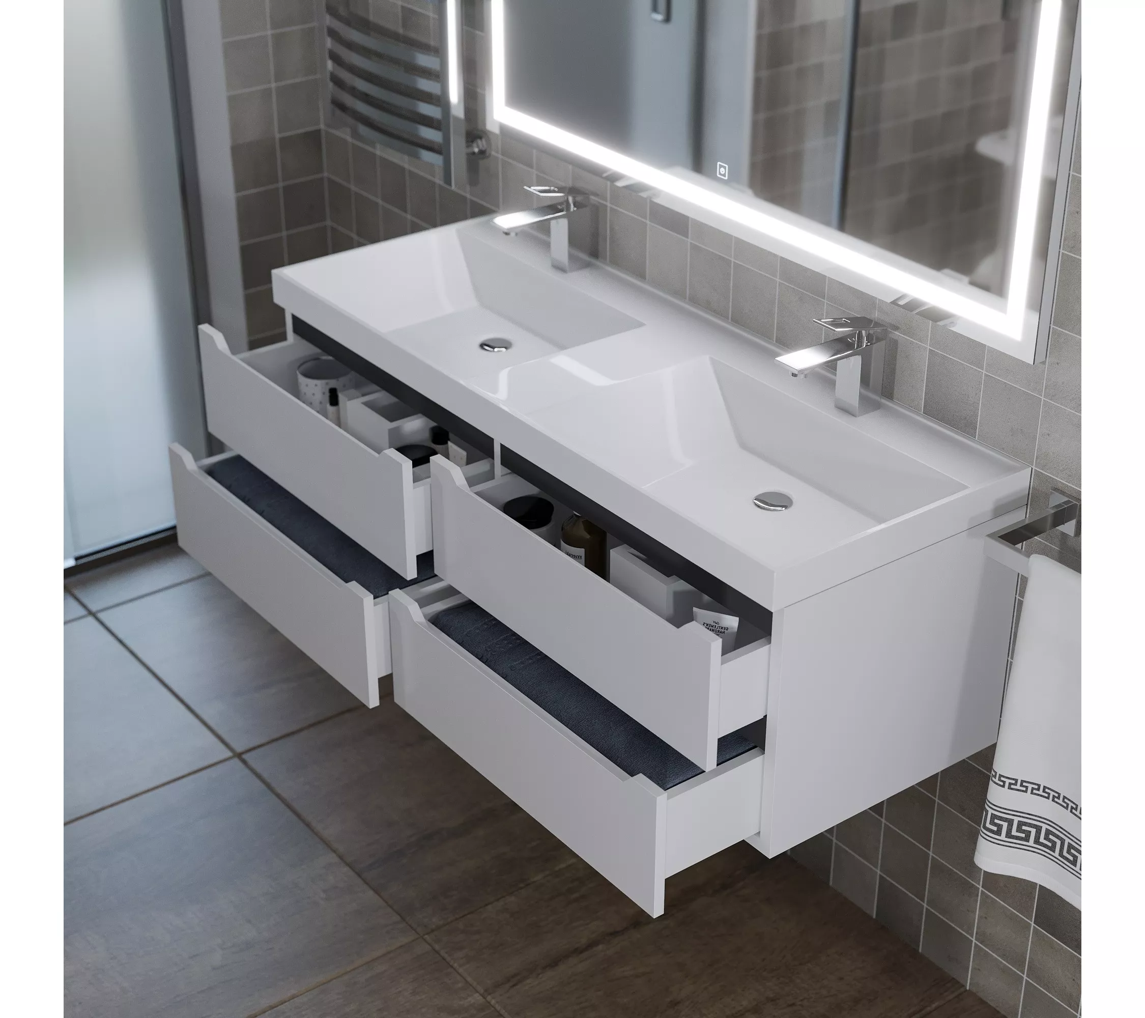 Вместительная подвесная тумба для ванной комнаты Uperwood Tanos под раковину с двумя чашами Uperwood Classic 120 см имеет 4 выдвижных ящика и представляет собой функциональное, надежное и практичное решение, которое отлично впишется в любой современный дизайн ванной комнаты.