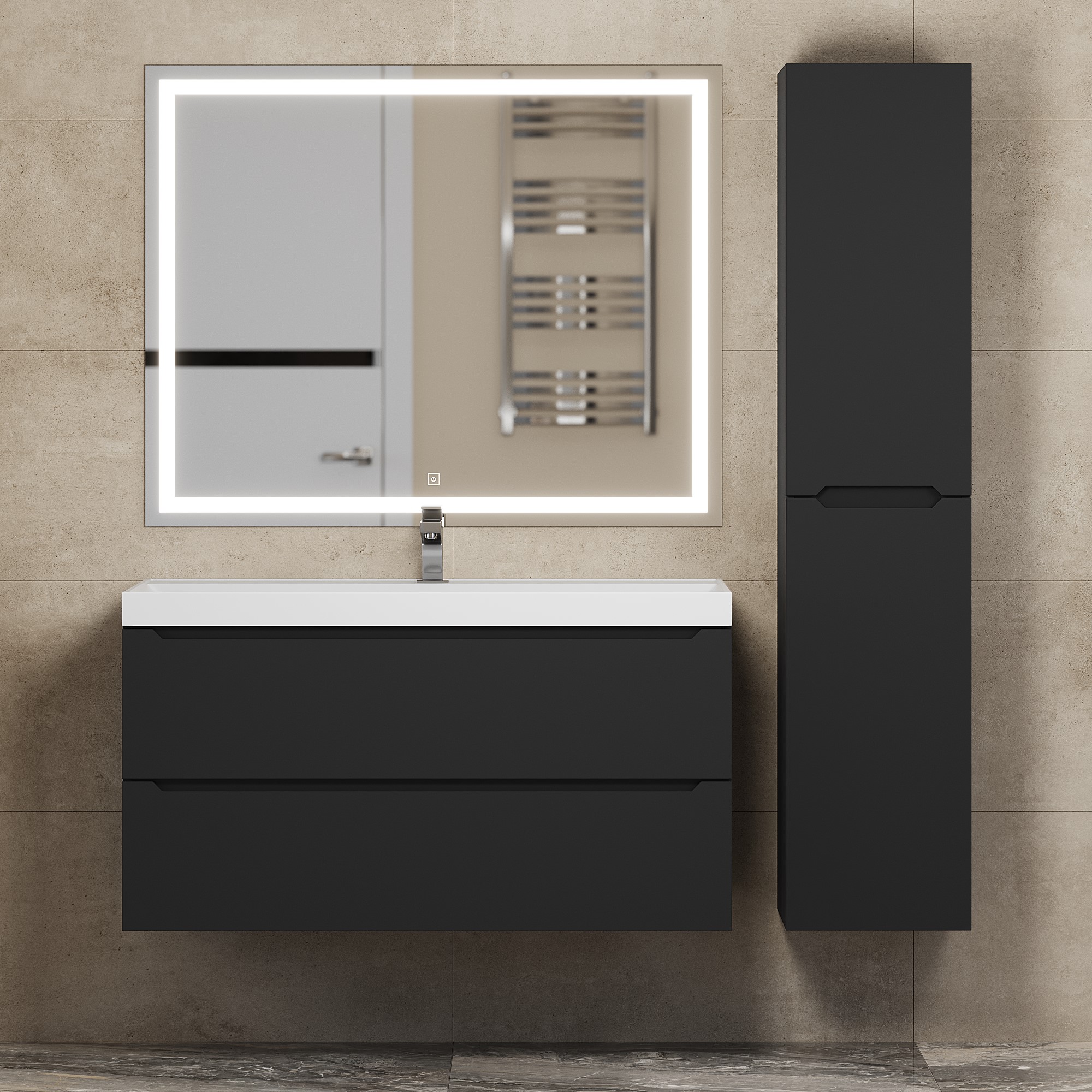 Элегантный минималистичный дизайн тумбы дополняет ее безупречная матовая поверхность.