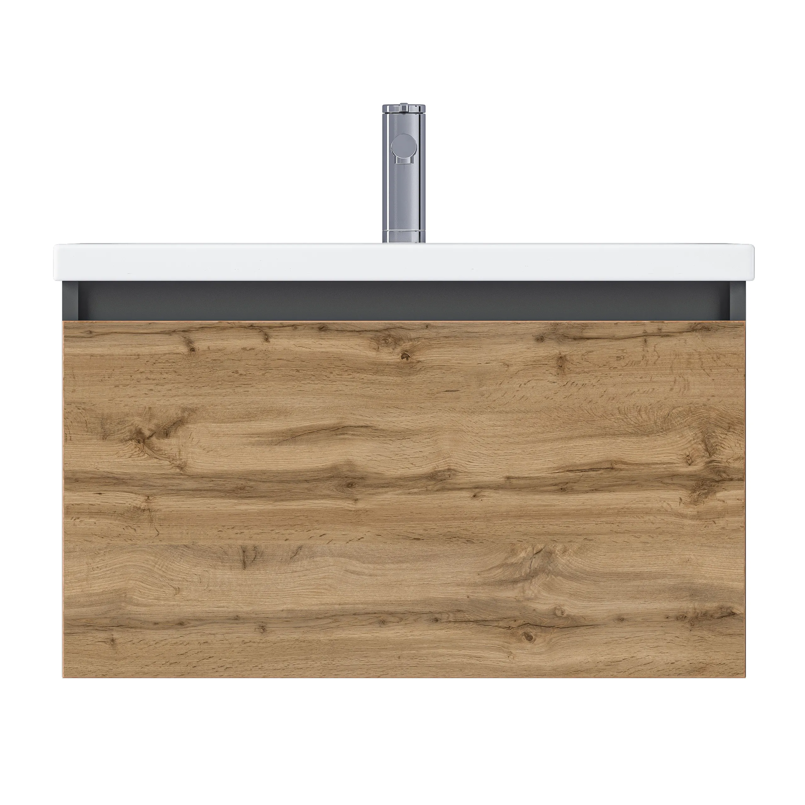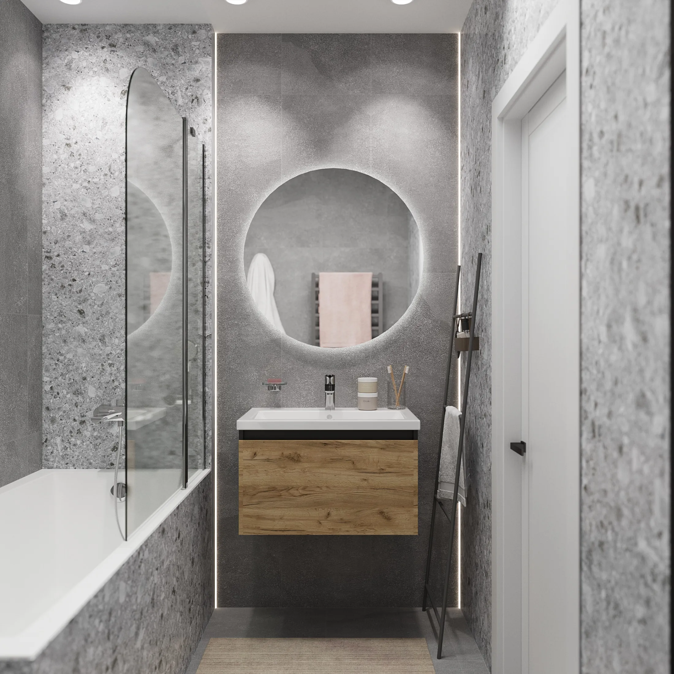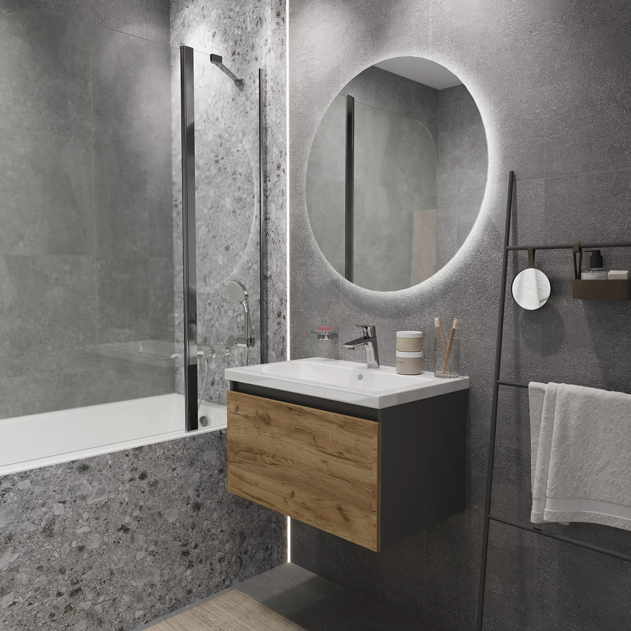 Тумба Aris mini – стильный и простой дизайн модели призван создавать уютное пространство в ванной комнате. Она представлена в двух размерах и благородных цветах: теплый древесный оттенок фасада и глубокий темно-серый корпус.