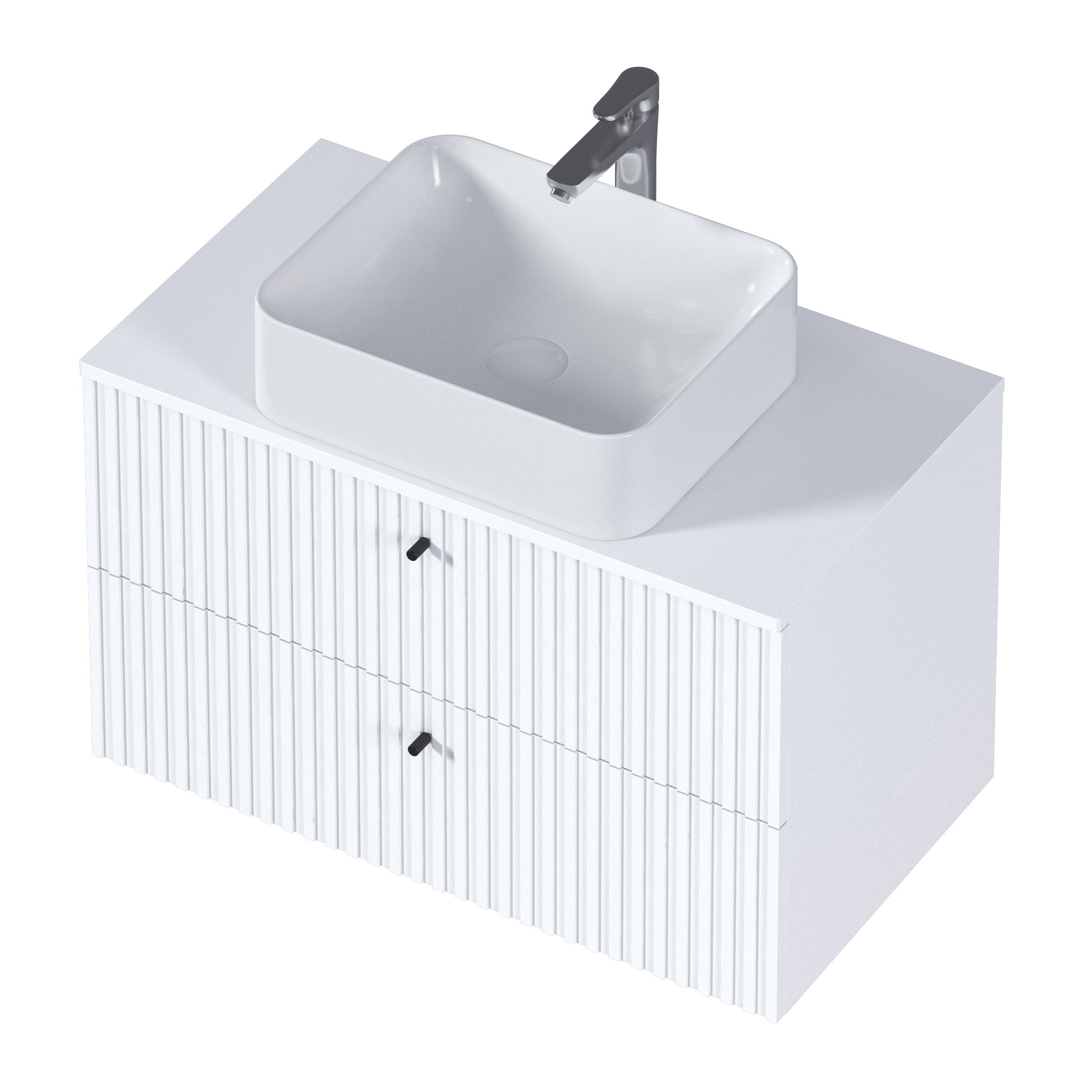 Тумба Desire – изящное решение для интерьера ванной комнаты. Рельефный фасад создает ритмичную игру света и теней. Черные ручки-кнопки контрастируют с белым фасадом и подчеркивают её современный дизайн.