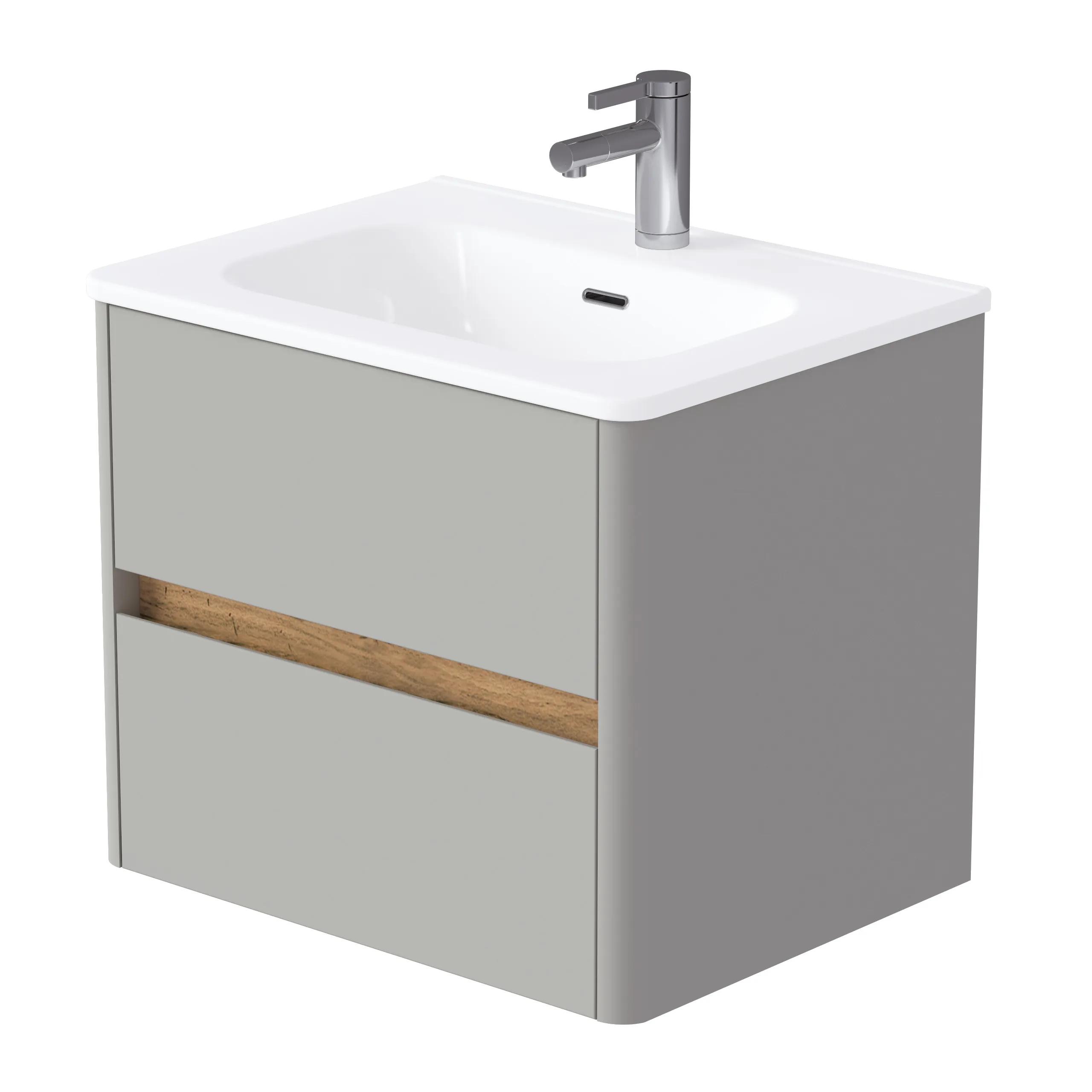 Матовый фасад, интегрированные ручки, керамическая раковина* с широкими бортами для хранения и полки в тон теплому дереву придают интерьеру изящность и подчеркивают его уникальный характер.