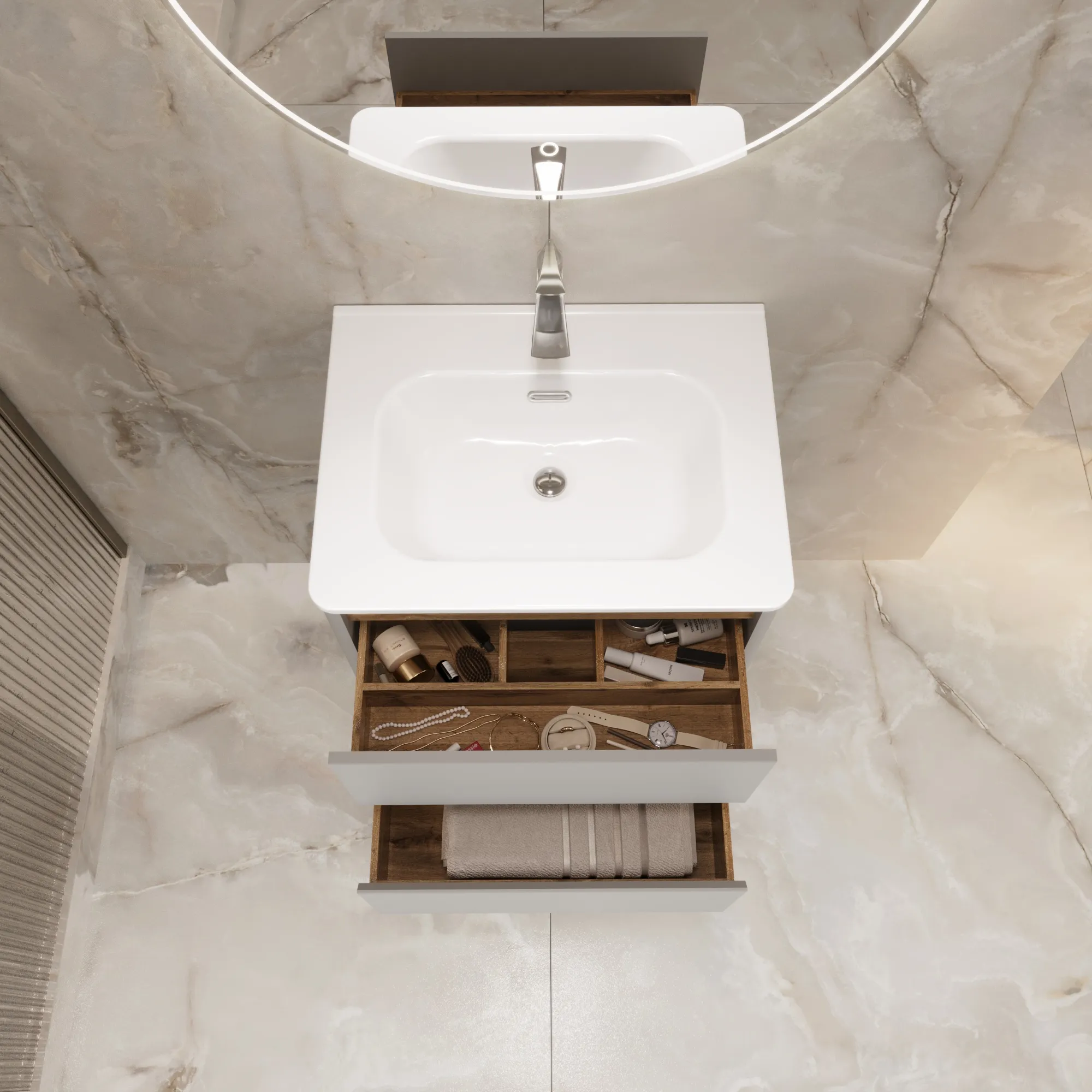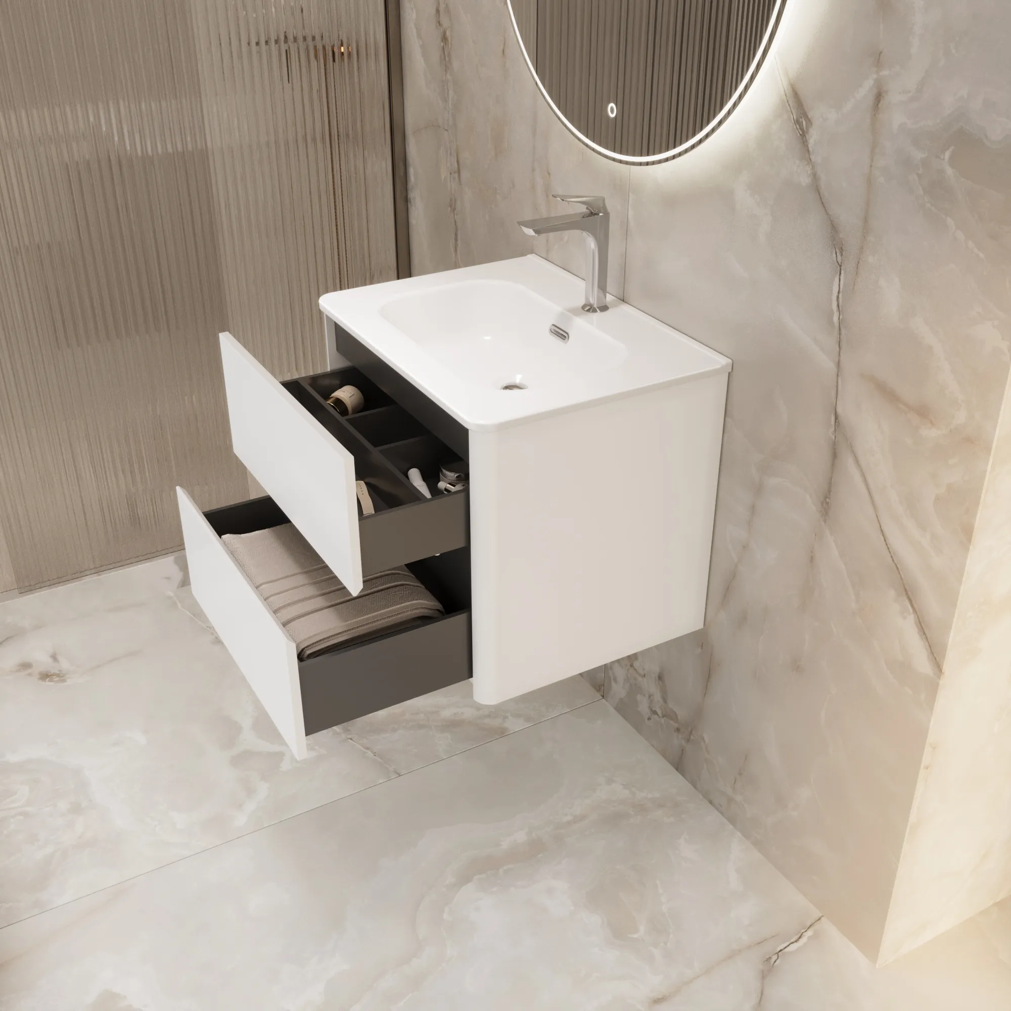 • Материал корпуса и фасада – МДФ, покрытый итальянской матовой эмалью. Благодаря этому тумба сохранит первозданный вид на долгие годы в условиях повышенной влажности.