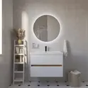 Матовый фасад, интегрированные ручки, белый цвет тумбы придают интерьеру легкости.