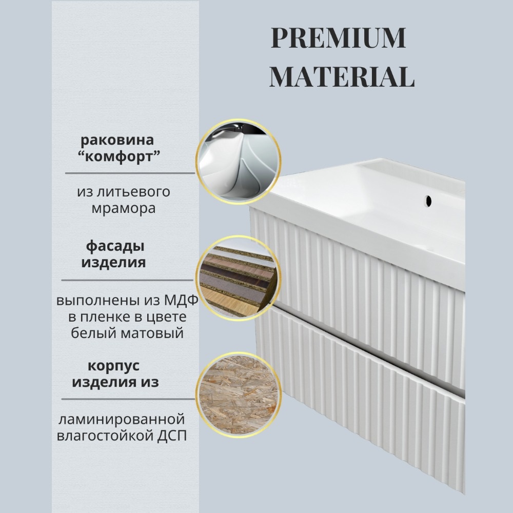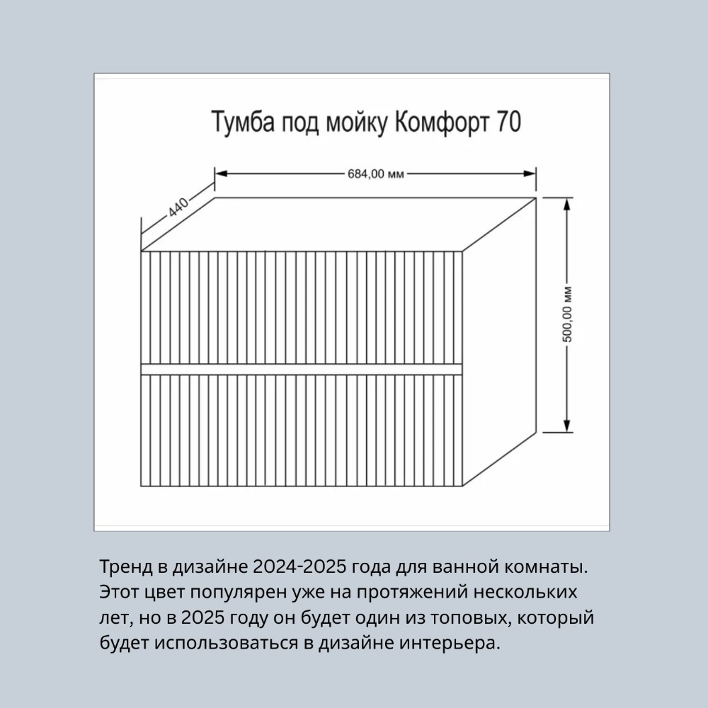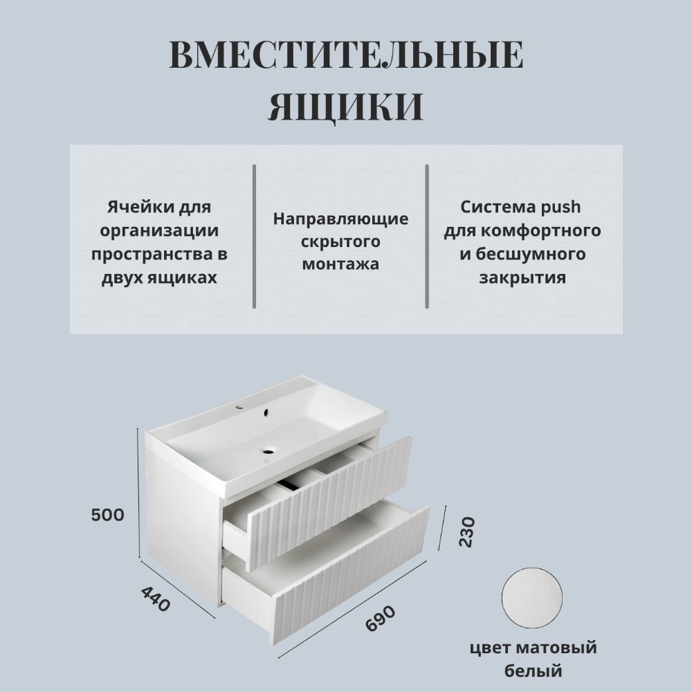 Тренд в дизайне 2024-2025 года для ванной комнаты. Этот цвет популярен уже на протяжений нескольких лет, но в 2025 году он будет один из топовых, который будет использоваться в дизайне интерьера. Тумба Элеганс функционально состоит из двух вместительных ящиков, оснащенных сиситемой PUSH, обеспечивающей надежное комфортное и бесшумное закрывание. Фасады изделия выполнены из МДФ в пленке в цвете белый матовый, корпус из ламинированной влагостойкой ДСП. Верхний и нижний ящики оснащены системой организации пространства, которая позволяет содержать косметические средства в идеальном порядке. Дополняет тумбу стильная раковина.