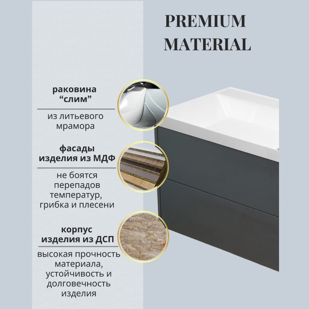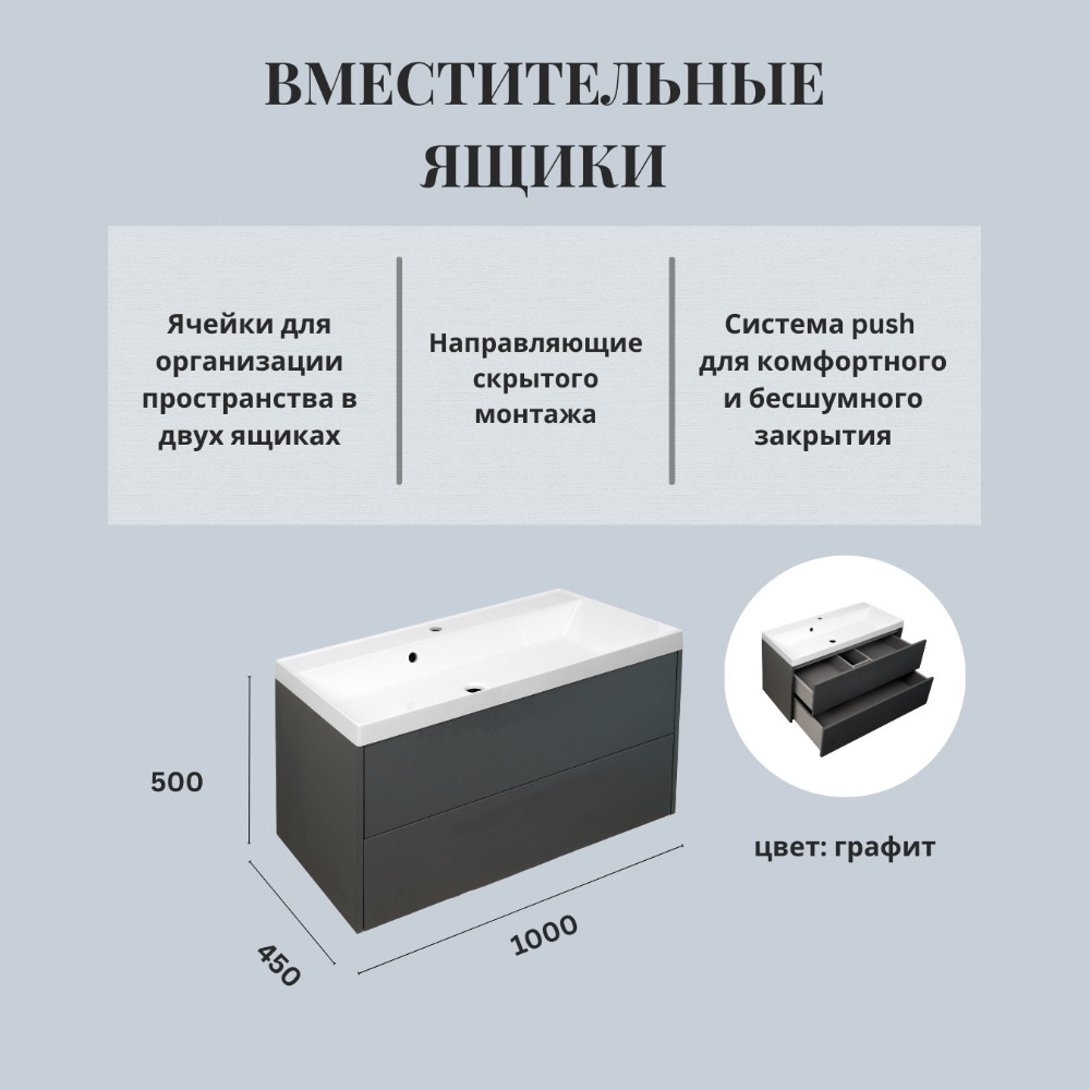 Современная лаконичная подвесная модель тумбы ACWEN МОДЕРН 100 с двумя ящиками имеет ширину 100 см и выполнена в цвете графит матовый. Корпус изготовлен из влагостойкой ЛДСП, а фасад - из высококачественной МДФ. Широкий и вместительный нижний ящик предназначен для крупных предметов, а в верхнем имеется специальная организация пространства, позволяющая хранить мелкие вещи. Ящики снабжены доводчиками и системой бесшумного и плавного закрывания.