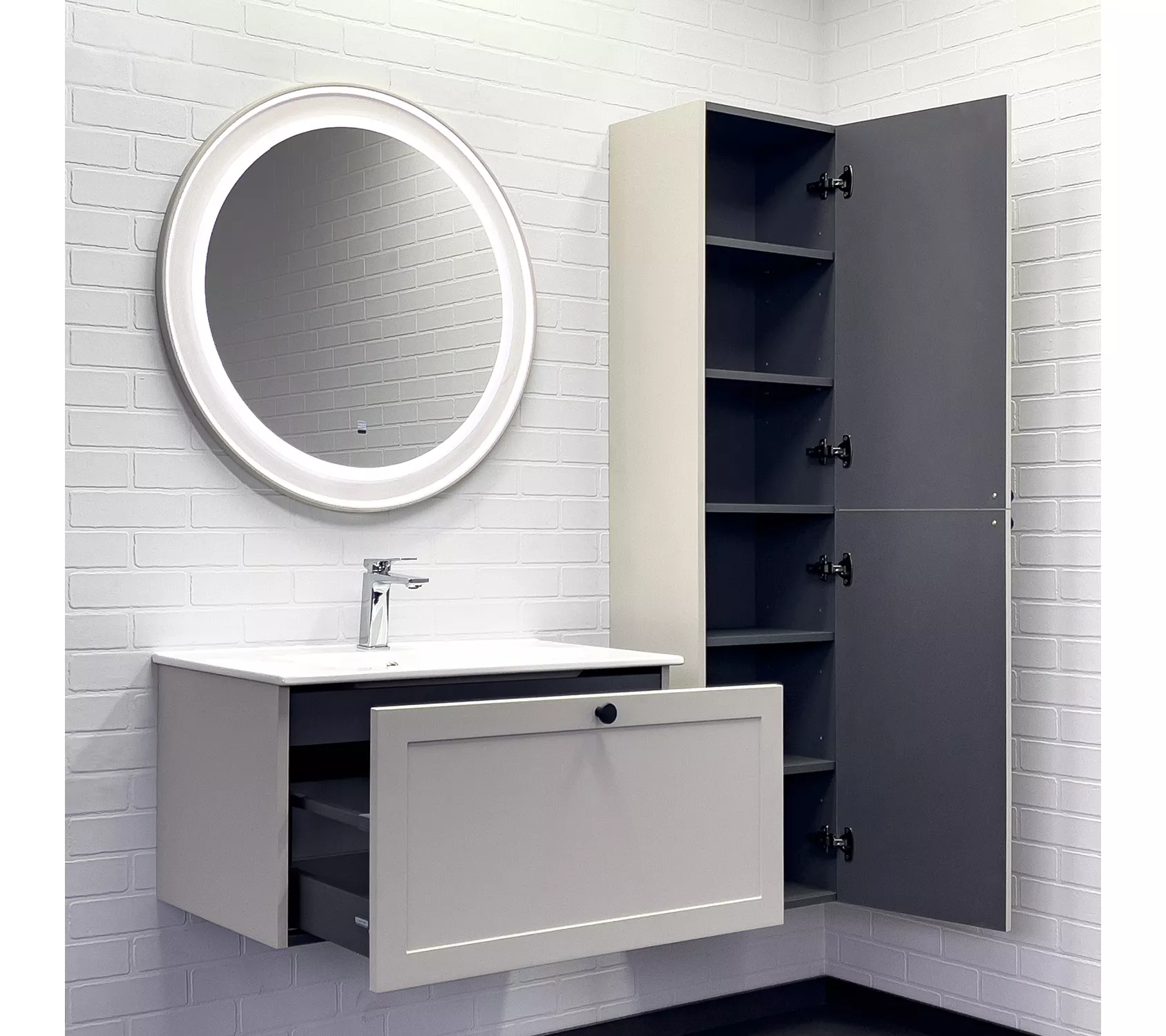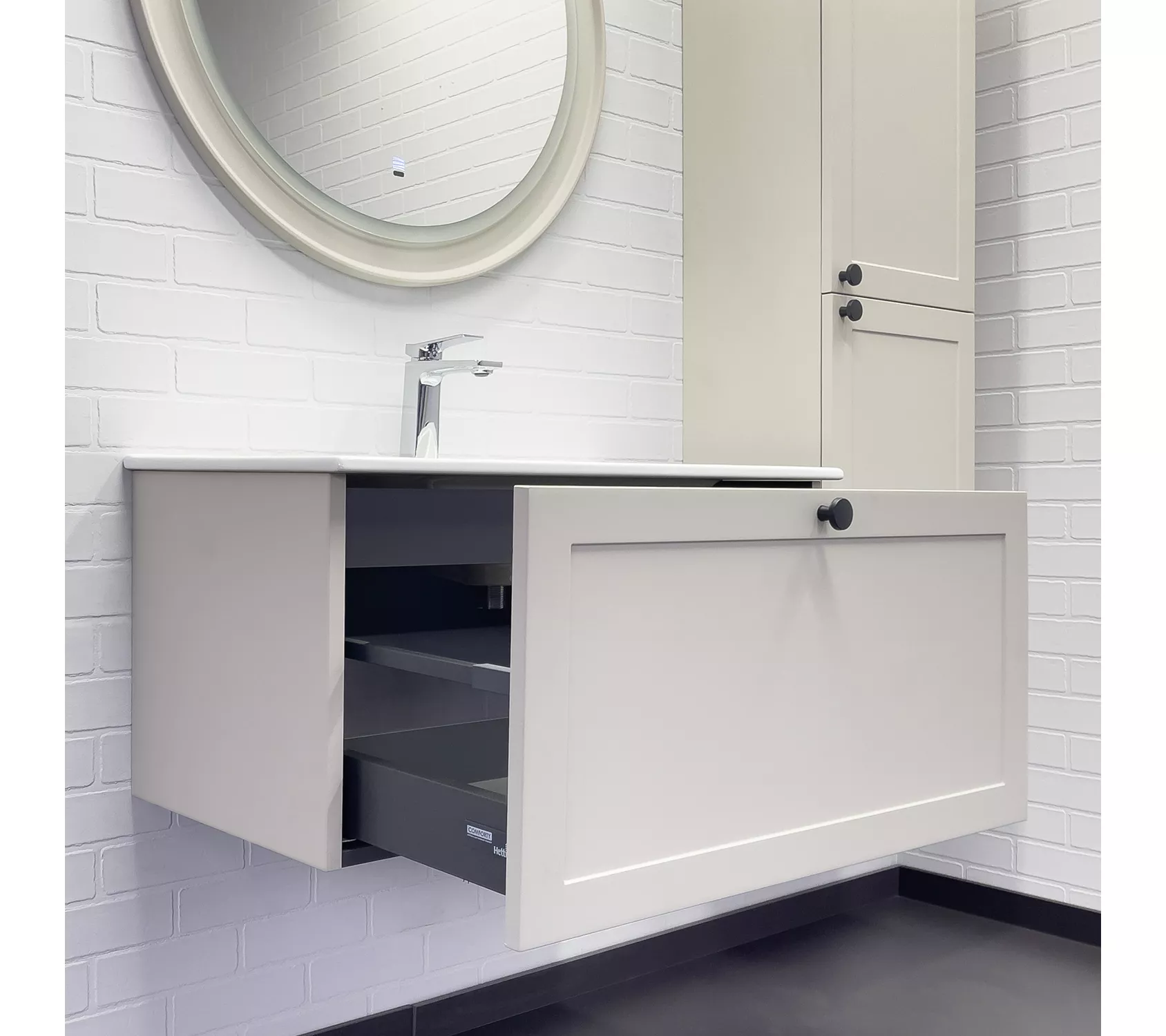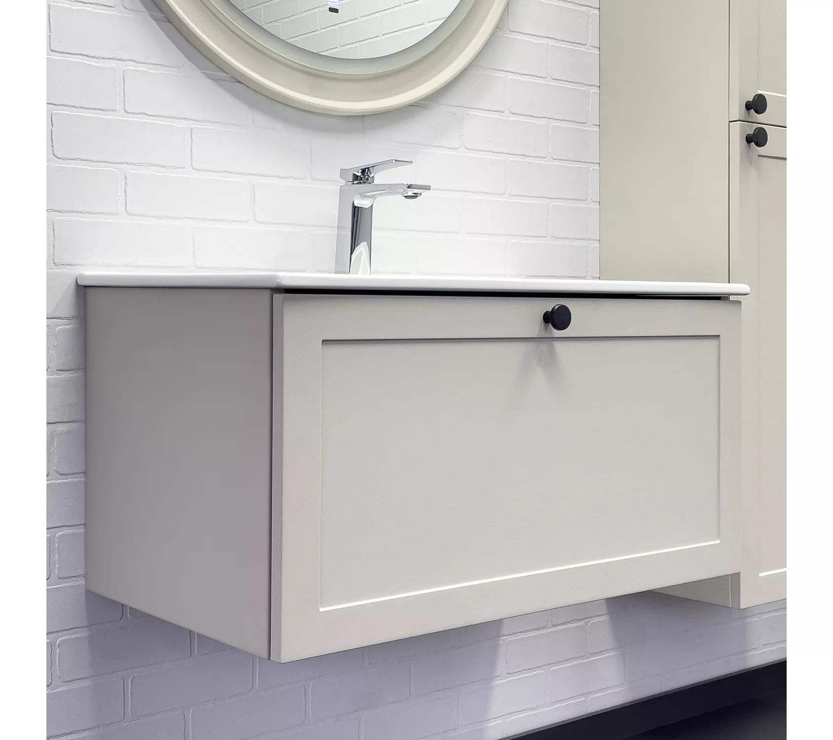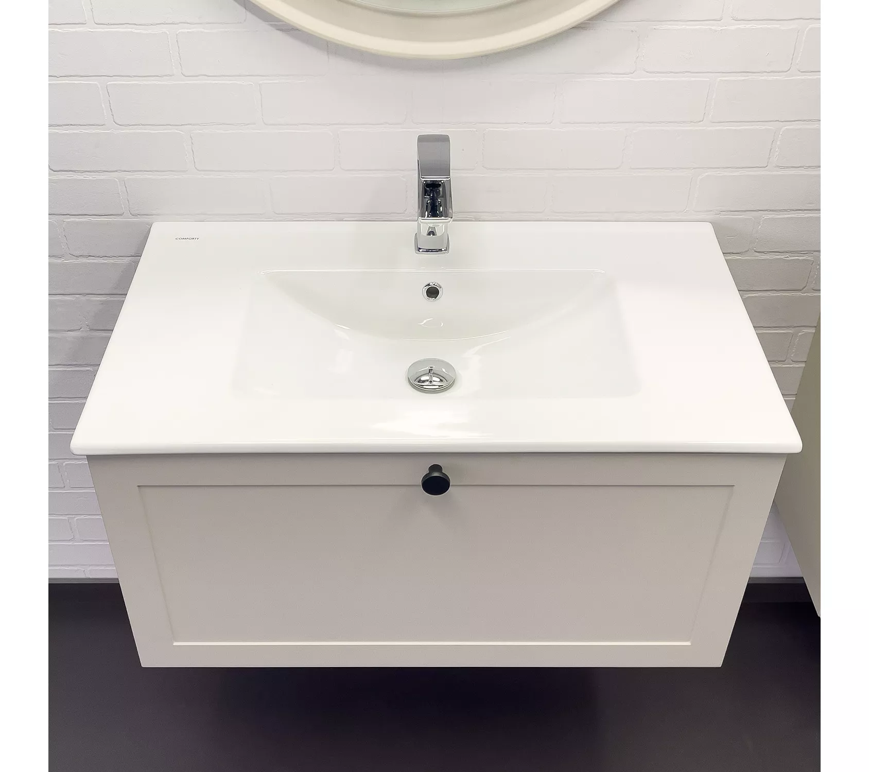 Комплектация: керамическая раковина Comforty  Подвесная тумба с одним выкатным ящиком оборудованным направляющими с системой плавного закрывания. Корпус тумбы изготовлены из влагостойкого ДСП. Фасад тумбы из МДФ фрезерован кантом по периметру. Корпус и фасад тумбы затянуты в матовую пленку цвета "серый шёлк". Тумба подготовлена для подключения водоснабжения снизу и сзади.