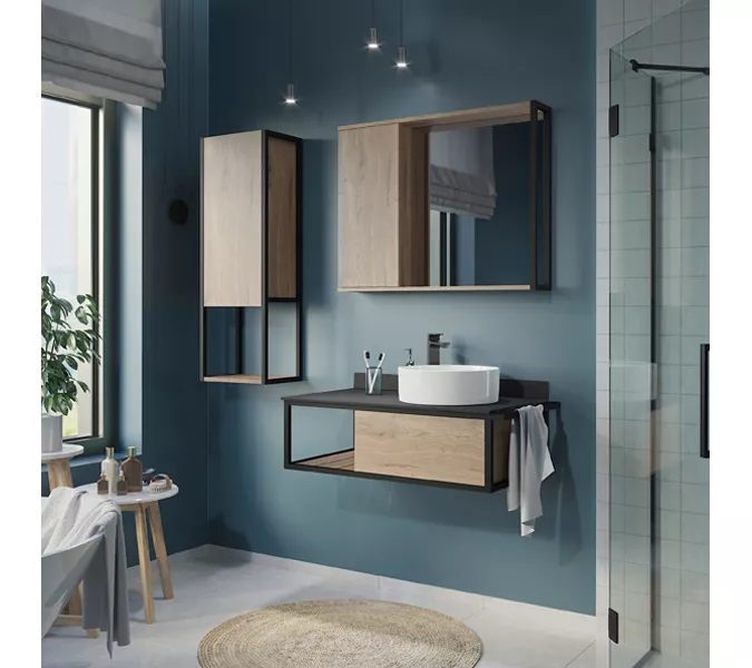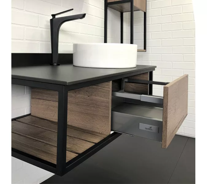 Подвесная консольная тумба-умывальник в стиле лофт. В основе тумбы - каркас из стального профиля окрашенный в цвет черный муар. В каркас интегрирован боковой полотенцедержатель. Керамическая круглая раковина чаша установлена слева на столешнице из черного керамогранита. Боковые стенки и фасад ящика изготовлены из влагостойкого ЛДСП цвета Дуб темный. Ящик тумбы оборудован механизмом push-to-open - открытие при нажатии.
