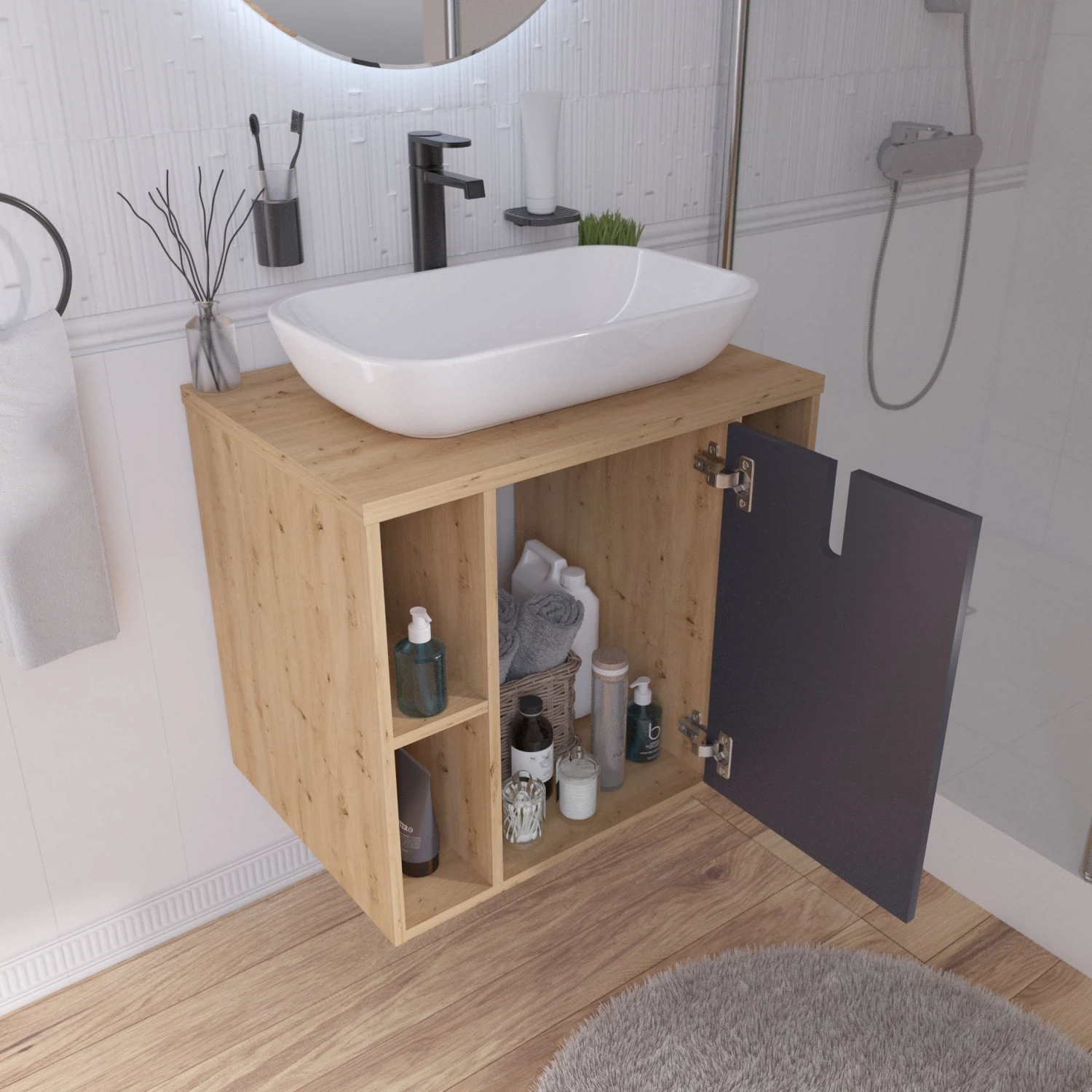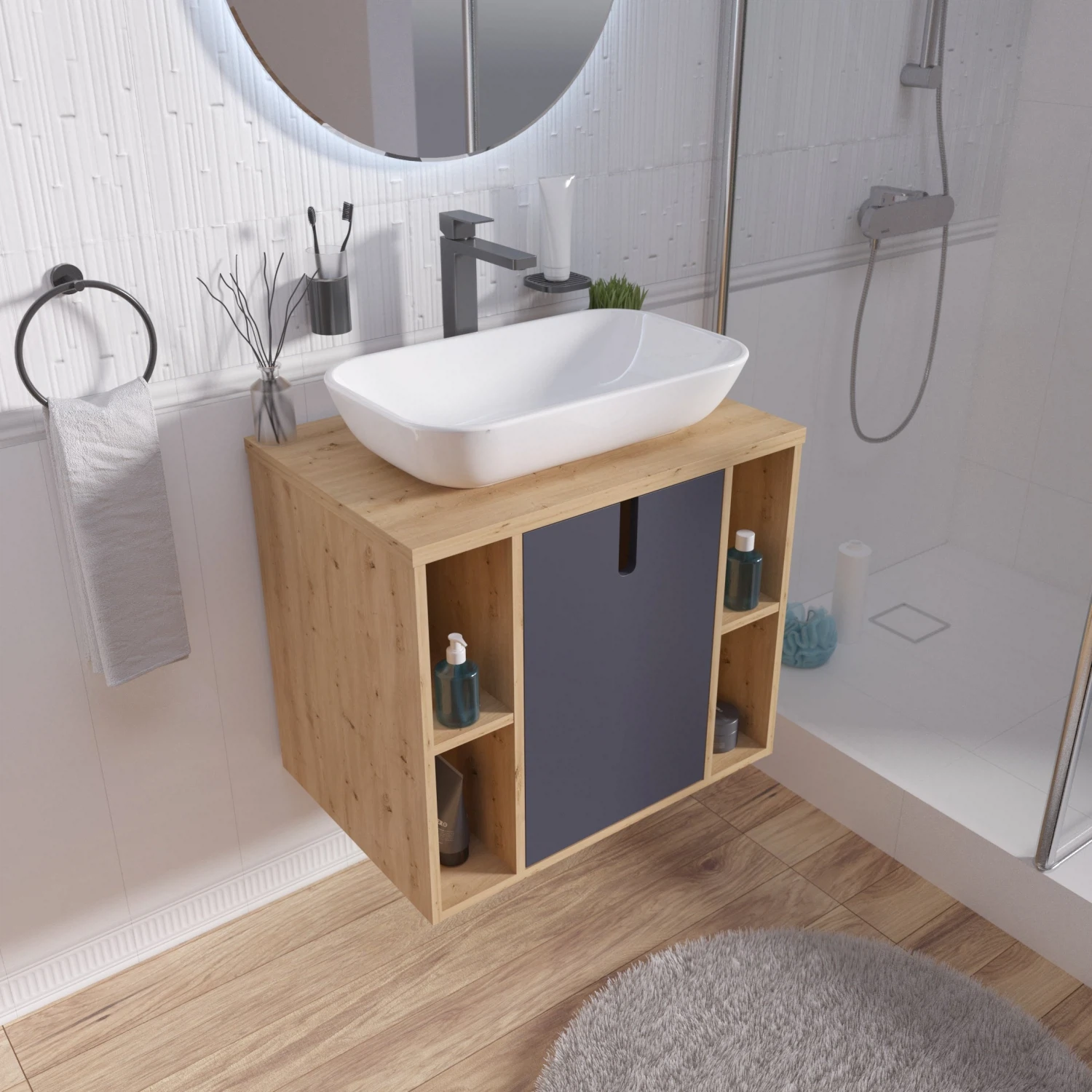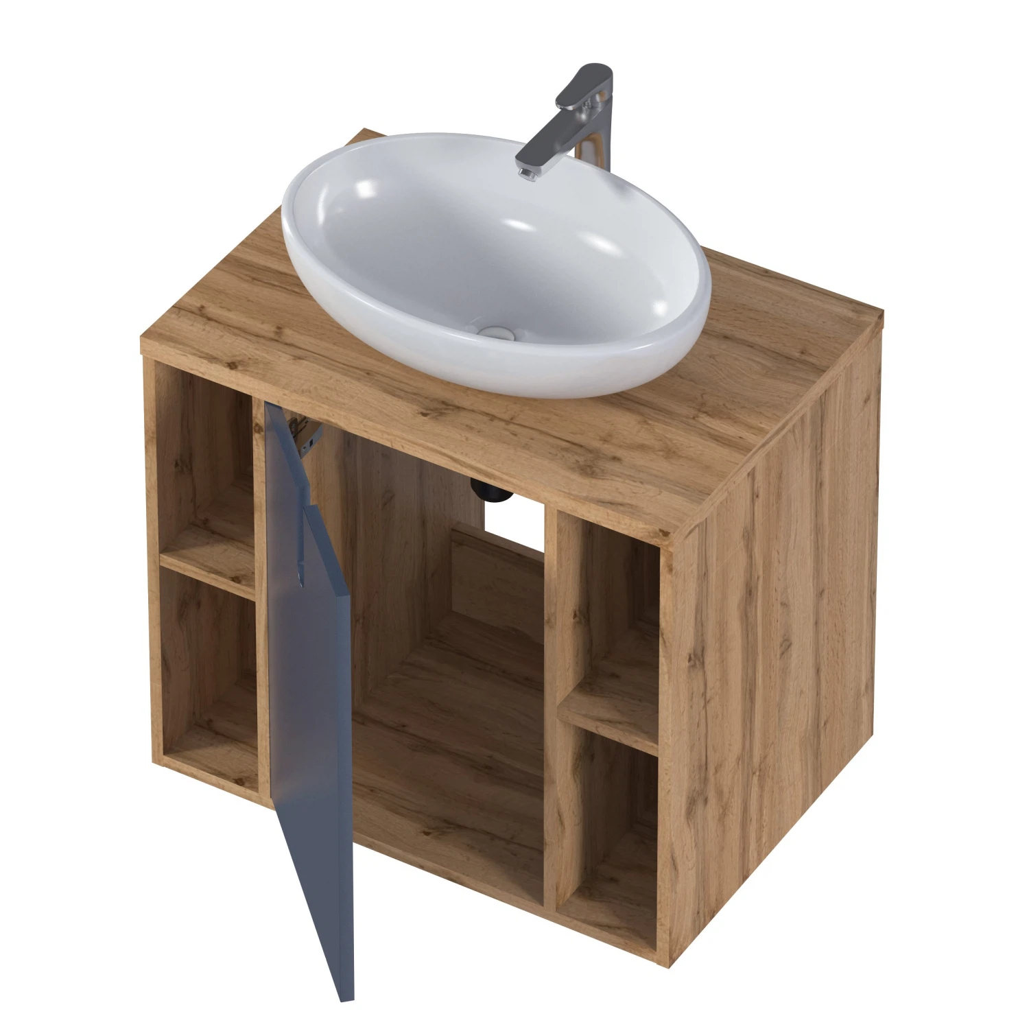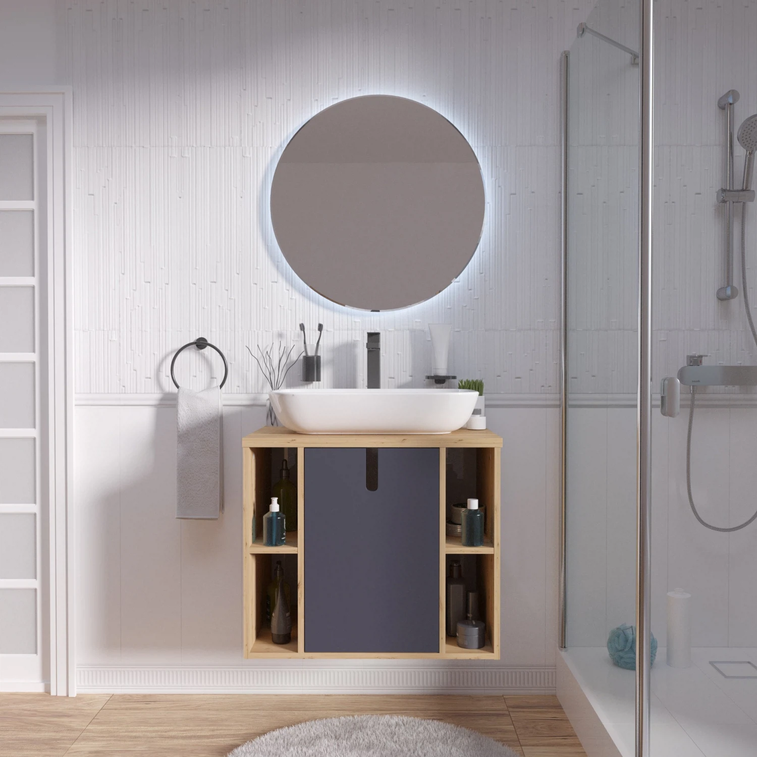 Подвесная тумба под накладную раковину с синим фасадом — удивительное решение для ванной со своей философией. Темно-синий оттенок фасада отражает глубину чувств, мыслей и эмоций. Такой цвет в сочетании с теплым древесным корпусом создает атмосферу внутреннего спокойствия, отдыха и самопознания.
