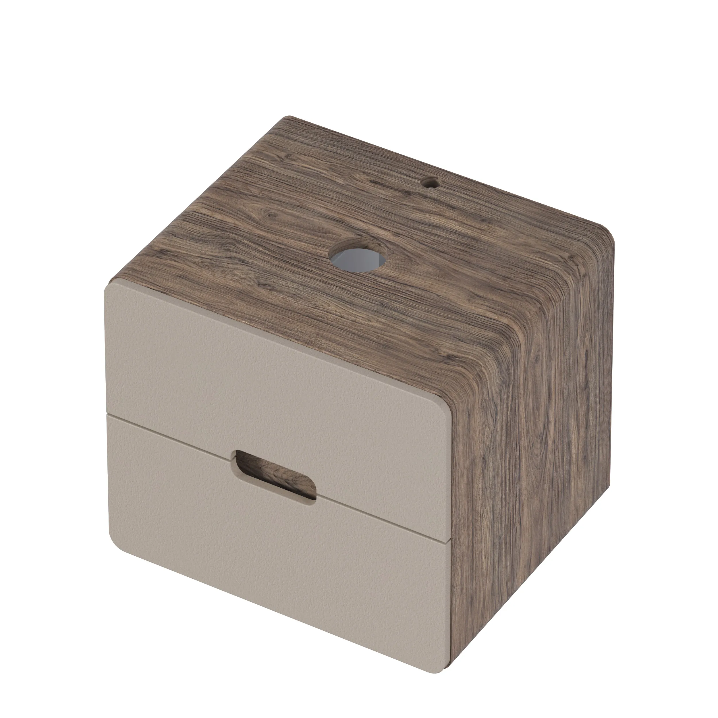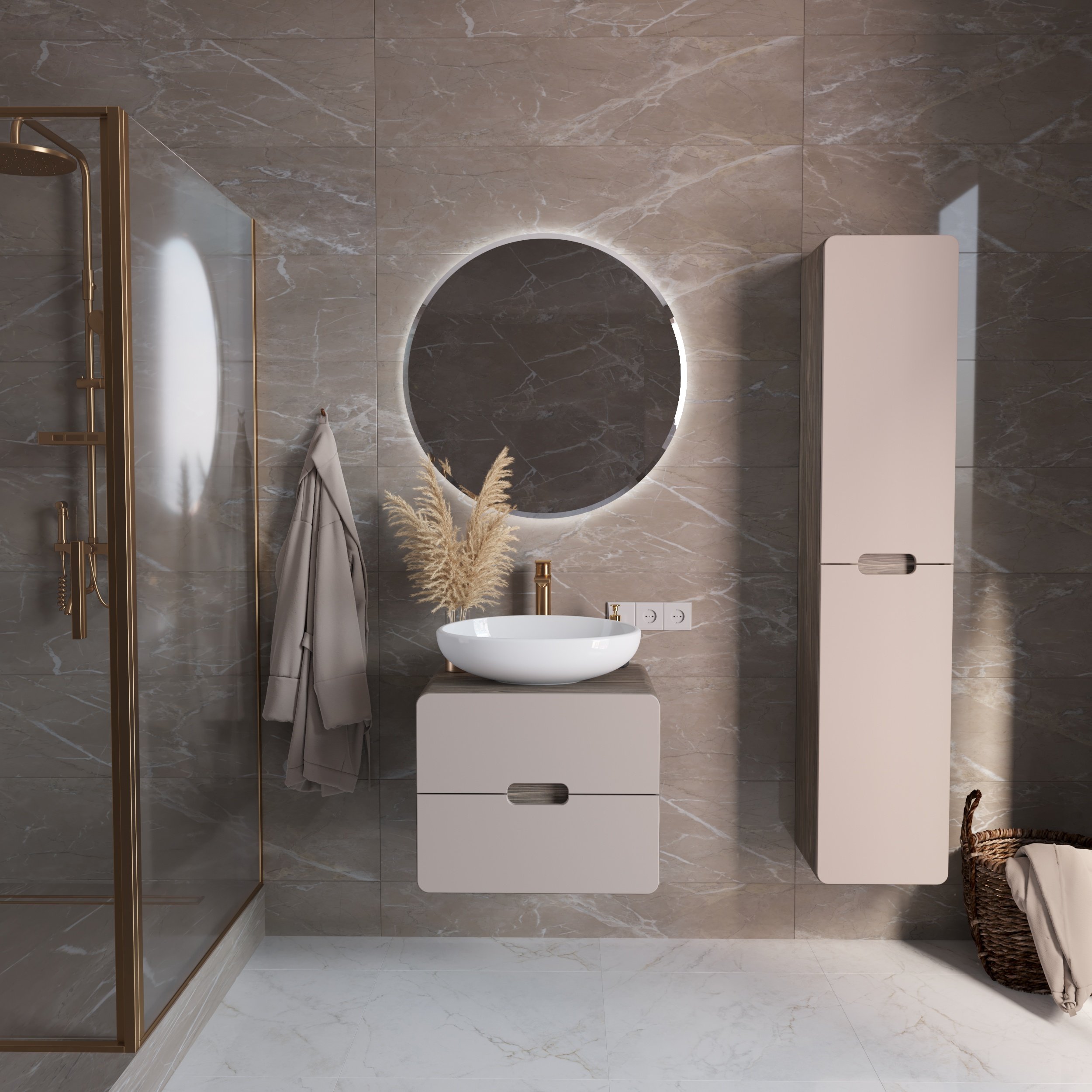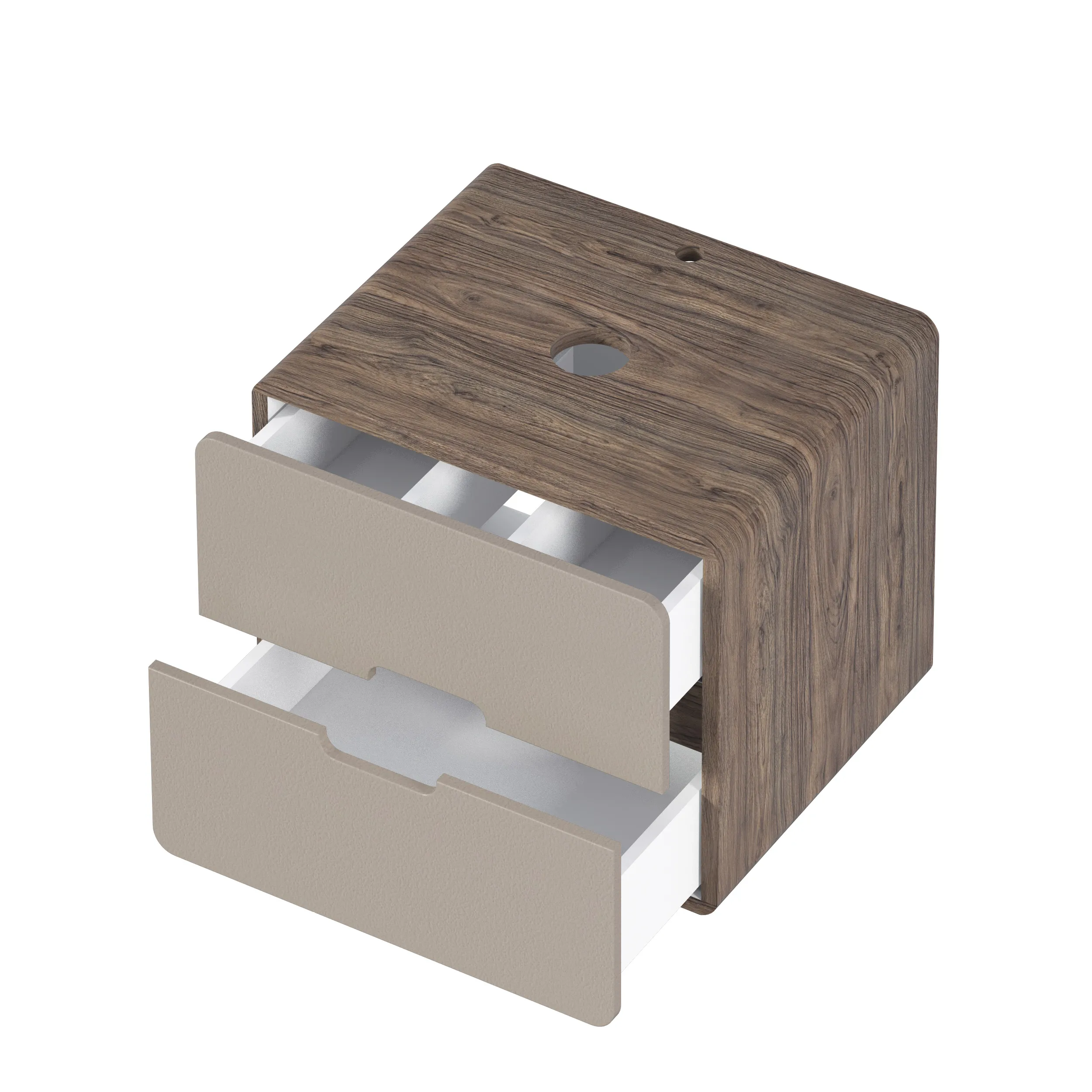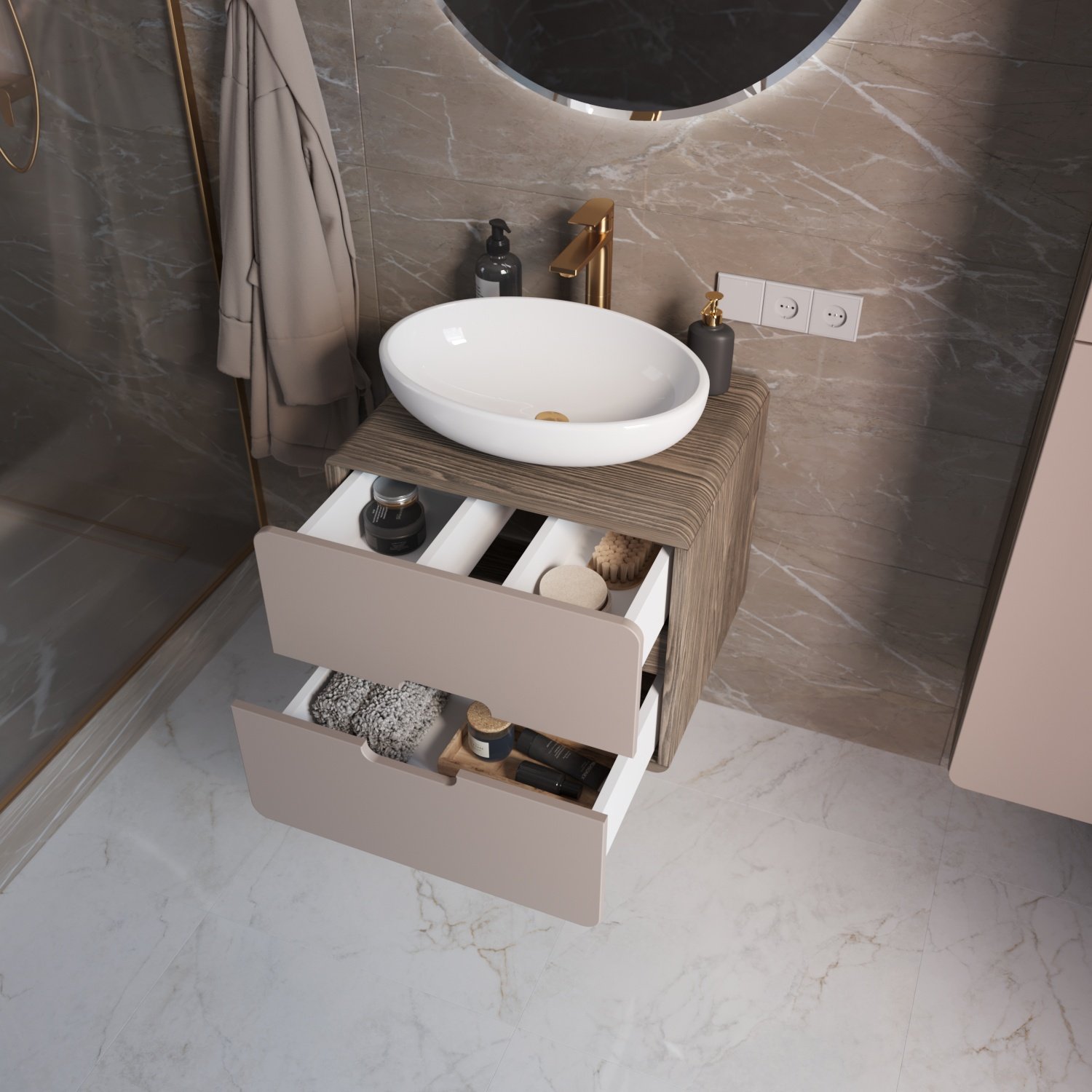 Подвесная тумба под накладную раковину – современное минималистичное решение для ванной. Плавные скругленные углы символизируют гармонию, создают ощущение легкости и безопасности. Это особенно актуально в комнате, где важно чувствовать себя комфортно и расслабленно. Тонкие оттенки кофейного фасада и орехового древесного корпуса воплощают в себе элегантность и теплоту, их сочетание делает ванную идеальным местом для отдыха и ухода за собой.