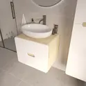 • Подвесной тип крепления облегчает уборку и визуально расширяет пространство. Интегрированные ручки становятся стильным дополнением тумбы.
