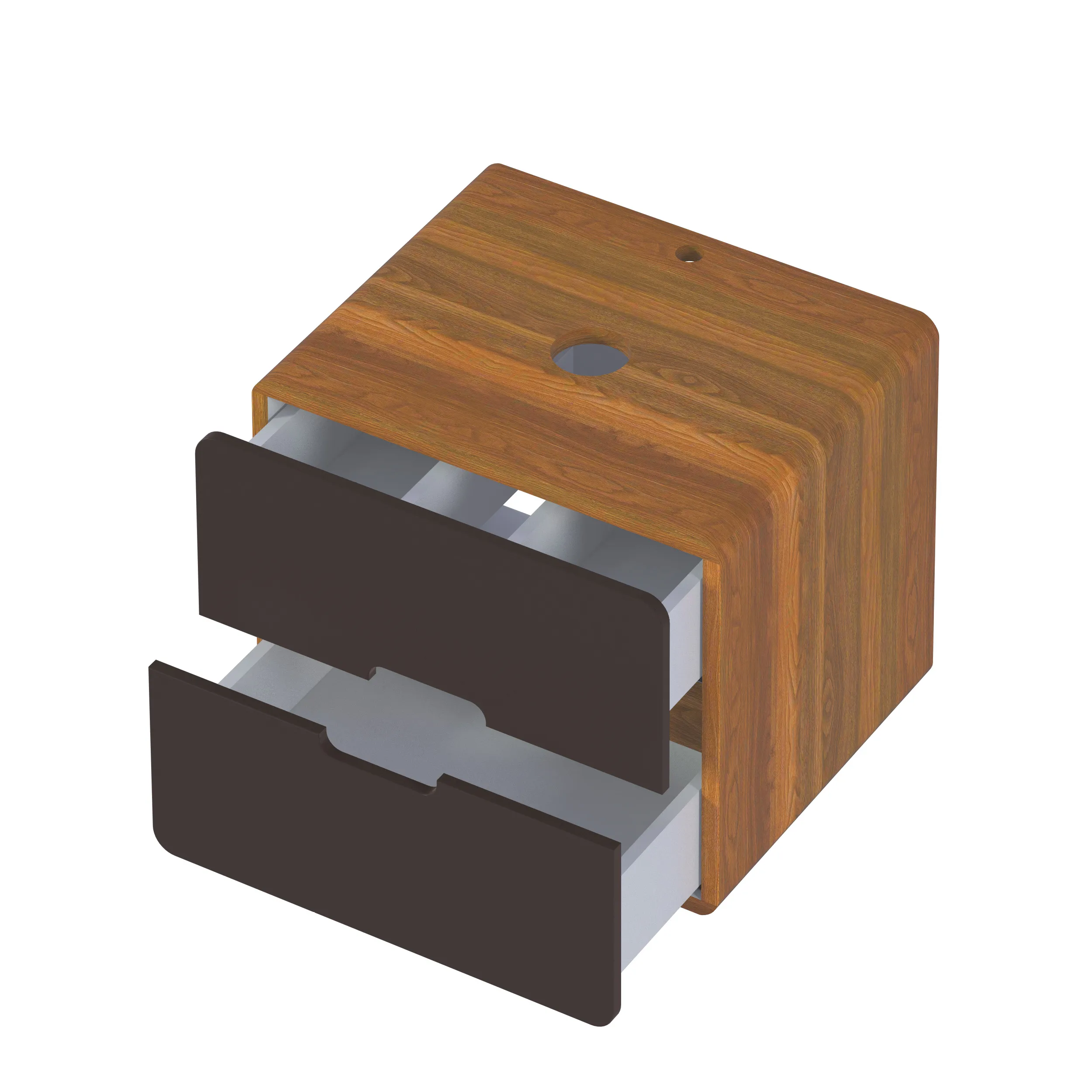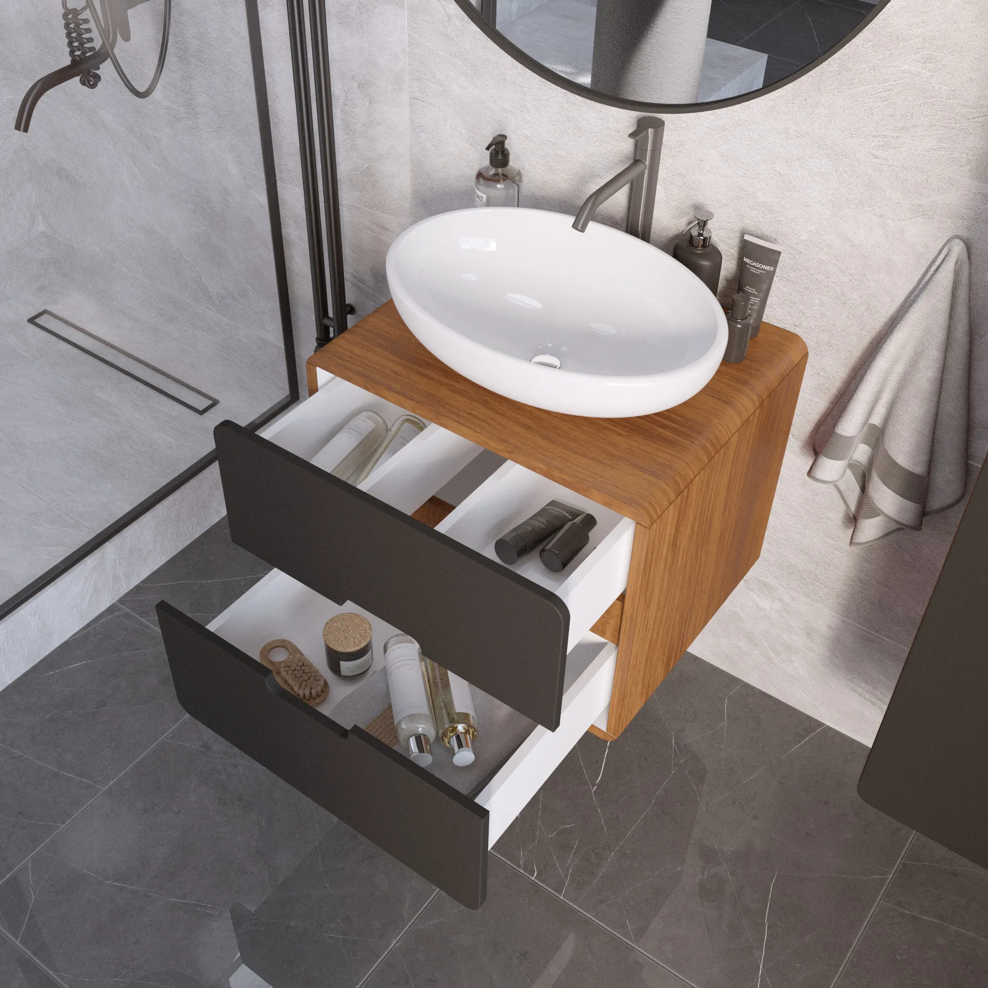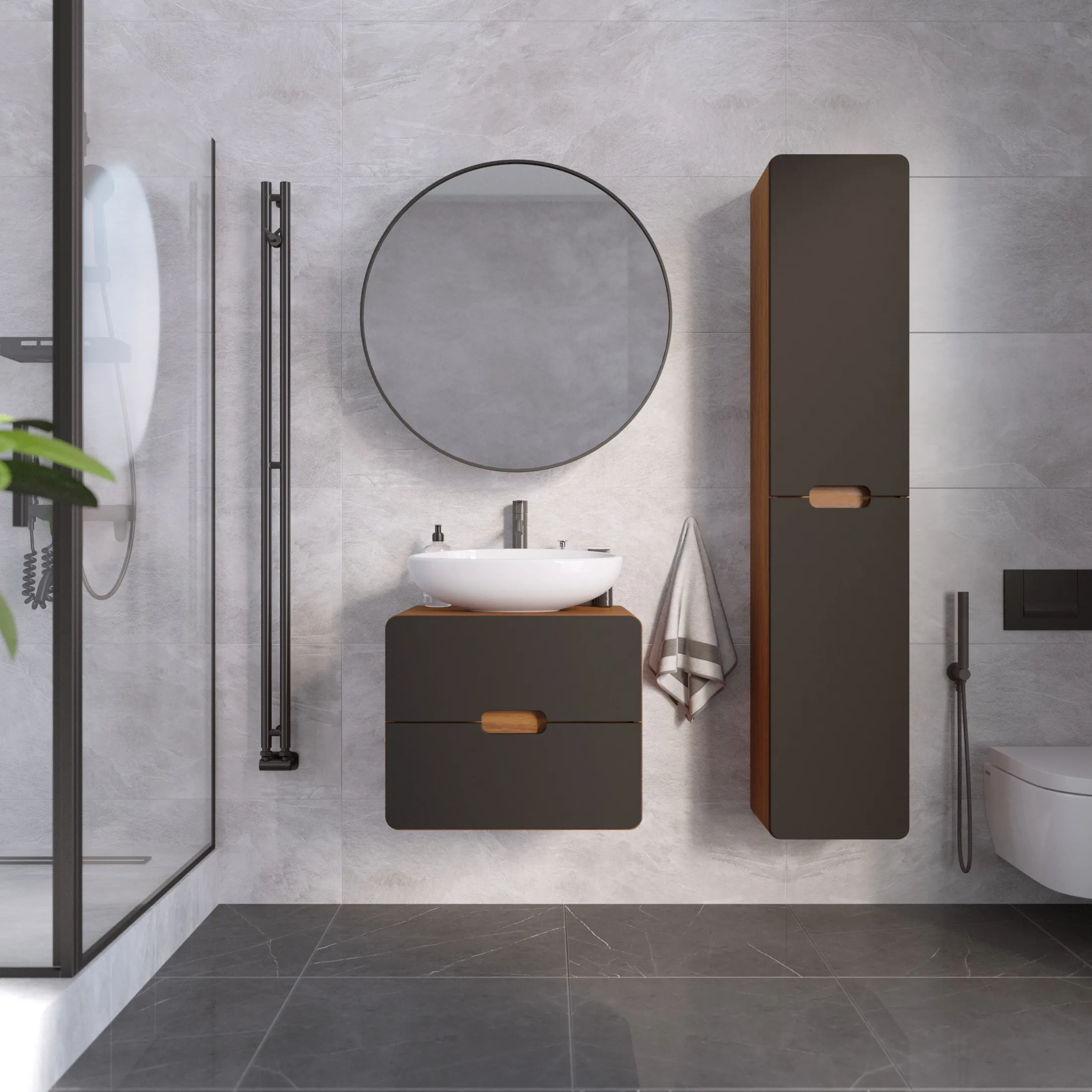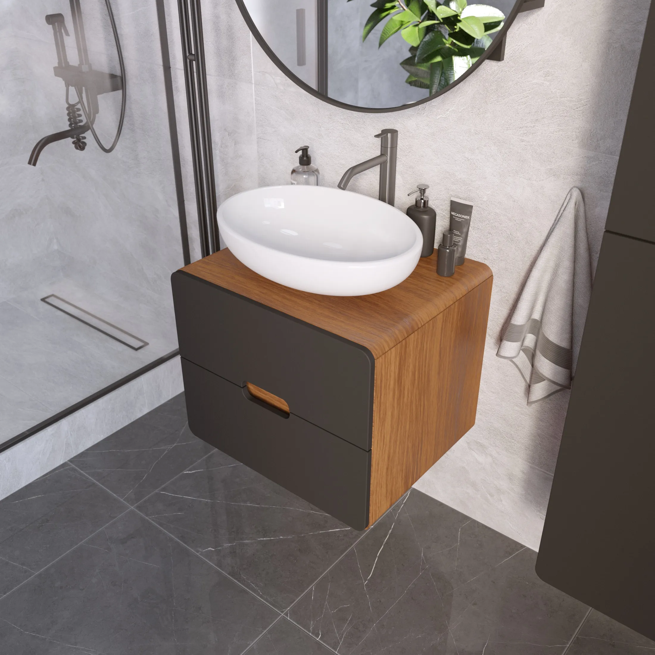 Черная подвесная тумба под накладную раковину – современное минималистичное решение для ванной. Плавные скругленные углы символизируют гармонию, создают ощущение легкости и безопасности. Это особенно актуально в ванной комнате, где важно чувствовать себя комфортно и расслабленно. Черный фасад придает мебели строгость, в то время как древесный ореховый корпус добавляет теплоты и натуральности. Такое сочетание создает контрастный и изысканный интерьер, который подчеркивает индивидуальность комнаты.