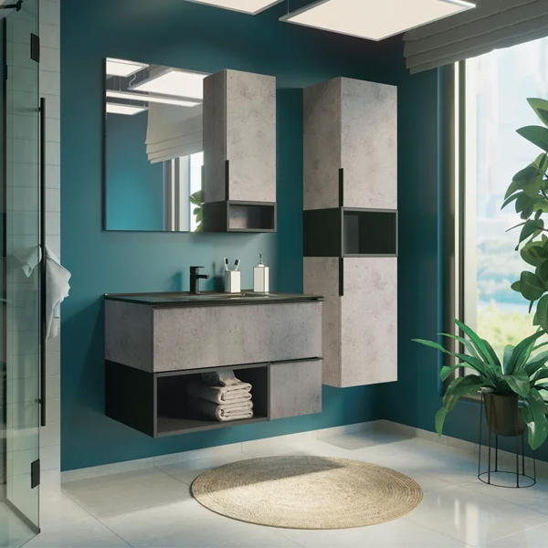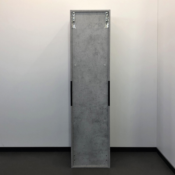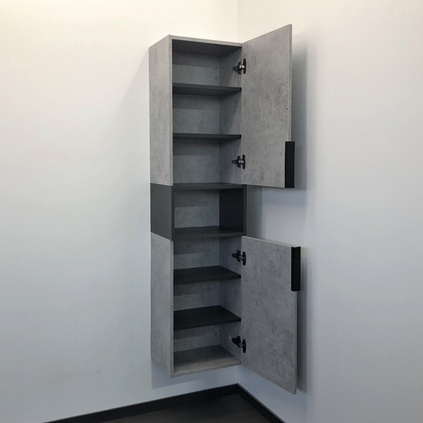 Подвесная шкаф колонна с двумя створками и пространством для открытого хранения. Створки оснащены петлями с плавным закрыванием и черными матовыми алюминиевыми ручками. Фасады из влагостойкого ЛДСП Дуб шоколадно-коричневый. Корпус из влагостойкого ЛДСП дуб шоколадно-коричневый и черный матовый. За створками по две регулируемые по высоте полки. Шкаф-колонна универсальна, может быть подвешена переворачиванием в правом и левом варианте.