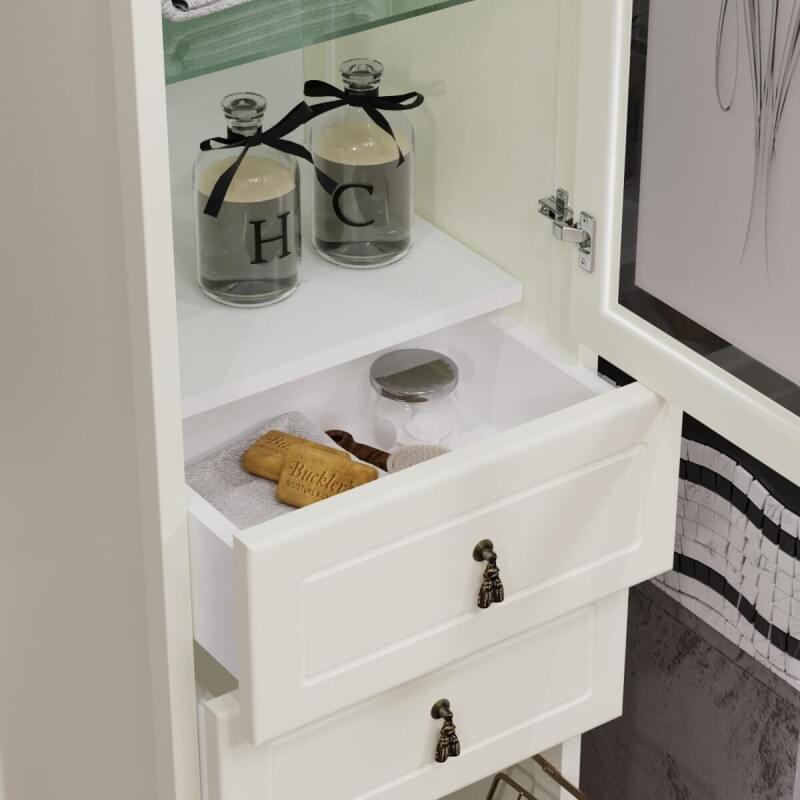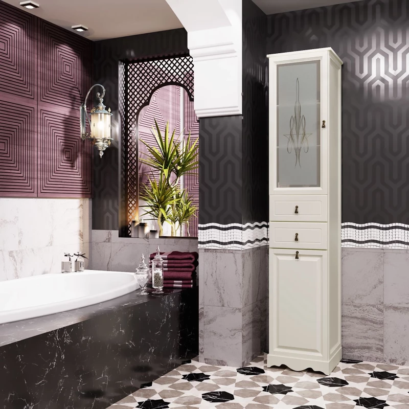 Напольный пенал выполнен в версии: с матовым стеклом (верхняя дверца пенала) для отделок- беленый бук, нижний фасад предлагается с декоративной решеткой и бельевой корзиной .