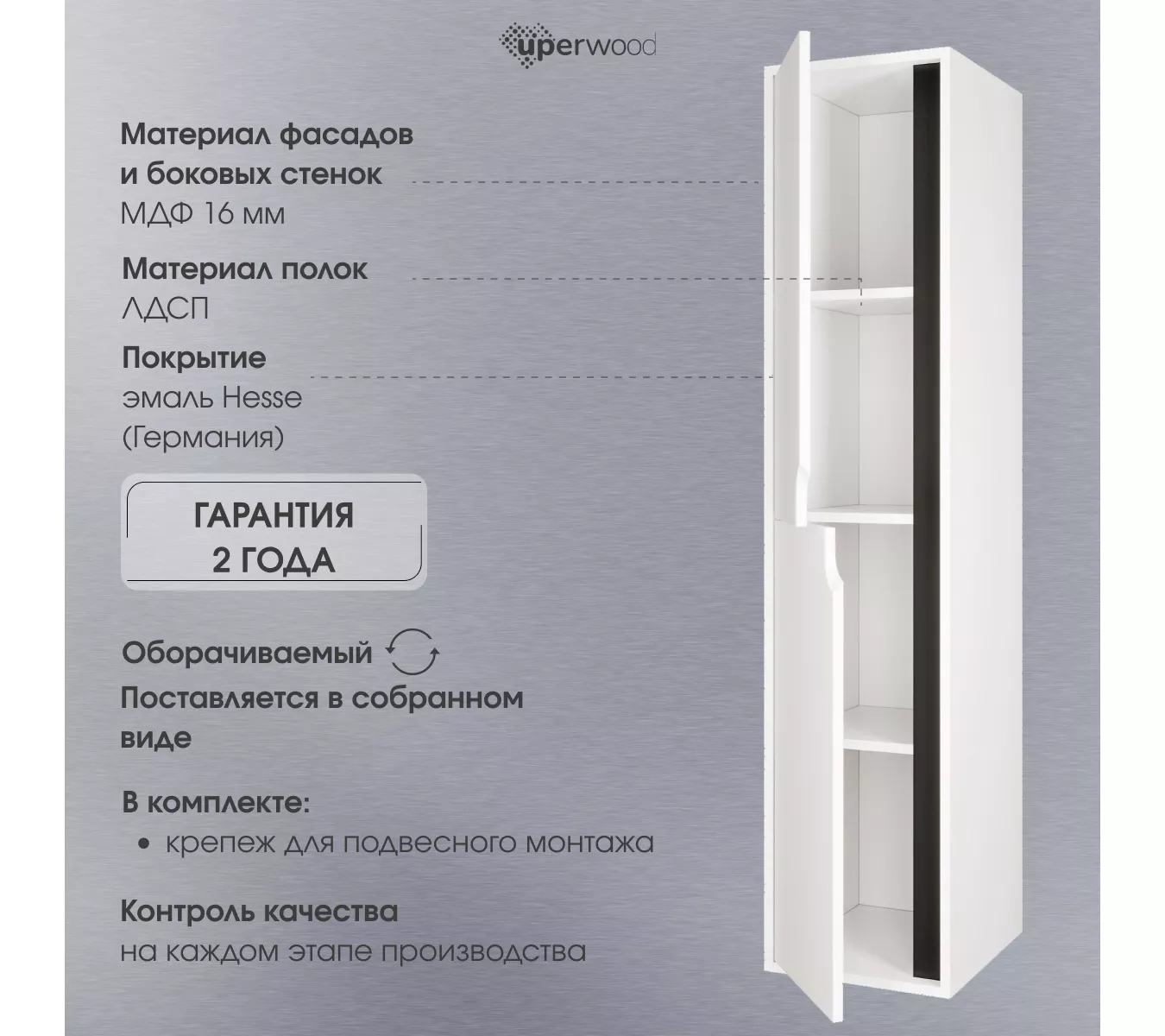 Фурнитура и доводчики премиум-класса.Шкаф-пенал поставляется в собранном виде, в комплект входит крепеж для подвесного монтажа.Настенный пенал для ванной комнаты из коллекции Uperwood Modul отлично дополнит подвесные тумбы Uperwood Modul и обеспечит еще больше вариантов хранинения для ванных принадлежностей.