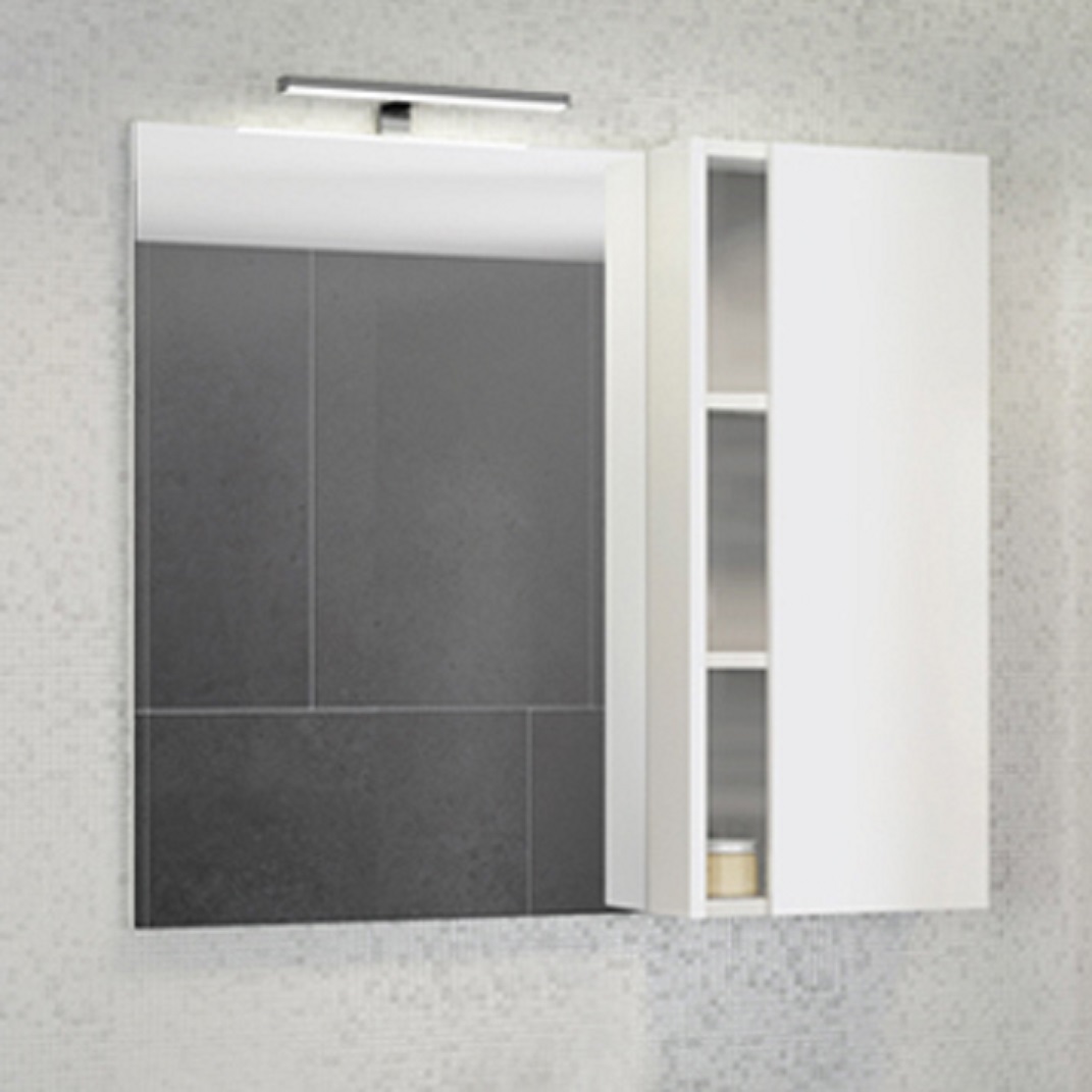 Зеркало-шкаф с одной створкой и пространствами для открытого хранения. Створка оснащена системой плавного закрывания. Две горизонтальные полки продолжаются и за створкой. Фасад покрыт белой глянцевой эмалью
