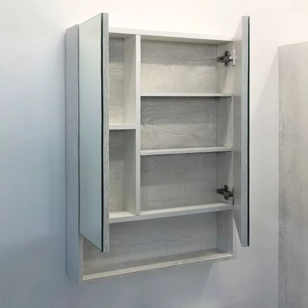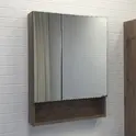 Зеркальное высококачественное полотно с амальгамой на основе серебра. Створки оснащены петлями с плавным закрыванием. Обе боковые створки зеркала открываются наружу. За широкой створкой две горизонтальные полки, за узкой одна. На нижней внешней полке можно расположить невысокие принадлежности для умывания.