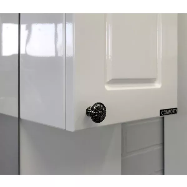 Зеркальное высококачественное полотно с амальгамой на основе серебра. Створка мебельного элемента оснащена петлями с системой плавного закрывания и покрыта эмалью оттенка Слоновая кость. Зеркало оборудовано двумя точечными светильниками и выключателем
