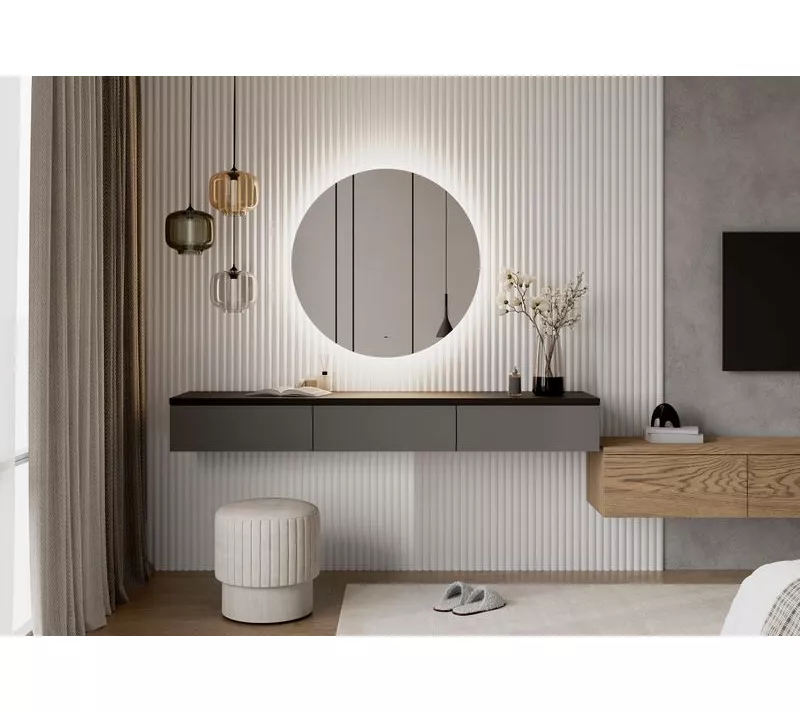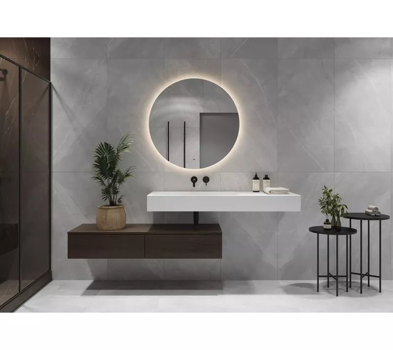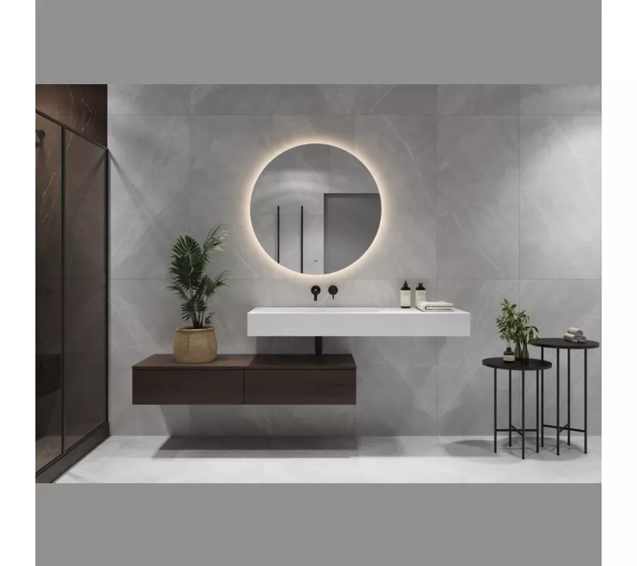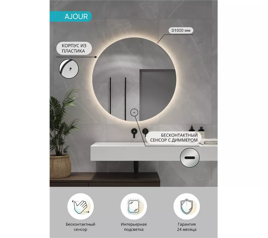 Зеркало "Ajour" имеет круглую форму и оснащено бесконтактным сенсором. Корпус зеркала сделан из пластика, белого цвета. Открытая ореольная подсветка не только добавляет освещение в интерьер, но и создает эффект парящего зеркала. Подсветку можно легко включить простым движением руки на расстоянии до 5 см от бесконтактного сенсора.
