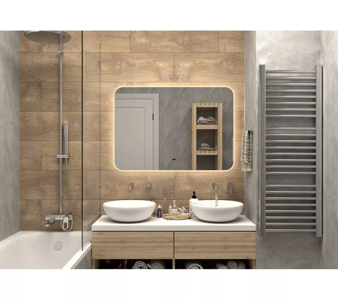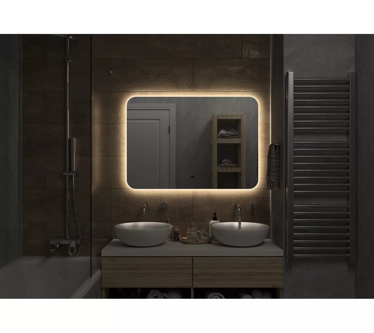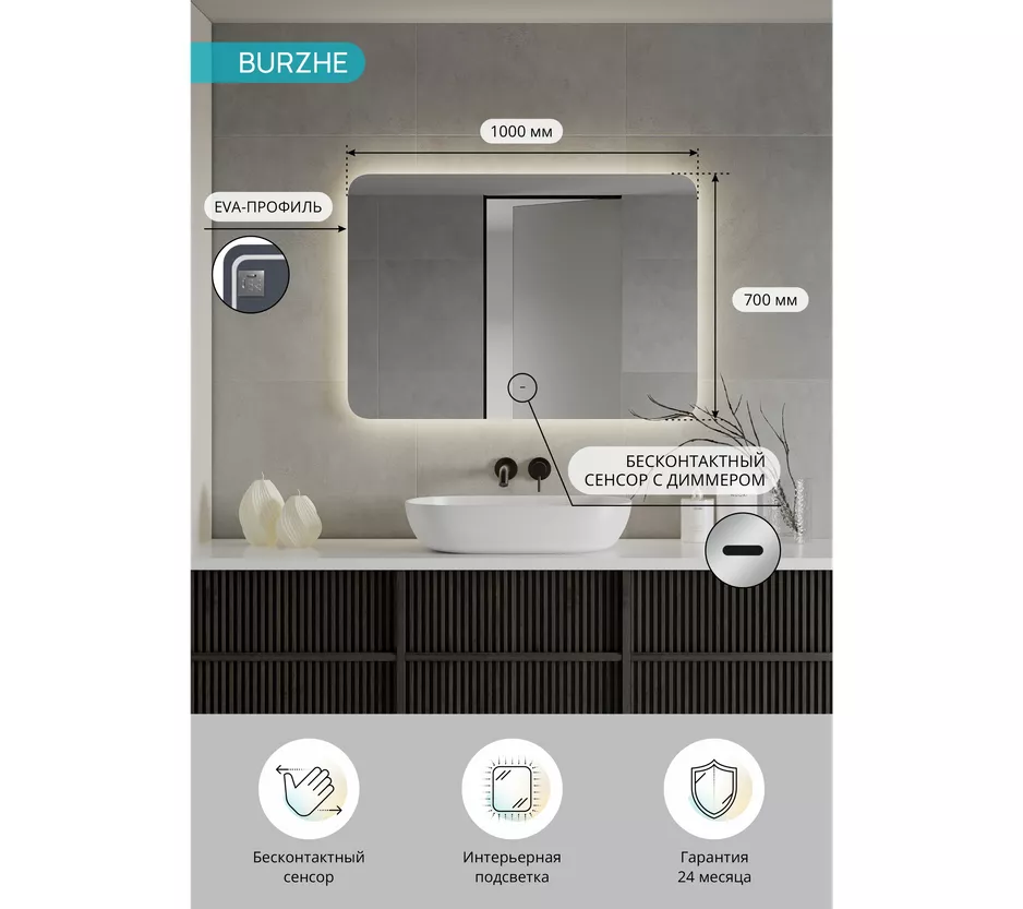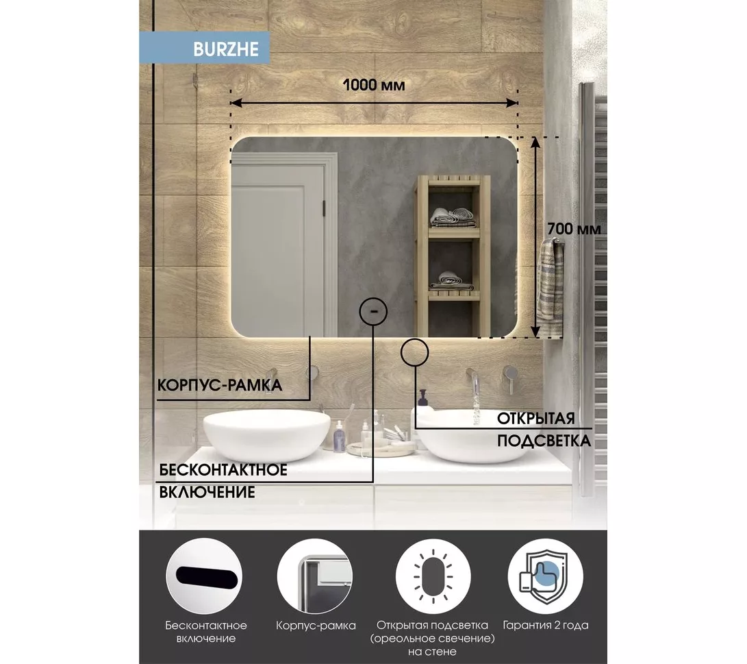 Зеркало "Burzhe" прямоугольной формы с плавно скругленными углами и бесконтактным сенсором. Корпус зеркала изготовлен из белого МДФ, что придаёт ему современный и элегантный вид. Открытая ореольная подсветка обеспечивает дополнительное освещение в интерьере, создавая эффект парящего зеркала. Включить подсветку можно простым движением руки на расстоянии до 5 см от бесконтактного сенсора, что делает его использование особенно удобным. Это зеркало не только является стильным и функциональным элементом вашего интерьера, но и придаёт помещениям уникальности. Оно акцентирует внимание на красоте вашего пространства и формирует атмосферу уюта, а качественное освещение значительно упрощает повседневные процедуры, делая их более комфортными и приятными.