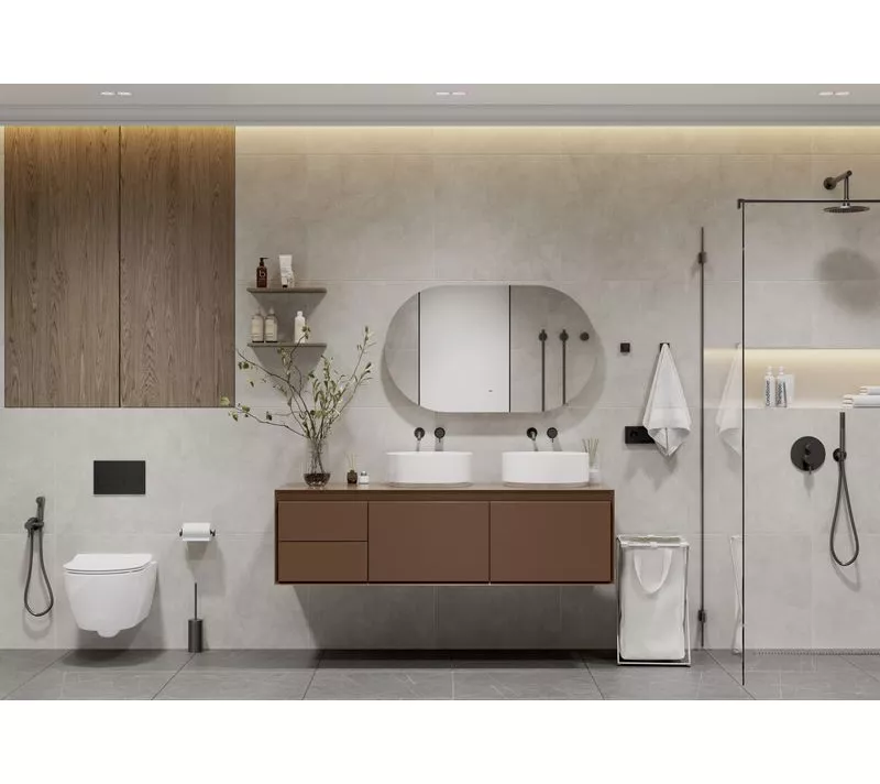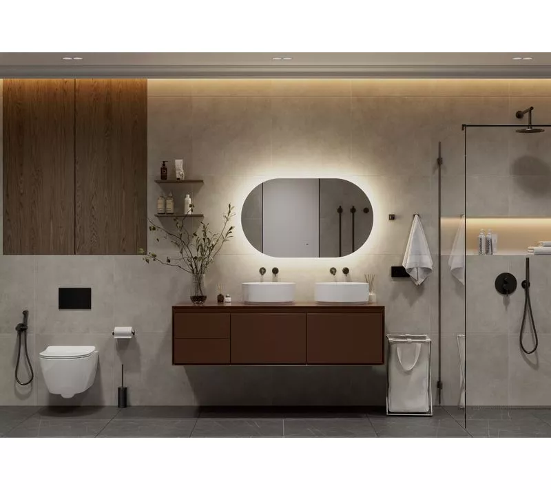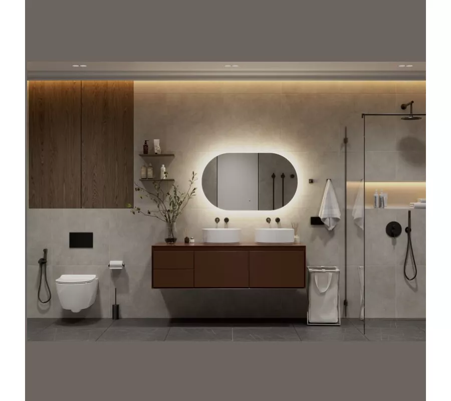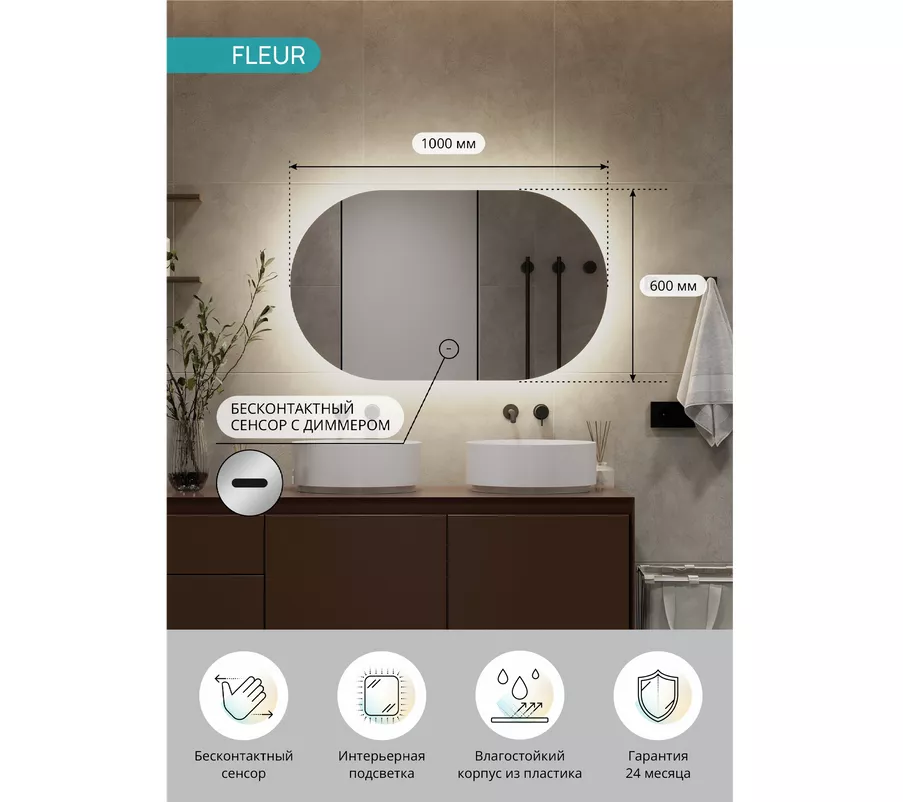 Зеркало "Fleur" с бесконтактным сенсором обладает вытянутой овальной формой, которая придаёт интерьеру утонченность и современную элегантность. Корпус выполнен из белого пластика, что делает его легким и изящным. Открытая ореольная подсветка создает эффект парящего зеркала и наполняет пространство дополнительным светом. Для активации подсветки достаточно простого движения руки на расстоянии до 5 см от сенсора, что обеспечивает удобство в использовании. Это зеркало не только стильный элемент, но и функциональное дополнение, которое придает вашему пространству уникальность. Оно подчеркивает красоту интерьера, создавая атмосферу уюта, а качественное освещение делает повседневные процедуры более приятными и легкими.
