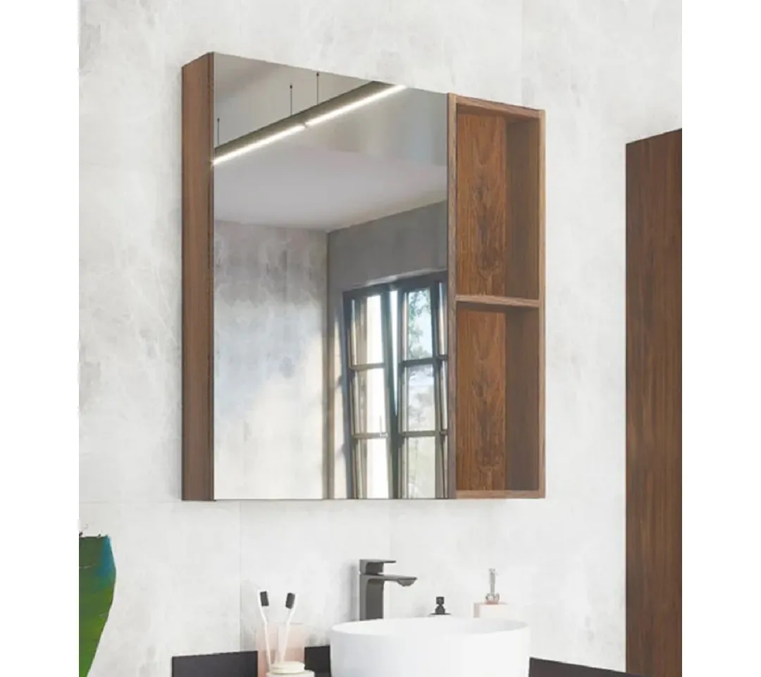 Подвесное зеркало-шкаф. Створка оснащена петлями с плавным закрыванием. Высококачественное зеркальное полотно с амальгамой на основе серебра. Корпус зеркального шкафа выполнен из влагостойкого ЛДСП. Название: Шкаф-зеркало Артикул: 00-00009323CF Цвет: дуб темно-коричневый Габариты (ШхВхГ): 485*800*140 мм За створкой две горизонтальные полки. Петли у створки снаружи. Зеркало-шкаф универсально - может быть подвешено в правом и левом варианте. Инструкция для мебели для ванных комнат COMFORTY