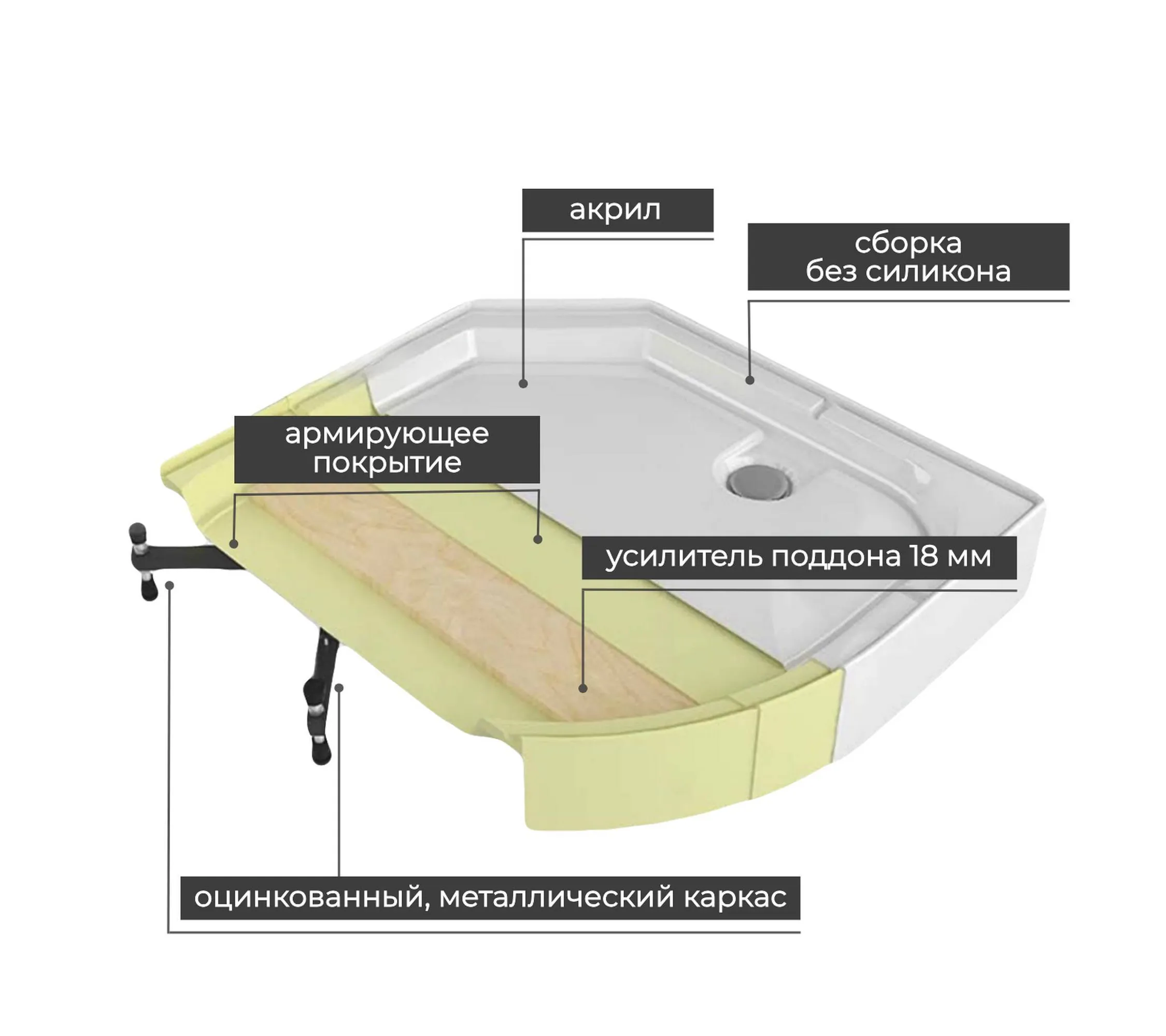 Съемный экран поддона (позволяет осуществлять подключение и ревизию сифона).Двойные металлические ролики дверей (распределение нагрузки на два ролика, увеличивают срок службы).