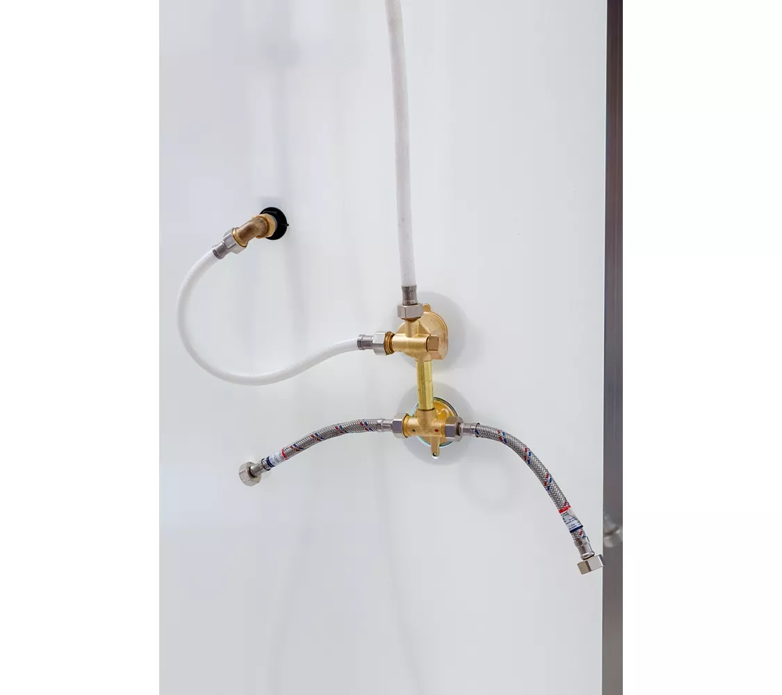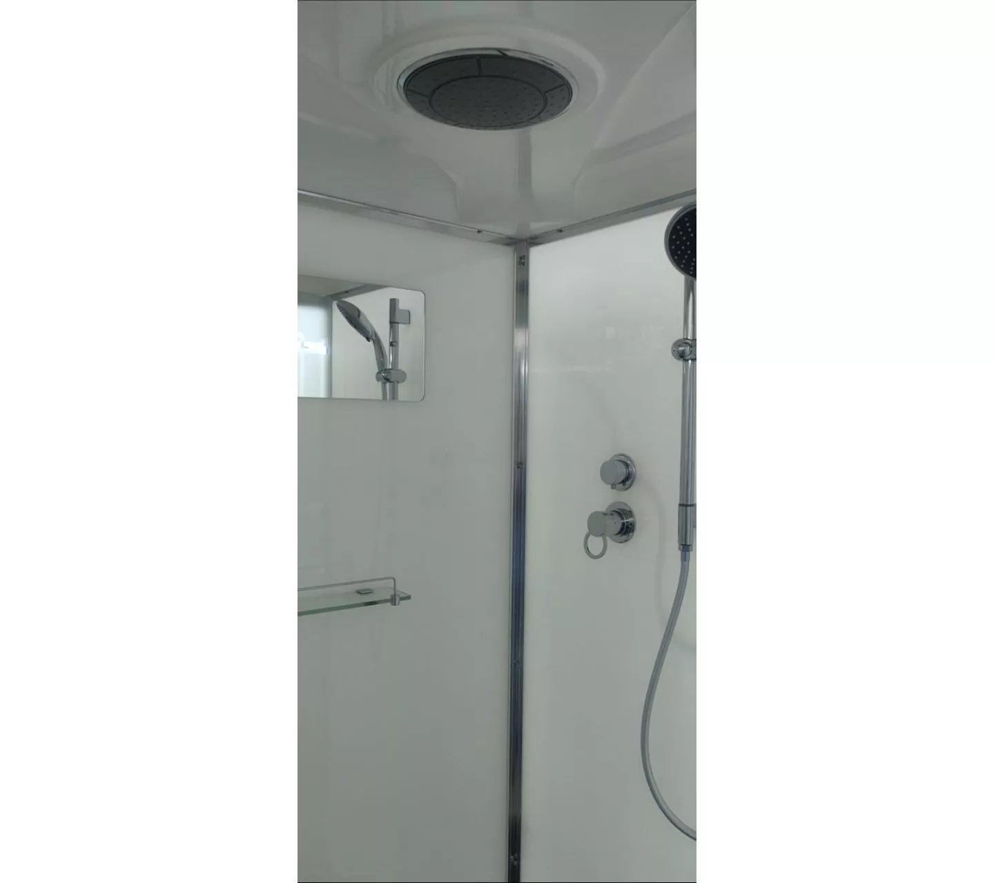 В комплекте сифон, полочка, зеркало, смеситель, переключатель режимов, душевой гарнитур, деревянная вставка в поддон,