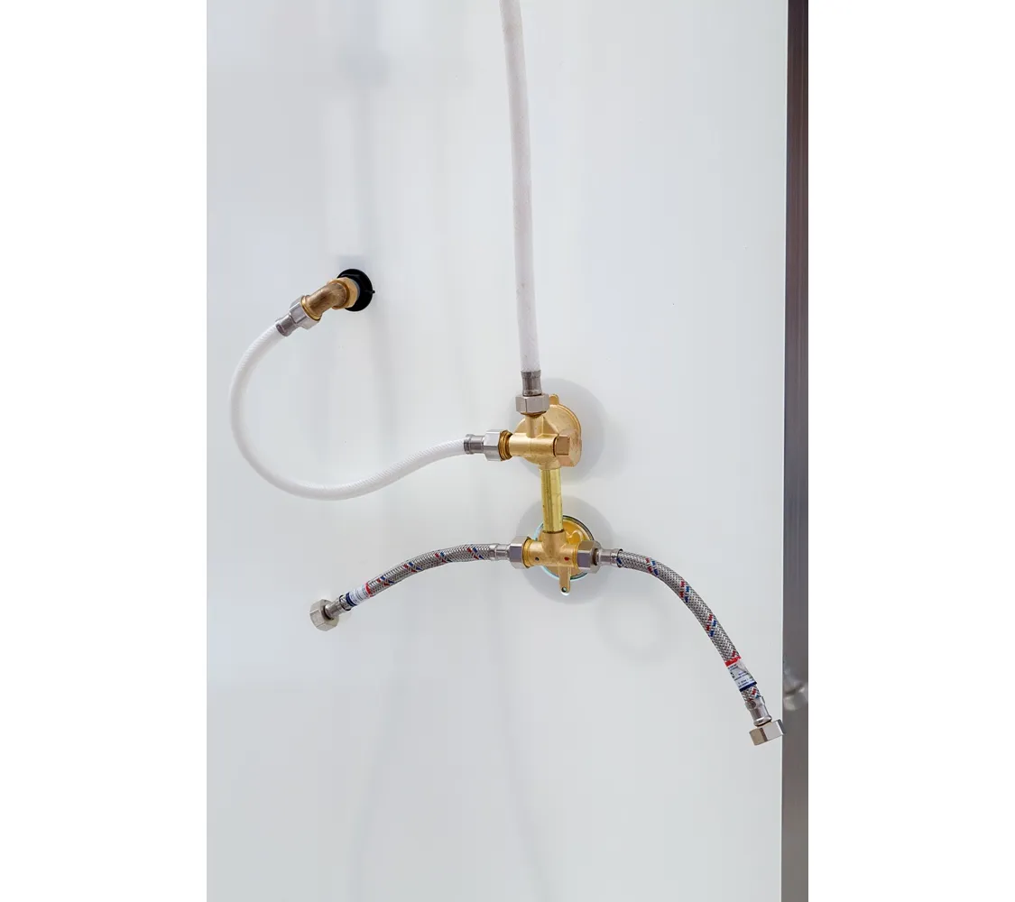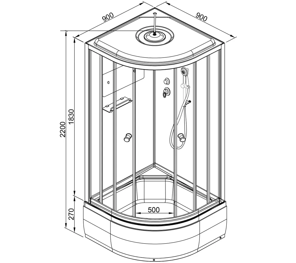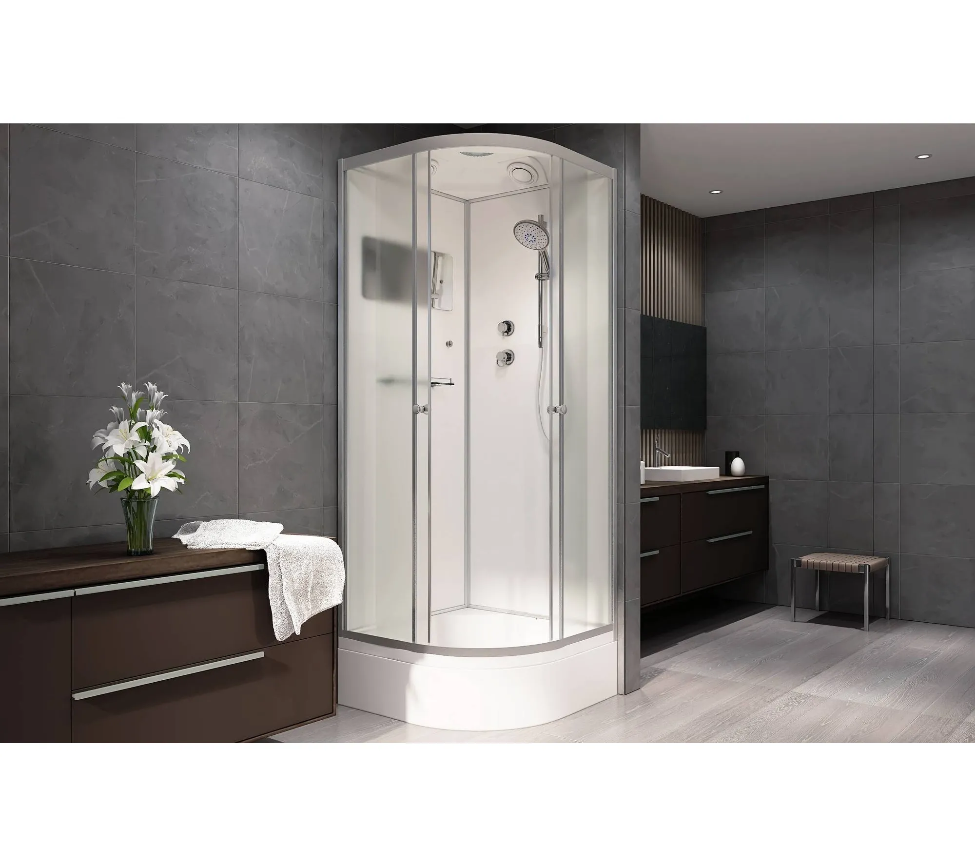 В комплекте сифон, полочка, зеркало, смеситель, переключатель режимов, передний съемный экран, душевой гарнитур,вентиляция
