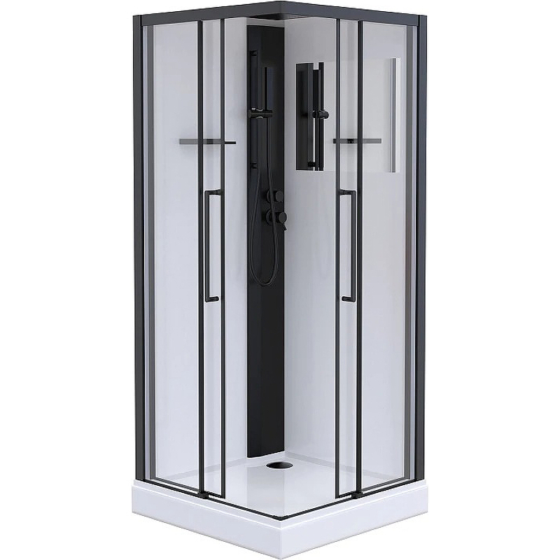 Кабина квадратная ESBANO ESM-90CKR-низкий (12,5 см) акриловый поддон со съёмным экраном-сифон с гидрозатвором-задние стенки: "супербелое" крашенное стекло (5мм), покрытое защитной плёнкой-передние стекла: закаленное прозрачное стекло (5 мм) с покрытием Easy Clean-крыша: "супербелое" крашенное стекло (6мм), покрытое защитной плёнкой.-профиль чёрный матовый из алюминия-смеситель в цвет профиля-душевая лейка в цвет профиля-тропический душ из нержавеющей стали в цвет профиля.-штанга и ругулируемый по наклону держатель лейки в цвет профиля-интегрированное в заднюю панель зеркало (размер: 62х50 см)-полочка для шампуня чёрного цвета (ПВХ)- верхние ролики: двойные (спаренные) - снизу блок скольженияРАЗМЕР: 90 х 90 х 215