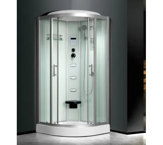 Кабина изготовлена из высококачественных материалов, таких как: санитарно-технический акрил, высокопрочный алюминий и закаленные ударопрочные стекла, толщиной 6 мм. Плавность хода дверей гарантируют, 8 двойных металлических роликов, а их равномерное примыкание к друг другу - вертикальные магнитные уплотнители.Поддон кабины усилен металлическим каркасом на регулируемых опорах и выдерживает нагрузку до 300 кг. На стенках и центральной стойке, расположились: переключатель и смеситель с керамическим картриджем, сенсерный пульт управления, ручная лейка с самоочищающимися резиновыми джетами, три форсунки гидромассажа, зеркало, сидение в поддоне и просторная полочка для шампуней и гелей. А на крыше, нашёл себе место, широкий тропический душ, диодная лампа, вентилятор и динамик под FM радио.